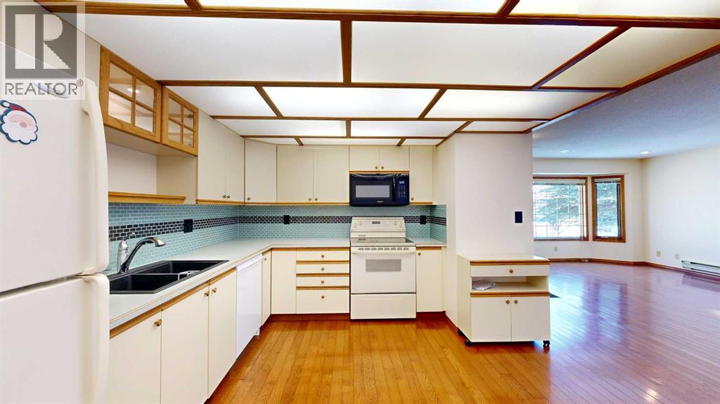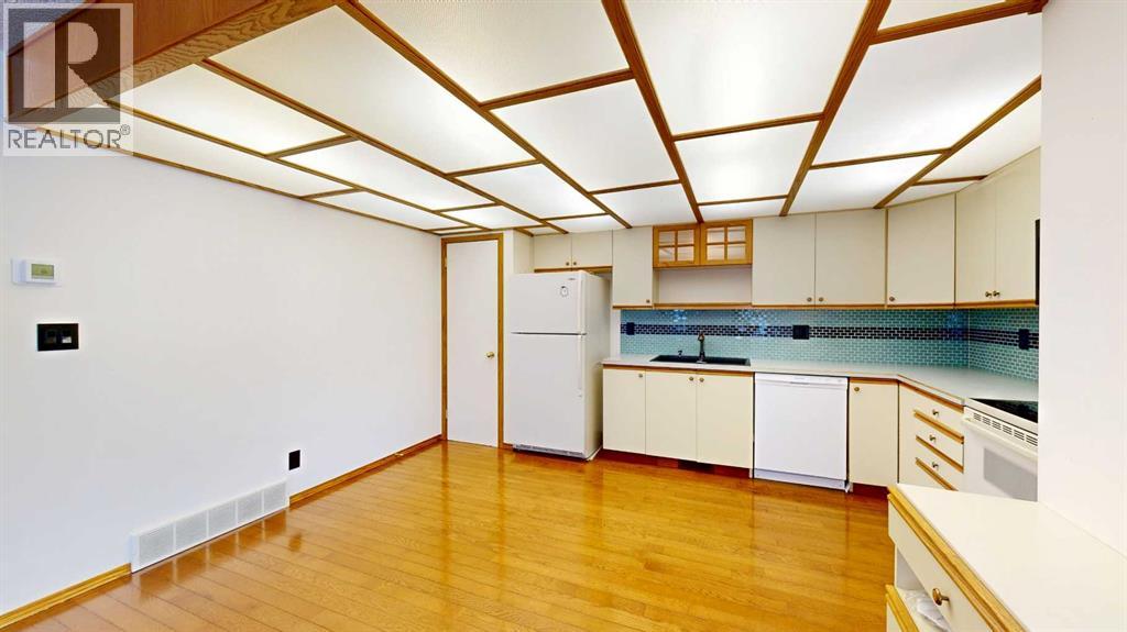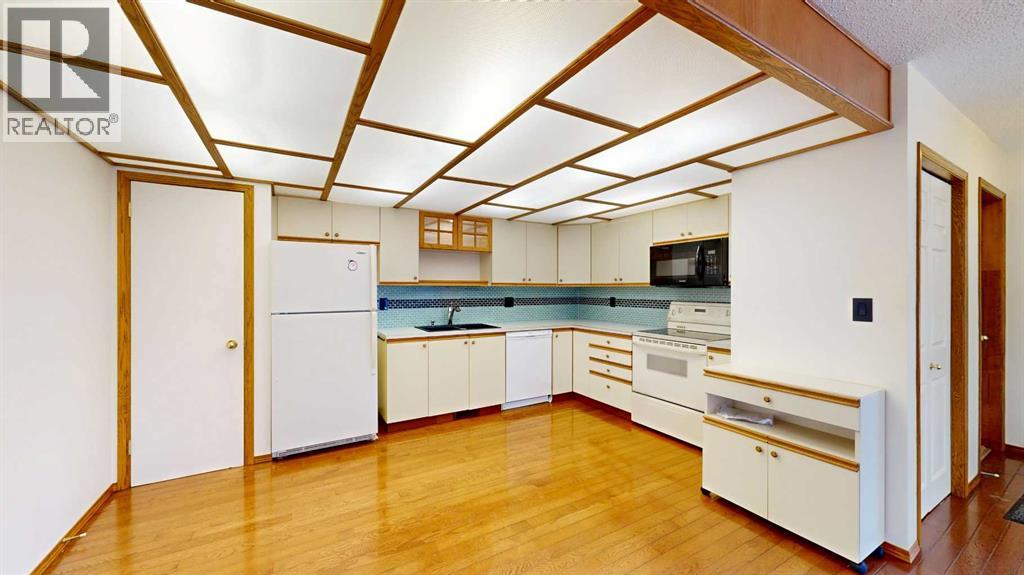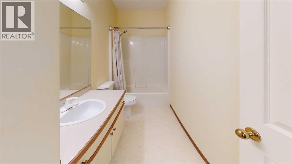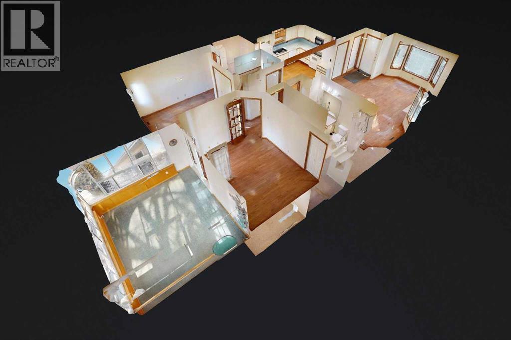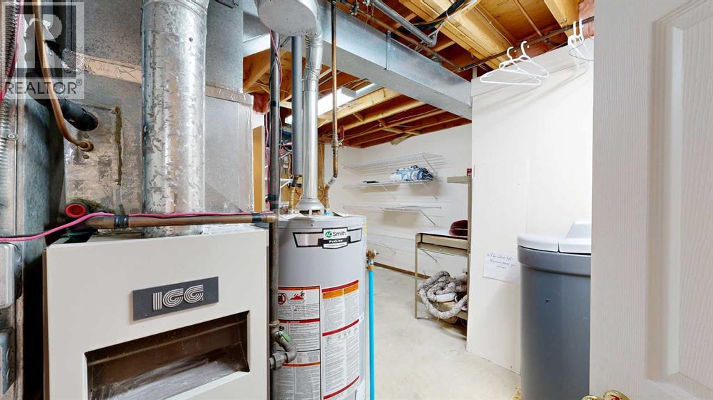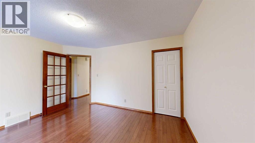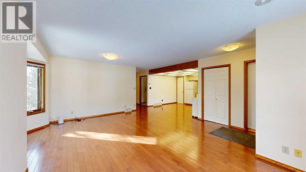 Welcome to this bright and inviting half duplex, featuring beautiful oak hardwood flooring along with matching oak baseboards and trim throughout the main level. The spacious living room greets you with charming bay windows and flows seamlessly into the open-concept kitchen, complete with white cabinetry, a convenient pantry, and ample space for a dining table. The large primary bedroom offers a private 2-piece ensuite, while the second bedroom provides access to a west-facing sunroom with shades and a door leading to the backyard — the perfect spot to enjoy afternoon sunshine. A bright 4-piece bathroom and a dedicated main floor laundry room with built-in cabinetry add everyday convenience. Downstairs, the fully developed basement is bright and welcoming, featuring a generous family room with a unique wall niche at the base of the stairs. This level also includes an additional bedroom, a den with French doors, a 3-piece bathroom with shower, and a spacious utility room with shelving and plenty of storage space. Additional highlights include central vacuum, central air, and a single attached garage. Outside, the front yard features a mature shade tree and faces a large greenspace, offering an open and pleasant view. The partially fenced backyard includes a garden shed and is enhanced by trees and shrubs that provide privacy and shade. Ideally located on a quiet street just a few blocks from the south edge of Stettler, this home also offers the added convenience of a nearby playground. A wonderful opportunity offering comfort, functionality, and a great location! (id:63190)