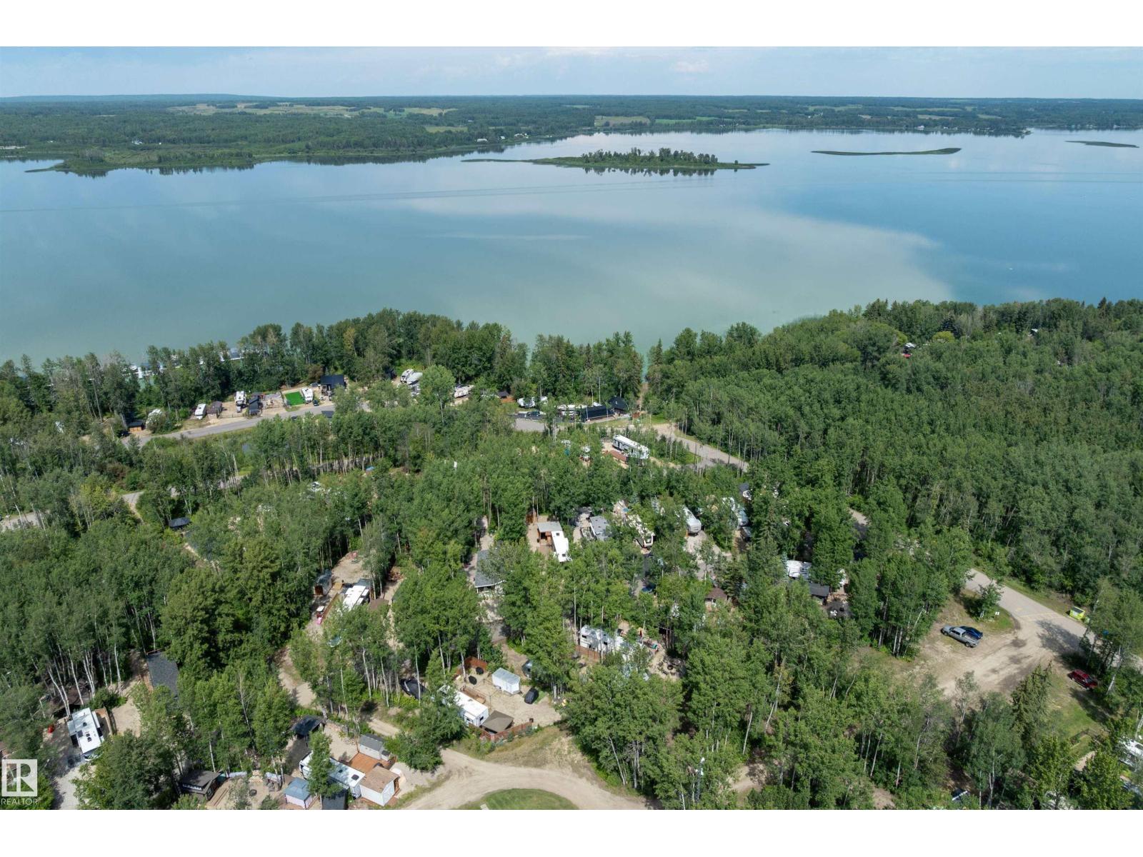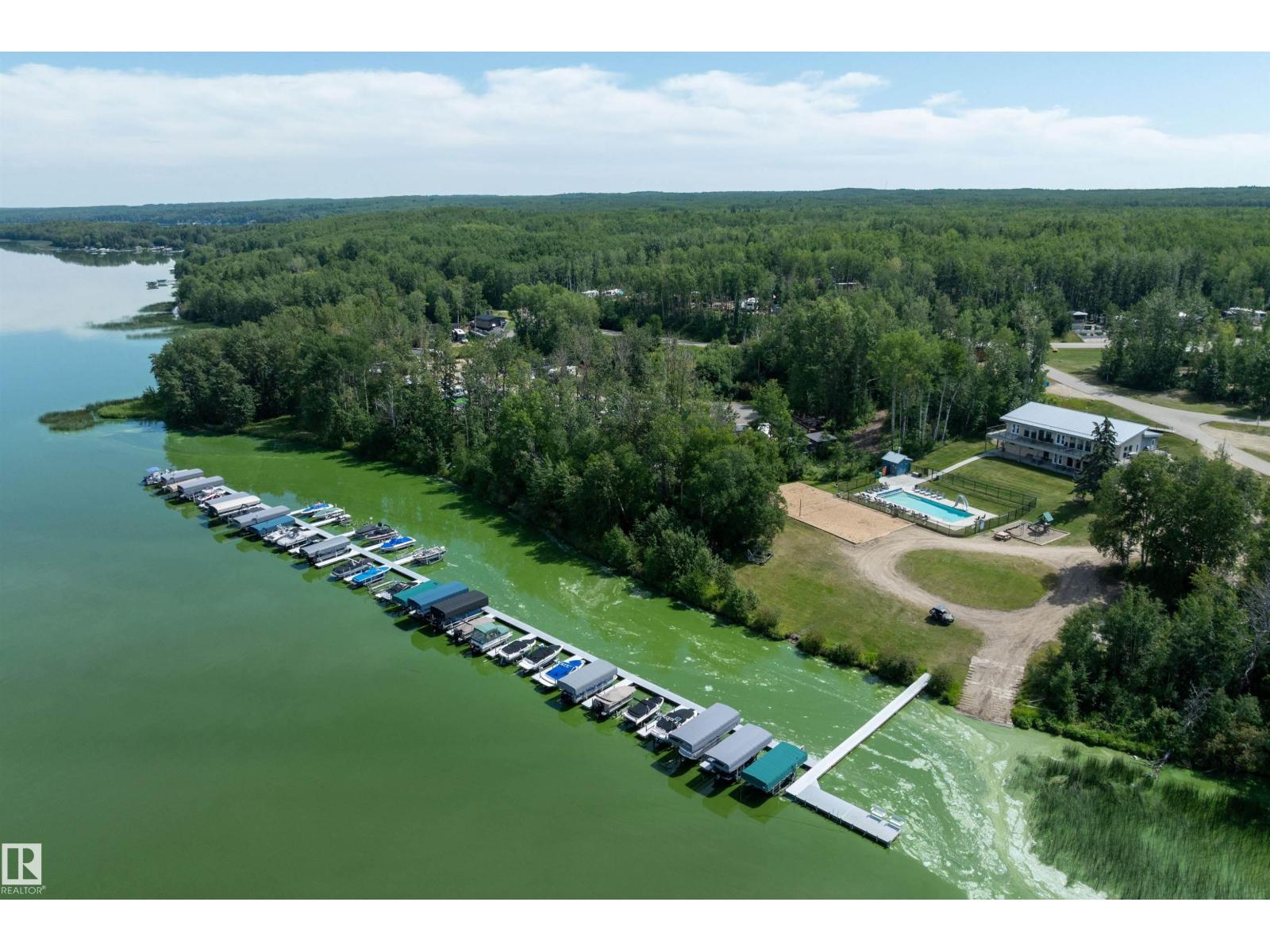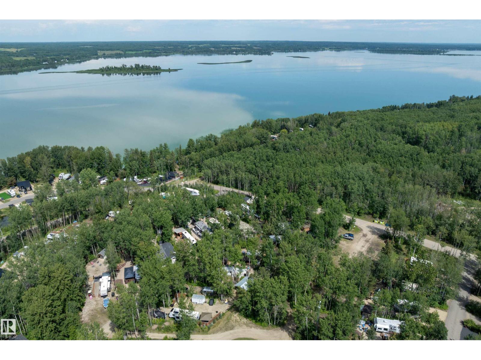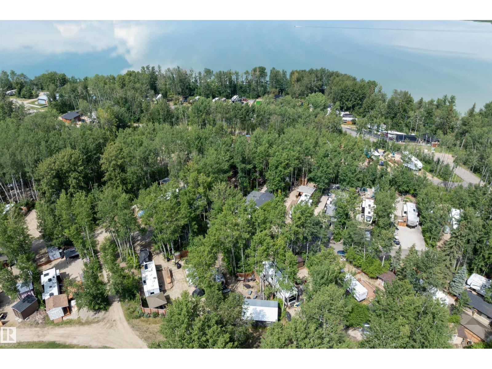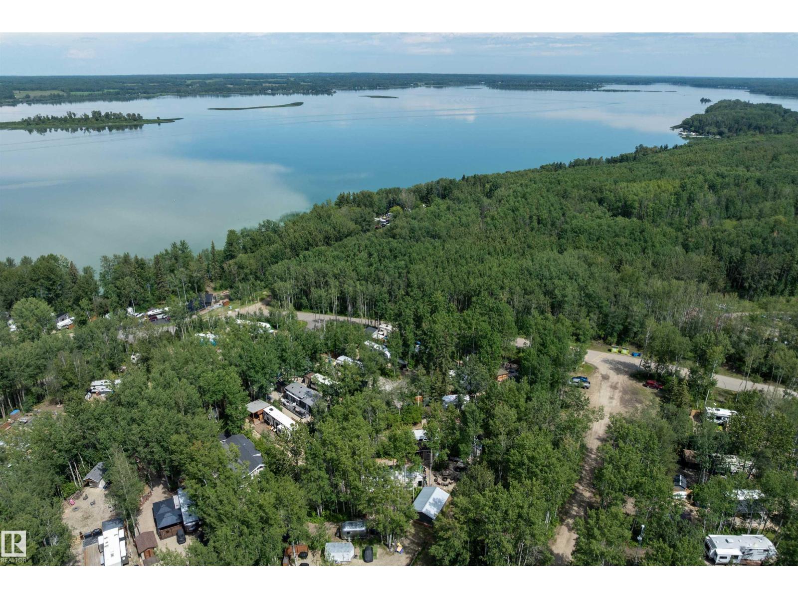 LAKE LOT at Sunset Shores RV Resort. Enjoy lake life at this beautiful community. Park your RV all year round nestled in the trees with a 14 x 20 bunkhouse- perfect for guests. Firepit area, fenced with flower beds and privacy. The lakefront year round community feature municipal water, sewer and power. There are paved roads throughout, clubhouse with a heated pool. Enjoy the gym, laundry, showers, public dock, private boat slips and boat launch. There are pickle ball courts, tennis and basketball courts. Trail system for beautiful nature walks. Easy commute back to Edmonton in 45 mins. (id:63190)