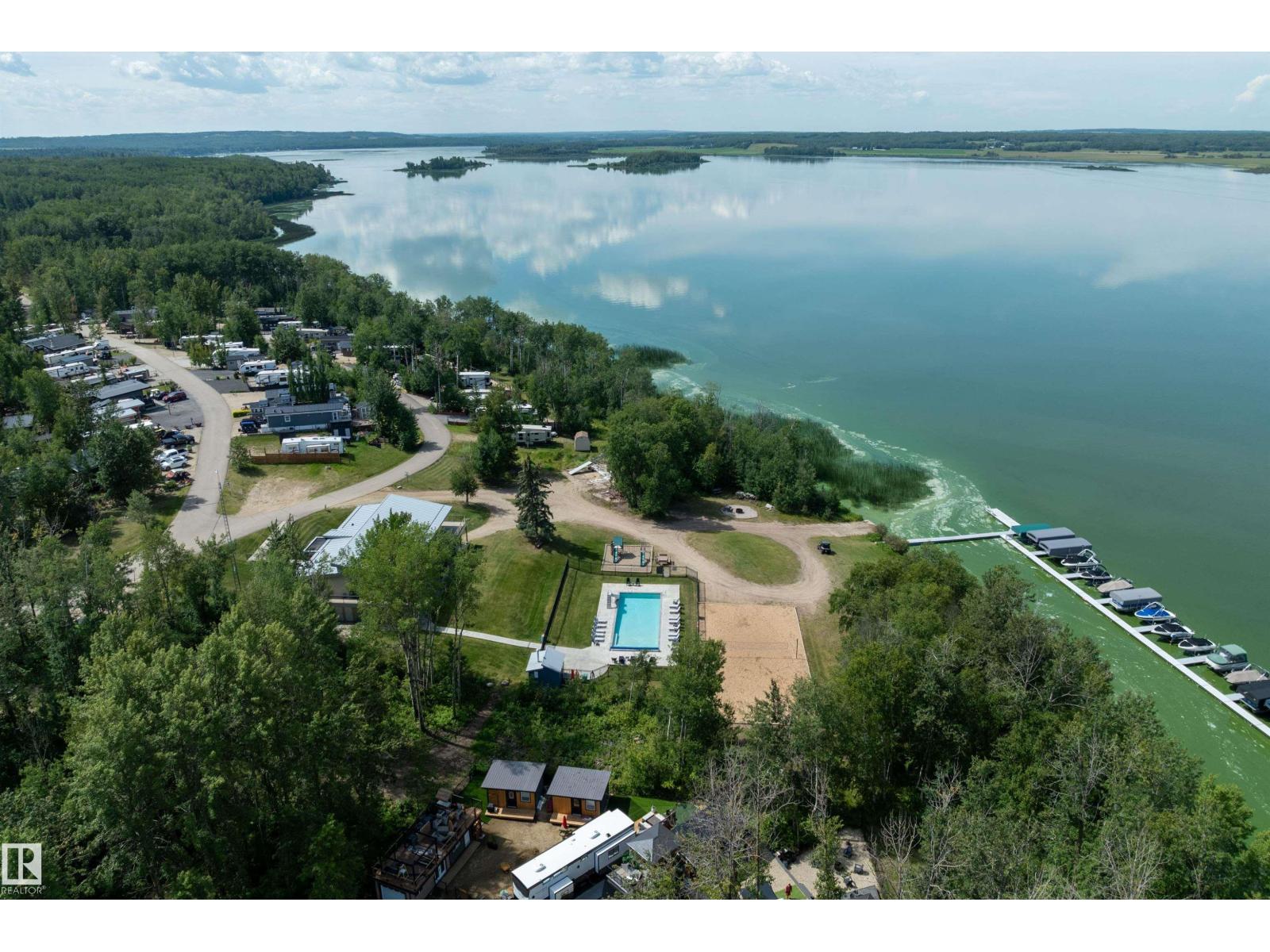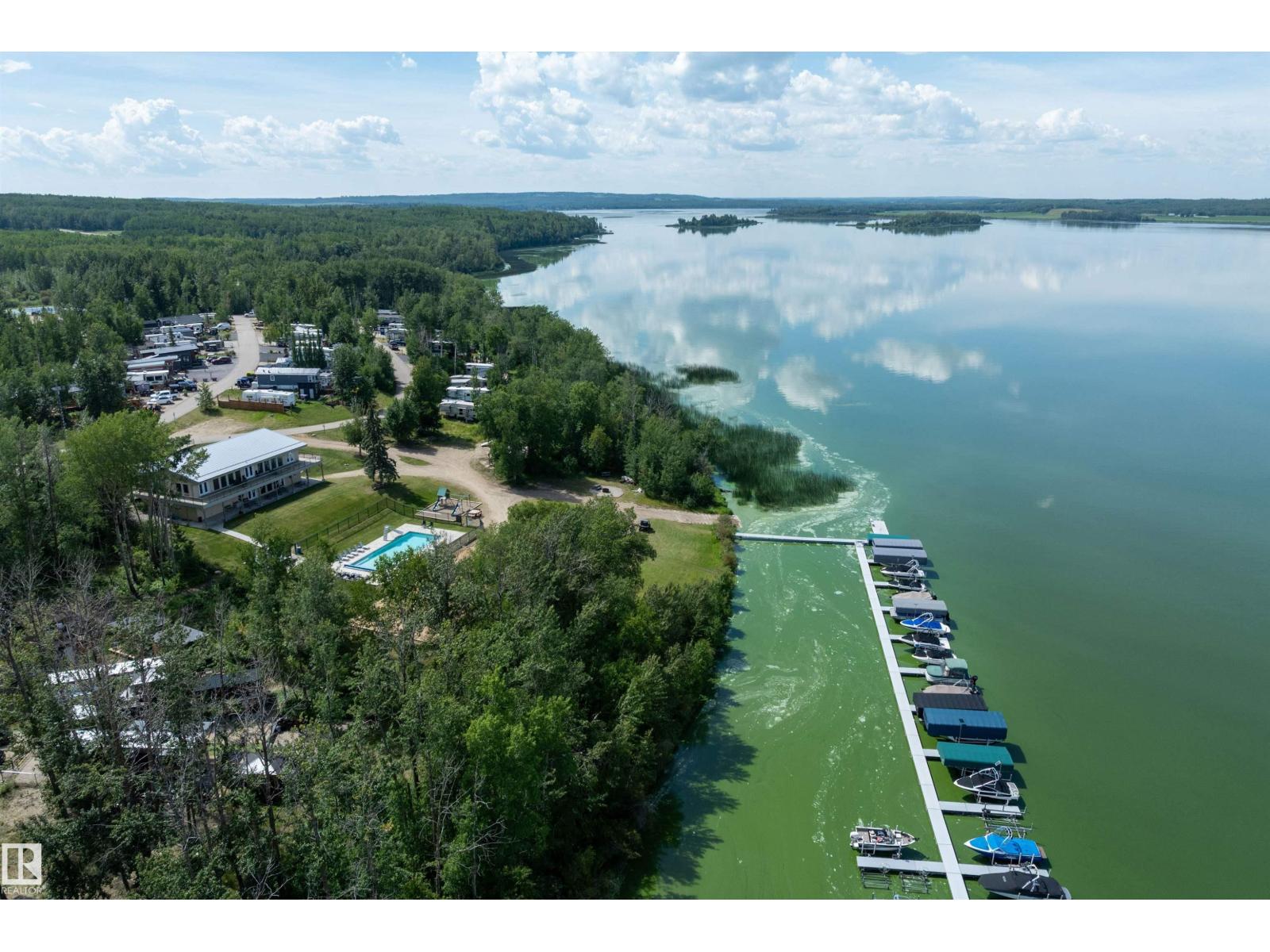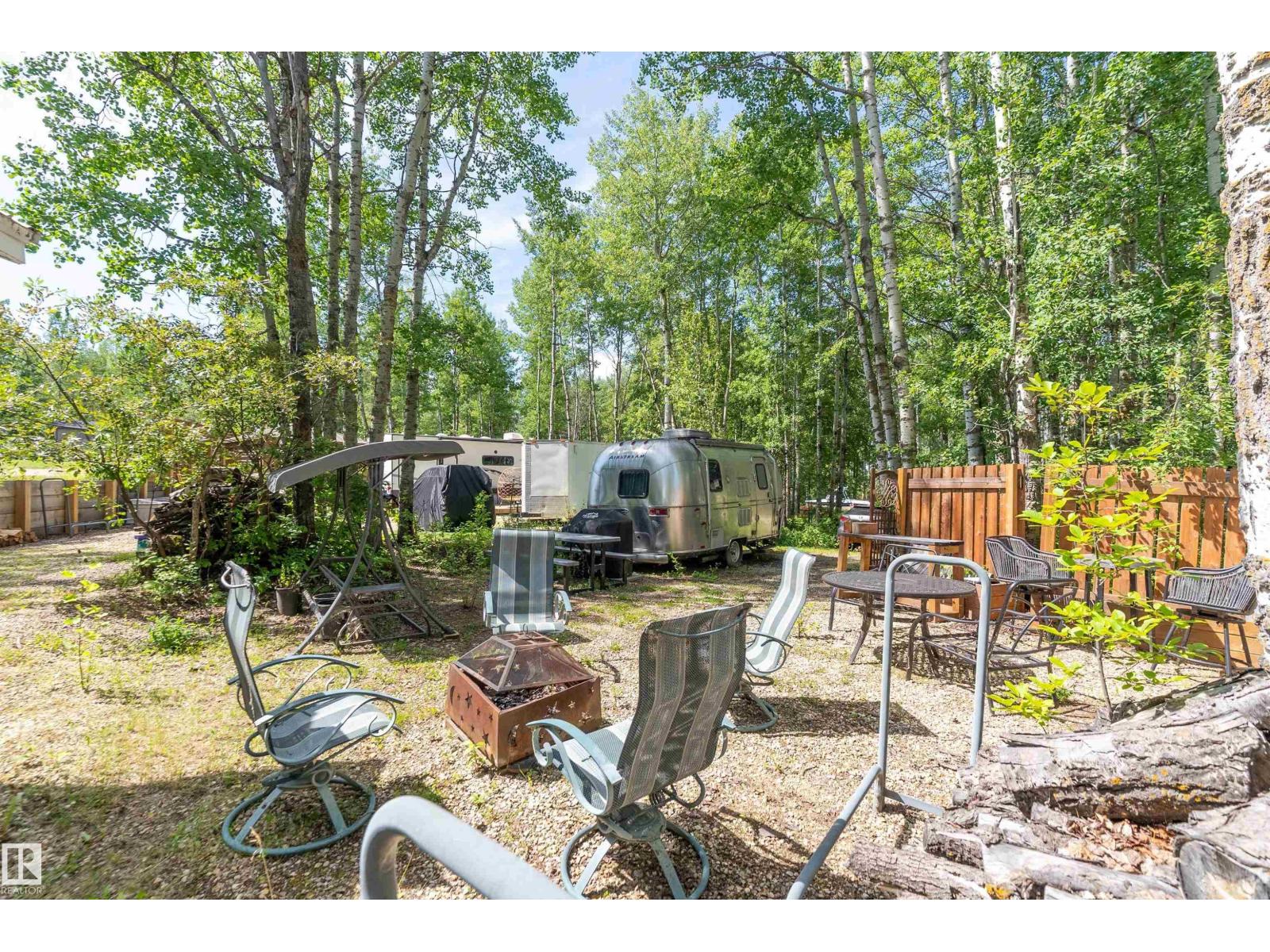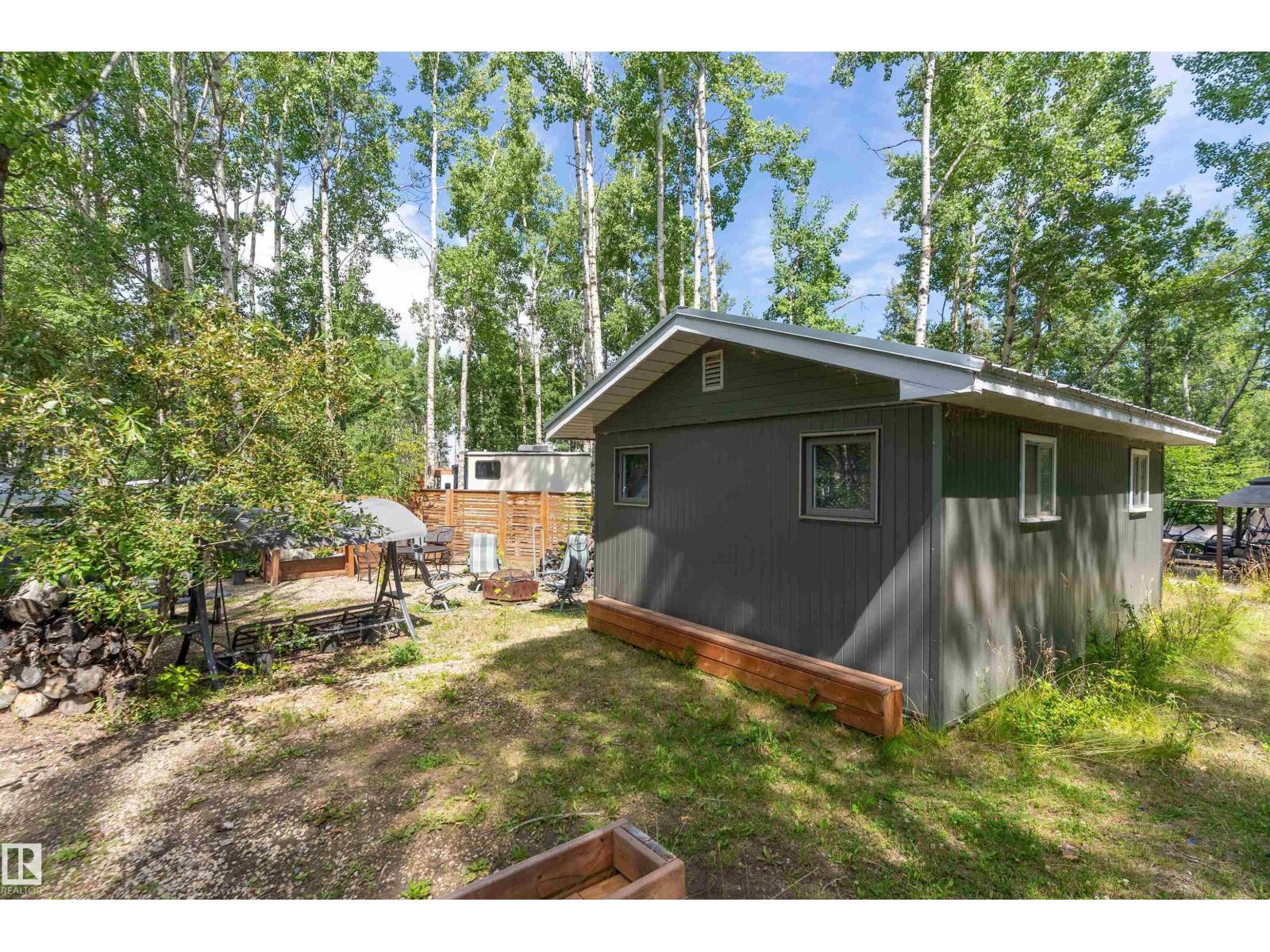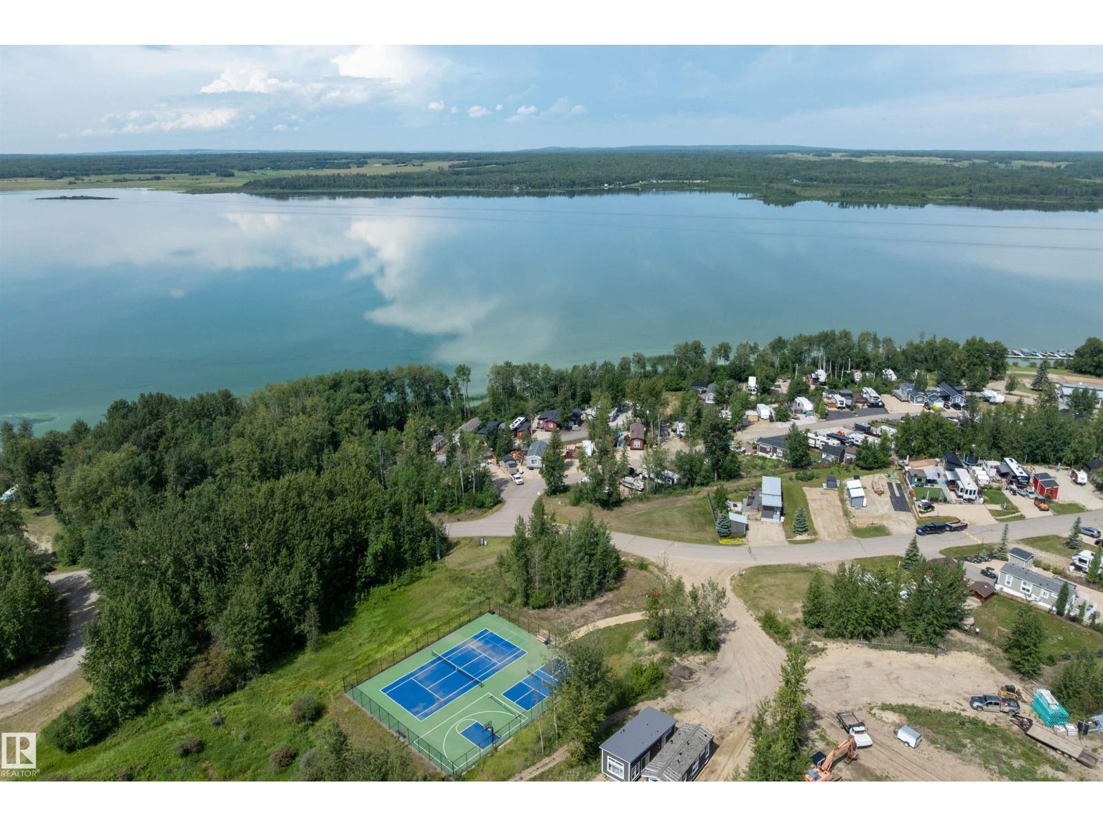 LAKE LOT at Sunset Shores RV Resort. Enjoy lake life at this beautiful community. Park your RV all year round nestled in the trees with a 14 x 20 bunkhouse- perfect for guests. Firepit area, fenced with flower beds and privacy. The lakefront year round community feature municipal water, sewer and power. There are paved roads throughout, clubhouse with a heated pool. Enjoy the gym, laundry, showers, public dock, private boat slips and boat launch. There are pickle ball courts, tennis and basketball courts. Trail system for beautiful nature walks. Easy commute back to Edmonton in 45 mins. (id:63190)
