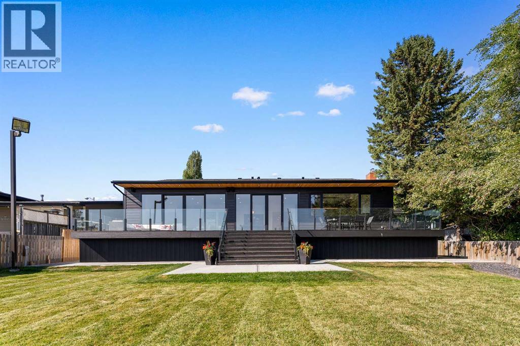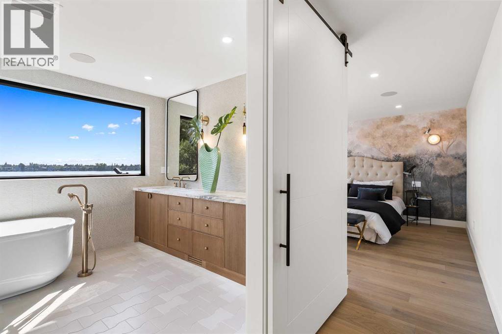 *Welcome to Lakeside Luxury on Chestermere Lake* With 4,482 sq. ft. of fully reimagined living space, this lakefront estate blends architectural sophistication with modern comfort on one of Chestermere Lake’s most exclusive stretches of shoreline. This complete renovation and design is an intricate remodel + extension, showcasing soaring 10’ ceilings, bespoke finishes, and walls of glass that capture sweeping water views. The foyer, framed by a 4 ft. Lux custom glass door, makes a bold first impression with a glass~encased home office and a see~through fireplace leading into the stunning living room. Floor~to~ceiling windows and European sliding doors create seamless flow to the outdoors, where a massive backyard, fire pit, and private dock invite year~round entertaining. At the heart of the home, the chef’s kitchen is a masterpiece ~ anchored by a Taj Mahal quartzite island, complemented by JennAir appliances, a butler’s pantry, and a limewashed plaster custom hood fan that compliments the natural stone backsplash. Brizo plumbing fixtures in champagne bronze + matte black, Lo & Co + Emtek hardware; and custom~designed lighting elevate every detail, while white oak cabinets and hardwood floors add warmth and texture throughout the home. A spacious mudroom that rivals the aesthetic of any competing luxury home, leads to the 4~car garage with a tucked~away workshop. The garage floor was transformed with a stunning, heated, metallic epoxy finish, providing both beauty and durability. LED sensors throughout the home create an unrivalled nighttime ambiance, and an exposed epoxy rear deck extends the entertaining space. Upstairs, a vaulted bonus room with the home’s original fireplace nods to its heritage, while a dual~desk workstation in the hallway adds functional elegance. Two secondary bedrooms and two larger master waterfront retreats capture lakeside serenity perfectly. The primary suite is pure indulgence, featuring a spa inspired ensuite with a steam shower, heate d bench and floors, which flows seamlessly to a massive walk in closet with micro~shaker drawers and velvet encasements. Even the laundry room makes a statement, with classic black and white checkered flooring adding a charming and whimsical touch to this architectural marvel. This is more than a home ~ it’s a statement in design, craftsmanship, and lakefront living. (id:63190)