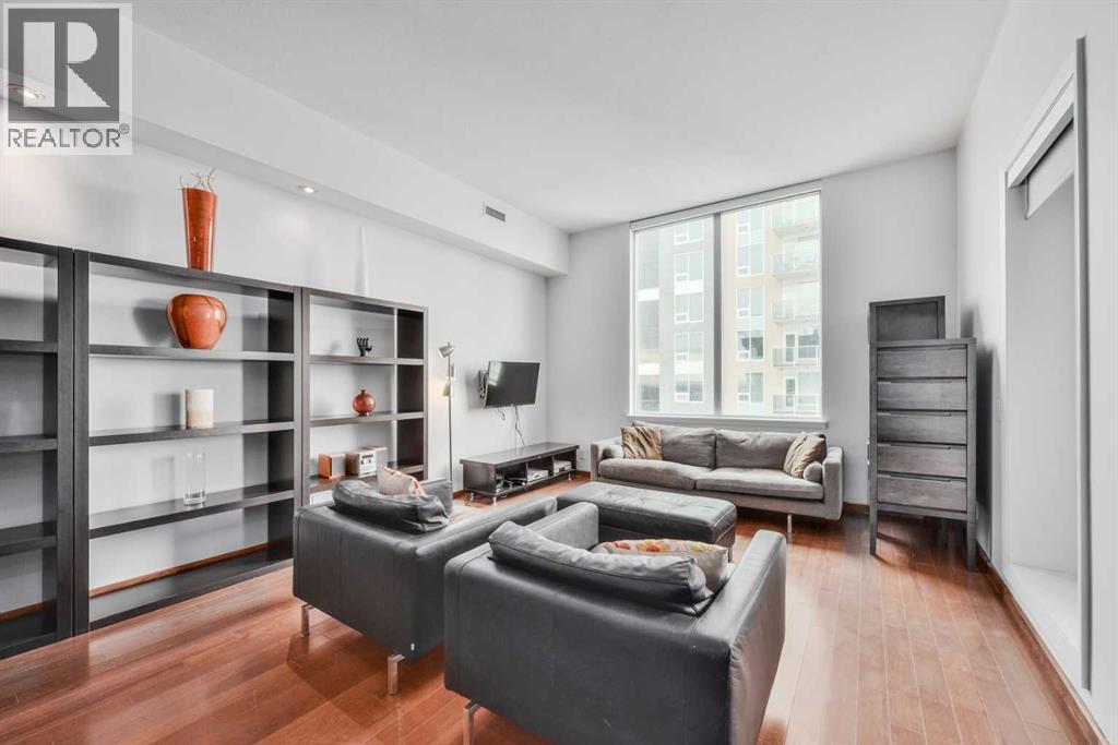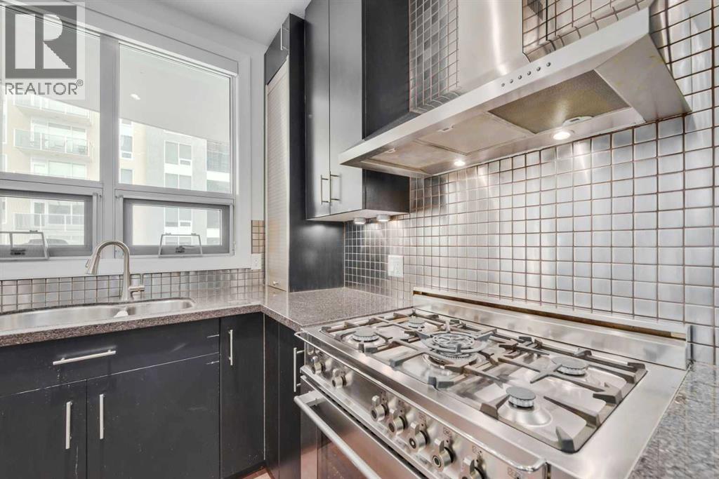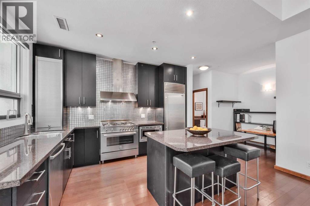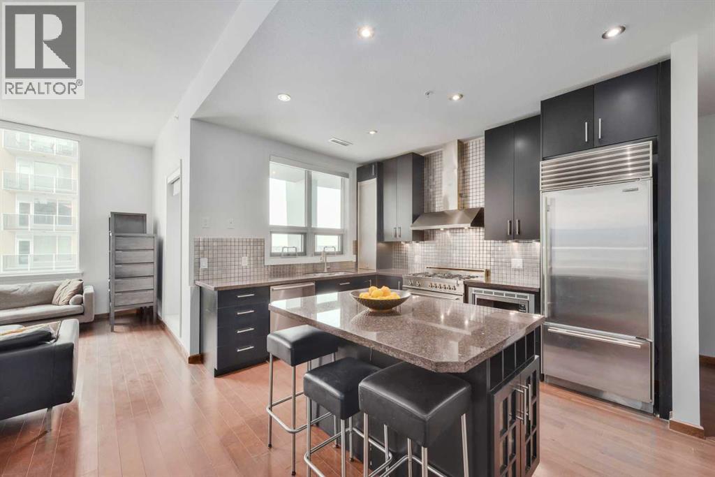 Incredible value and a rare opportunity! One of only two units of this kind in the entire building, this stunning sub-penthouse offers next-level condo living with spectacular downtown Calgary and Victoria Park views.This expansive 1-bedroom, 2-bath residence is meticulously maintained and features 11-foot ceilings, creating a bright and airy atmosphere throughout. The open-concept layout is centered around a fully upgraded chef’s kitchen complete with a Bertazzoni gas range, Sub-Zero refrigerator, granite countertops, and a large standalone island—perfect for entertaining.Gleaming hardwood floors extend throughout the living areas, complemented by tile in the bathrooms and laundry room. The spacious primary bedroom easily accommodates a king-sized bed and features a spa-inspired ensuite with separate shower and relaxing jetted tub.Enjoy incredible city views from the 200+ sq.ft. private balcony, ideal for morning coffee or evening relaxation. Additional highlights include a flex/office area, in-suite laundry with storage, and two titled heated underground parking stalls on P1. An assigned storage locker on the main level provides even more convenience.Residents of SASSO enjoy exceptional amenities including a fitness centre, hot tub, steam room, games lounge with bar, theatre room, and concierge service.Perfectly located just steps from the C-Train station, Sunterra Market, Shoppers Drug Mart, the Saddledome and of course new events centre, Stampede Grounds, 17th Avenue, the Elbow River pathways, and the MNP Community & Sprots Centre, this home offers the ultimate combination of luxury, lifestyle, and convenience in the heart of Calgary. (id:63190)