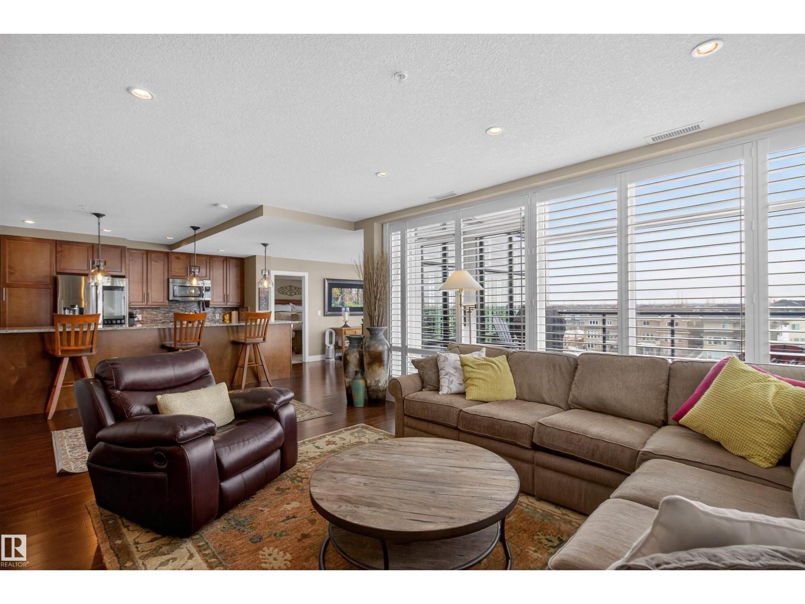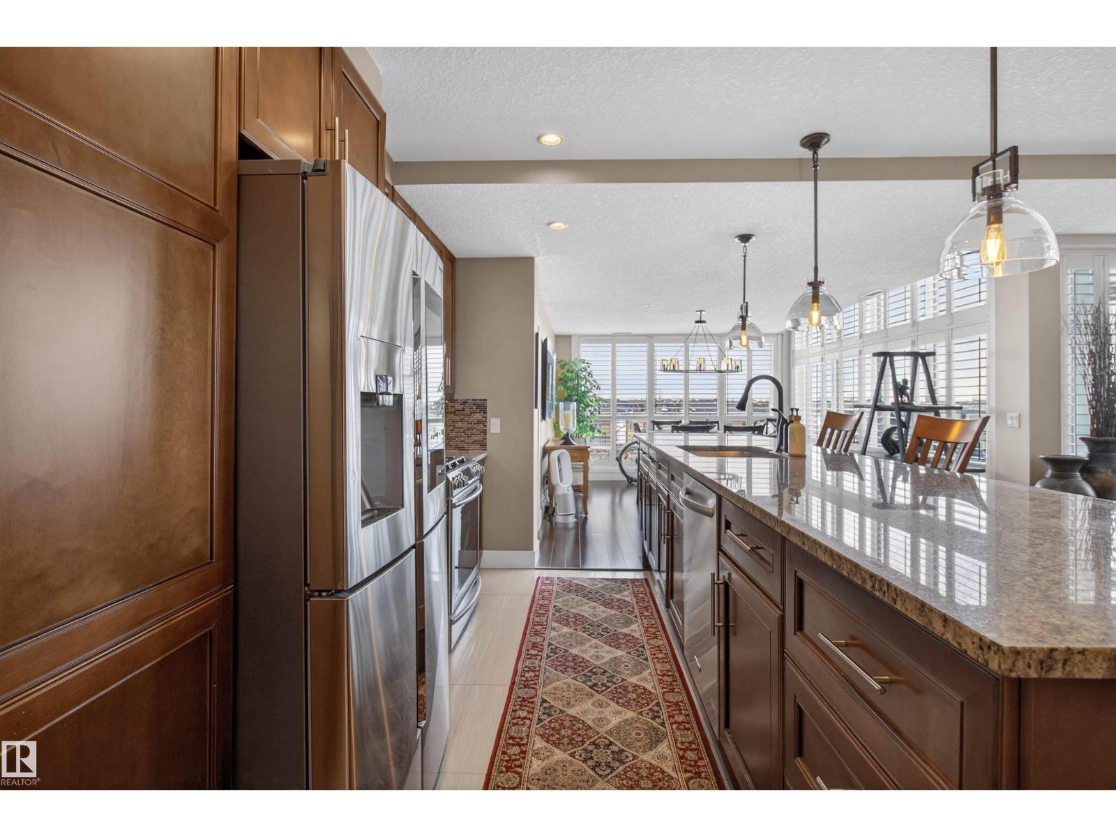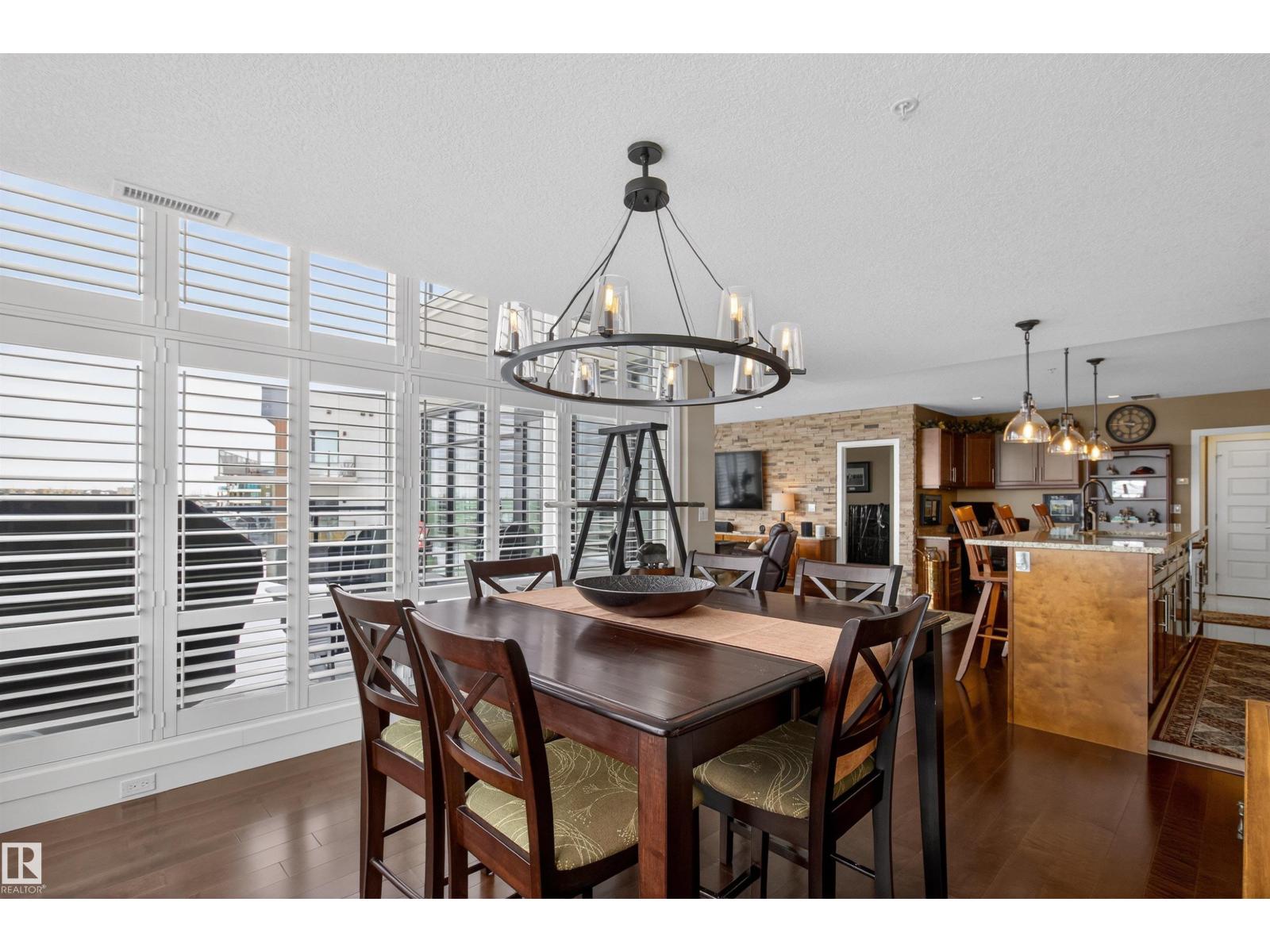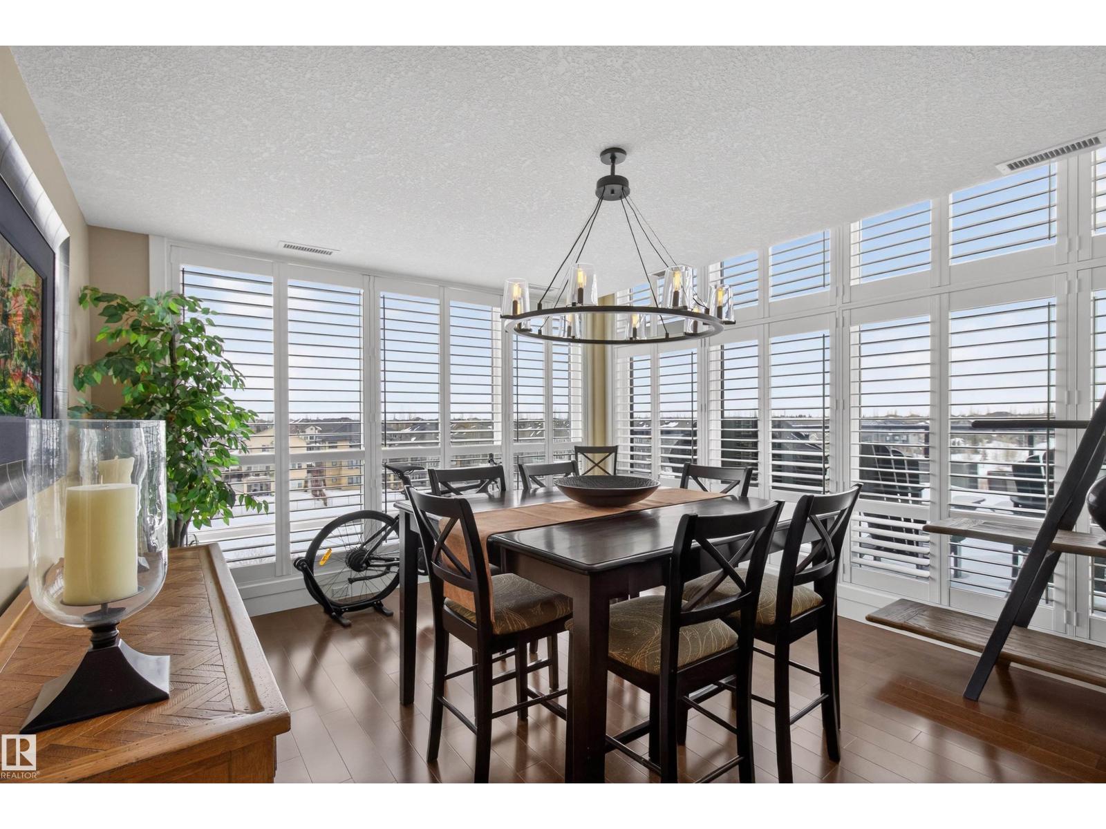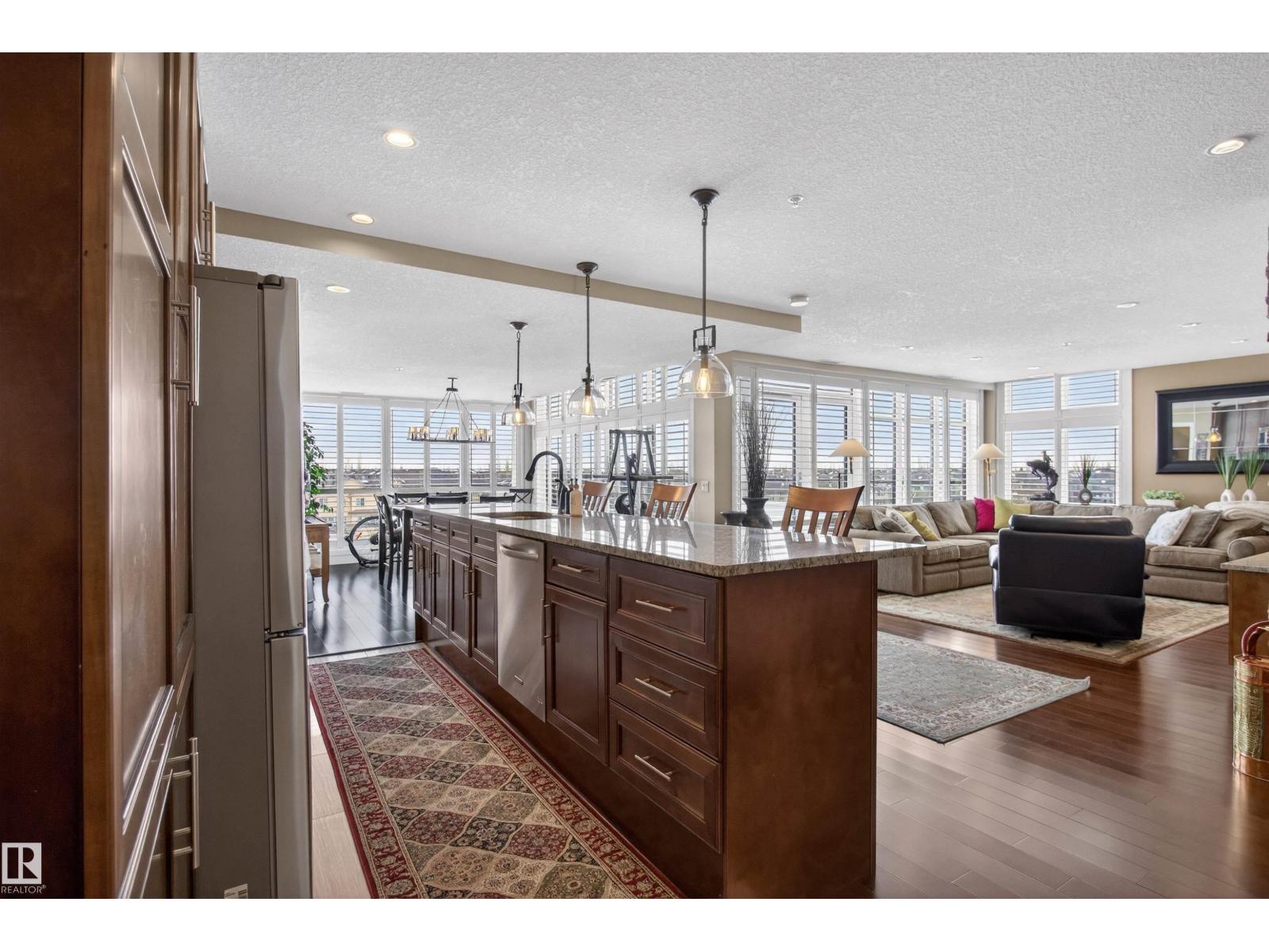 Welcome to the top-floor corner unit offering incredible natural light & beautiful pond views. Open-concept layout features spacious kitchen w/upgraded cabinetry, granite countertops, upgraded appliances, pantry, and a large custom island. Between the kitchen & living room you’ll find a built-in desk with cabinetry, ideal for a home office. Living room showcases hardwood flooring, custom cabinetry & stone feature wall, & a wall of windows that fill the space with sunlight. Step onto your private balcony overlooking the pond. Large dining area, surrounded by windows on two sides, offers a bright space with scenic views. Primary bedroom features carpet, large window, & walk-through closet w/custom cabinetry leading to 5-pc ensuite w/spacious custom corner shower. Bedroom two is generously sized & located next to 4-pc main bathroom. Well-maintained, immaculate unit is in the beautiful Windermere community, with all amenities minutes away. Titled two parking stalls & storage room w/fridge & shelves included. (id:63190)