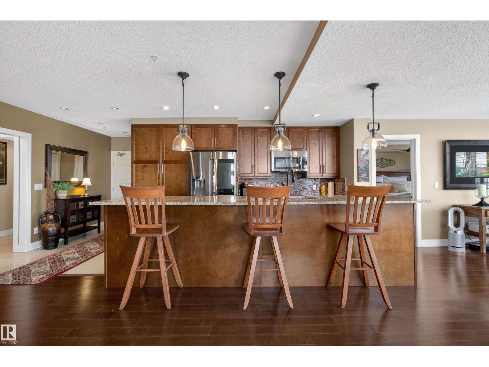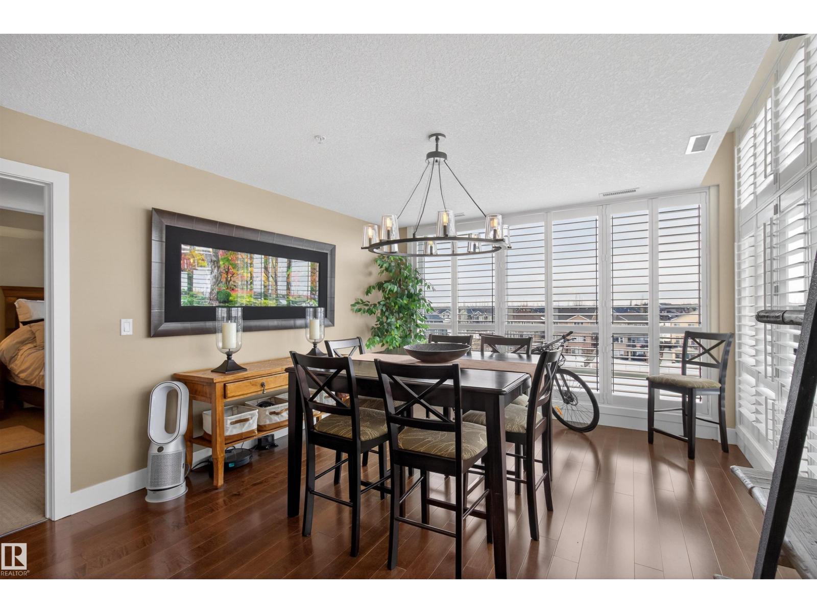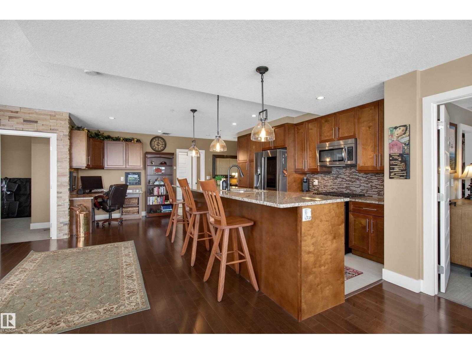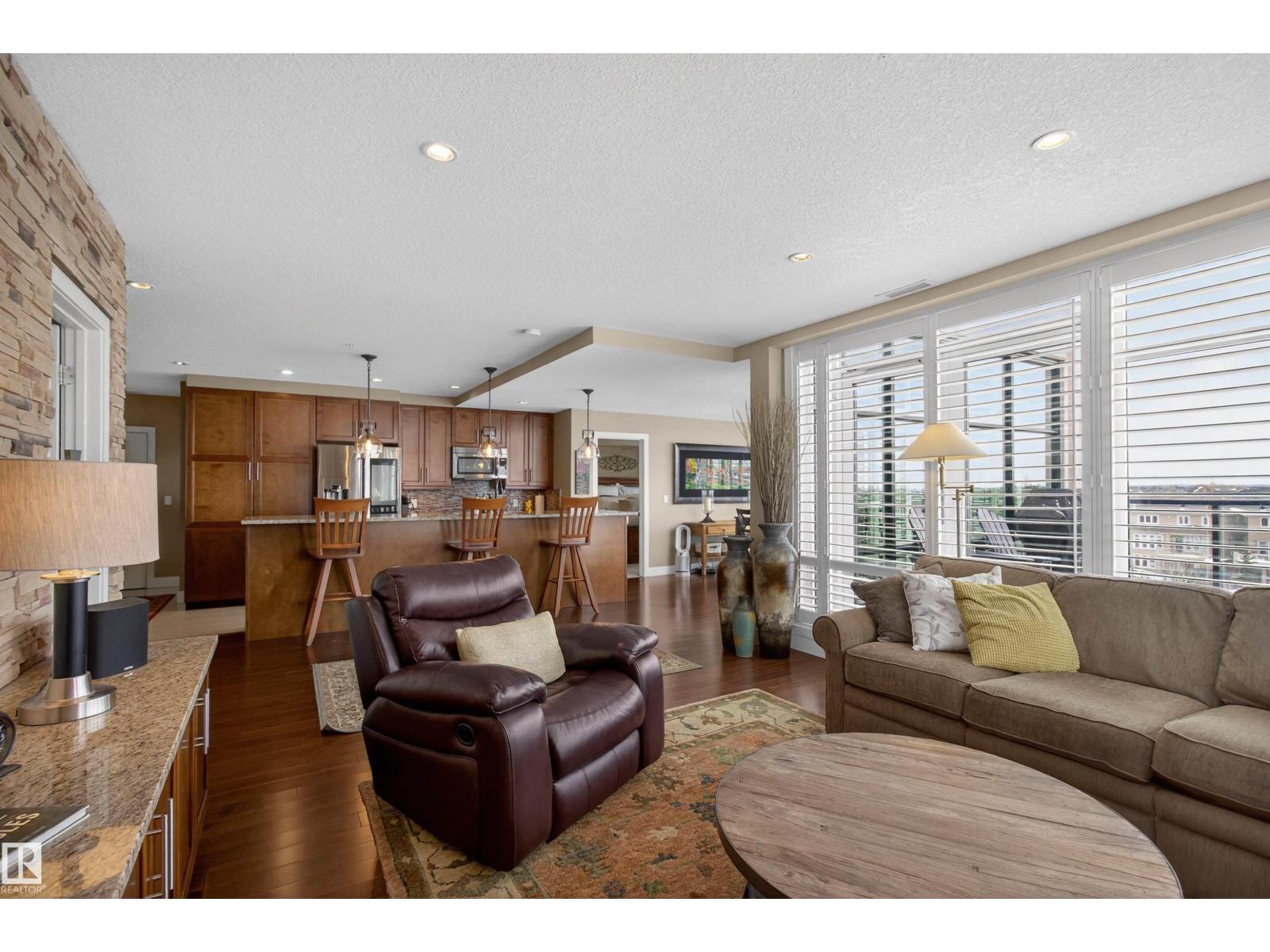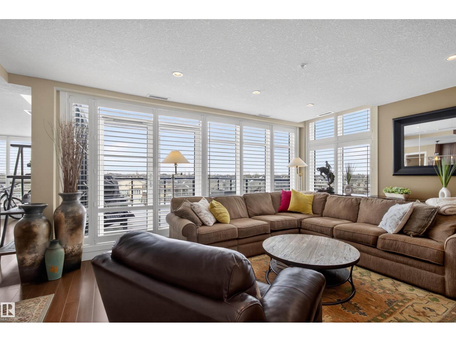 Welcome to the top-floor corner unit offering incredible natural light & beautiful pond views. Open-concept layout features spacious kitchen w/upgraded cabinetry, granite countertops, upgraded appliances, pantry, and a large custom island. Between the kitchen & living room you’ll find a built-in desk with cabinetry, ideal for a home office. Living room showcases hardwood flooring, custom cabinetry & stone feature wall, & a wall of windows that fill the space with sunlight. Step onto your private balcony overlooking the pond. Large dining area, surrounded by windows on two sides, offers a bright space with scenic views. Primary bedroom features carpet, large window, & walk-through closet w/custom cabinetry leading to 5-pc ensuite w/spacious custom corner shower. Bedroom two is generously sized & located next to 4-pc main bathroom. Well-maintained, immaculate unit is in the beautiful Windermere community, with all amenities minutes away. Titled two parking stalls & storage room w/fridge & shelves included. (id:63190)