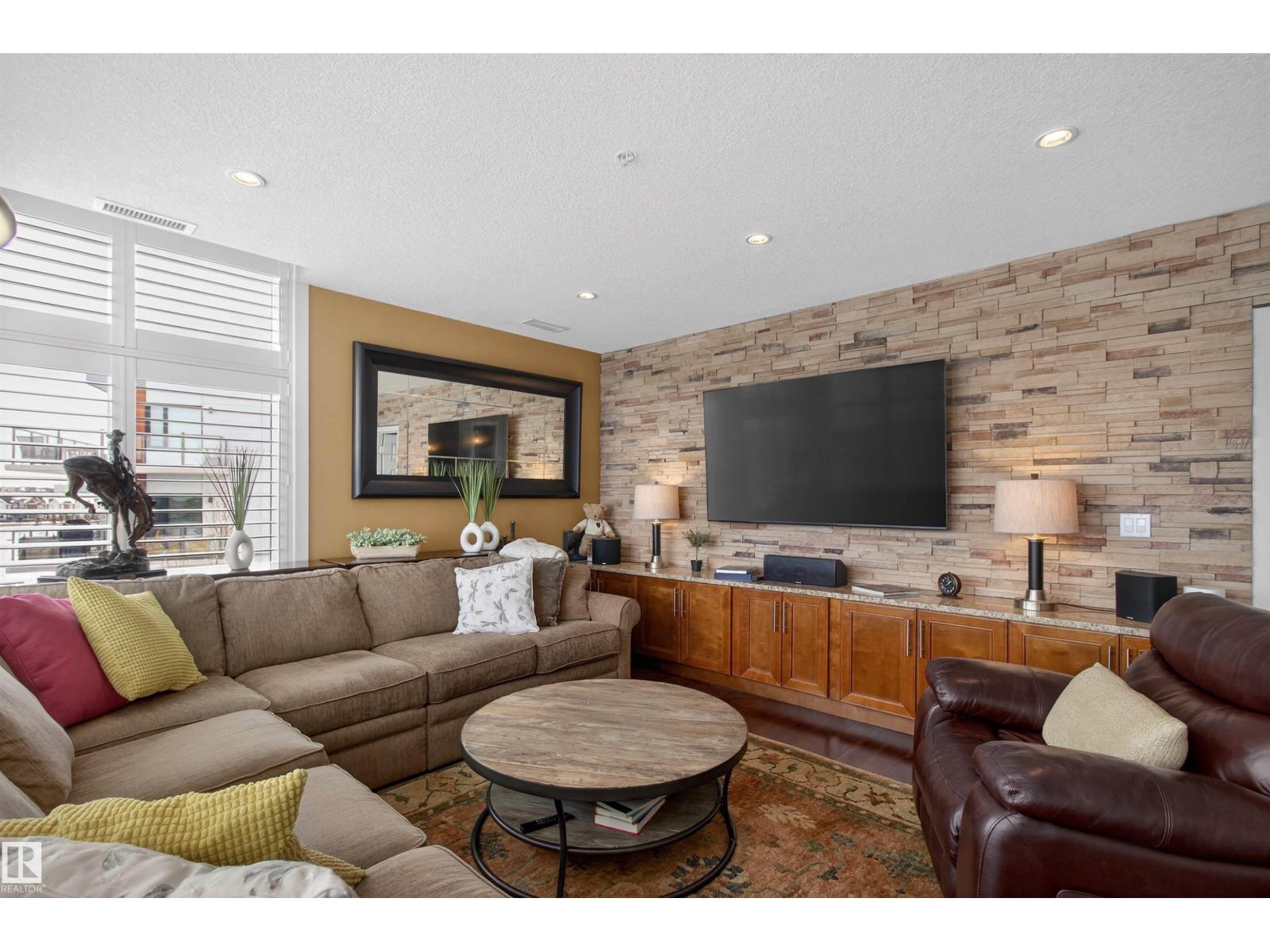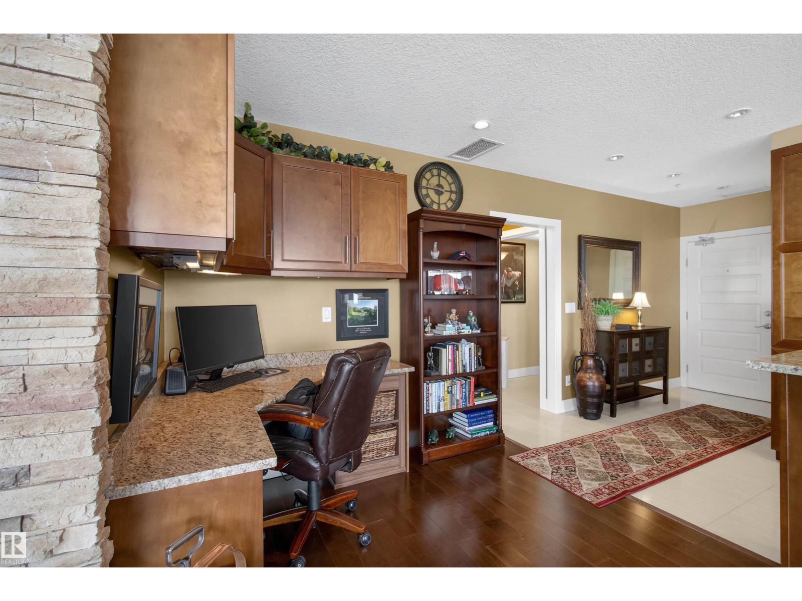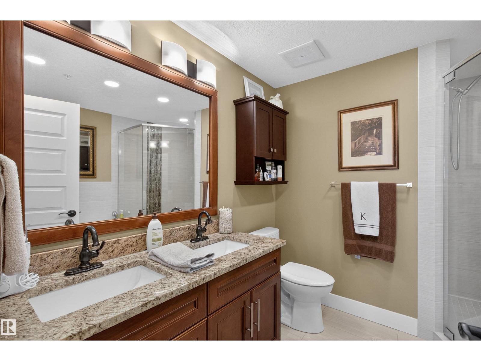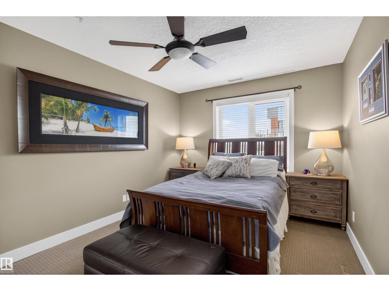 Welcome to the top-floor corner unit offering incredible natural light & beautiful pond views. Open-concept layout features spacious kitchen w/upgraded cabinetry, granite countertops, upgraded appliances, pantry, and a large custom island. Between the kitchen & living room you’ll find a built-in desk with cabinetry, ideal for a home office. Living room showcases hardwood flooring, custom cabinetry & stone feature wall, & a wall of windows that fill the space with sunlight. Step onto your private balcony overlooking the pond. Large dining area, surrounded by windows on two sides, offers a bright space with scenic views. Primary bedroom features carpet, large window, & walk-through closet w/custom cabinetry leading to 5-pc ensuite w/spacious custom corner shower. Bedroom two is generously sized & located next to 4-pc main bathroom. Well-maintained, immaculate unit is in the beautiful Windermere community, with all amenities minutes away. Titled two parking stalls & storage room w/fridge & shelves included. (id:63190)