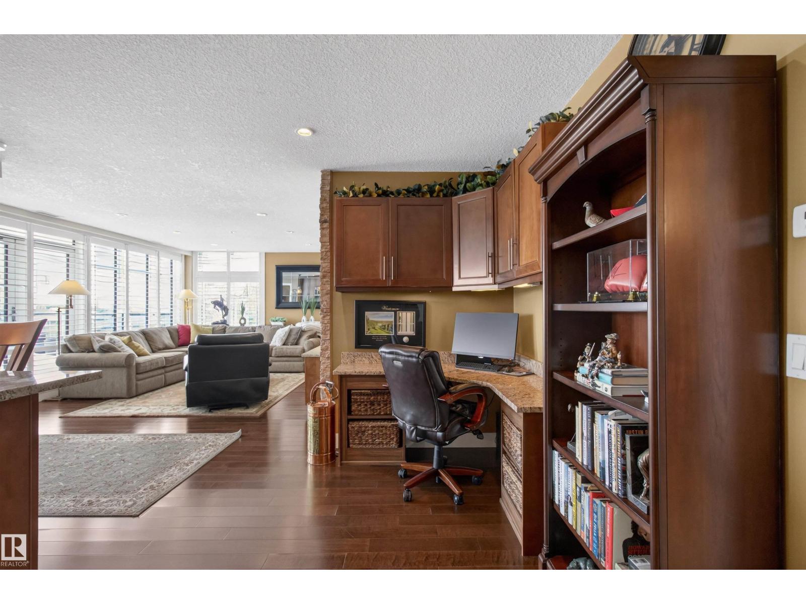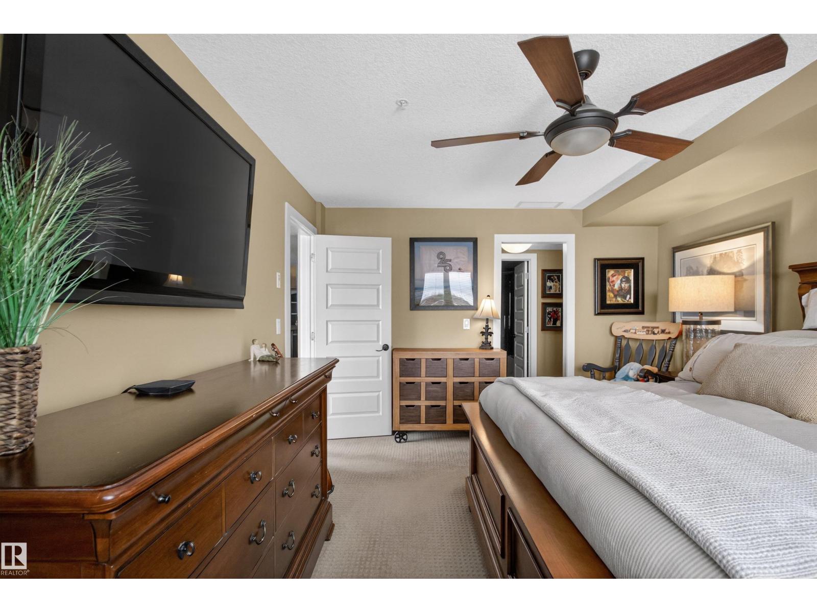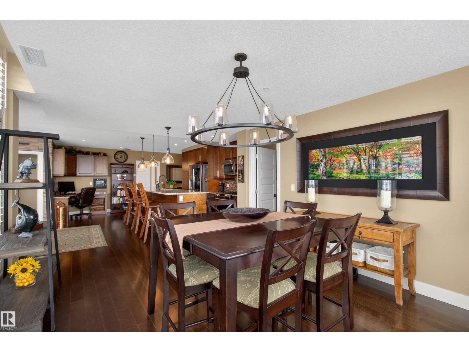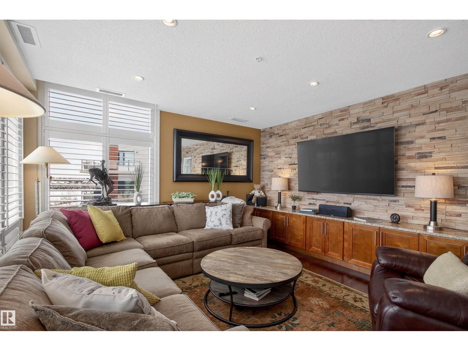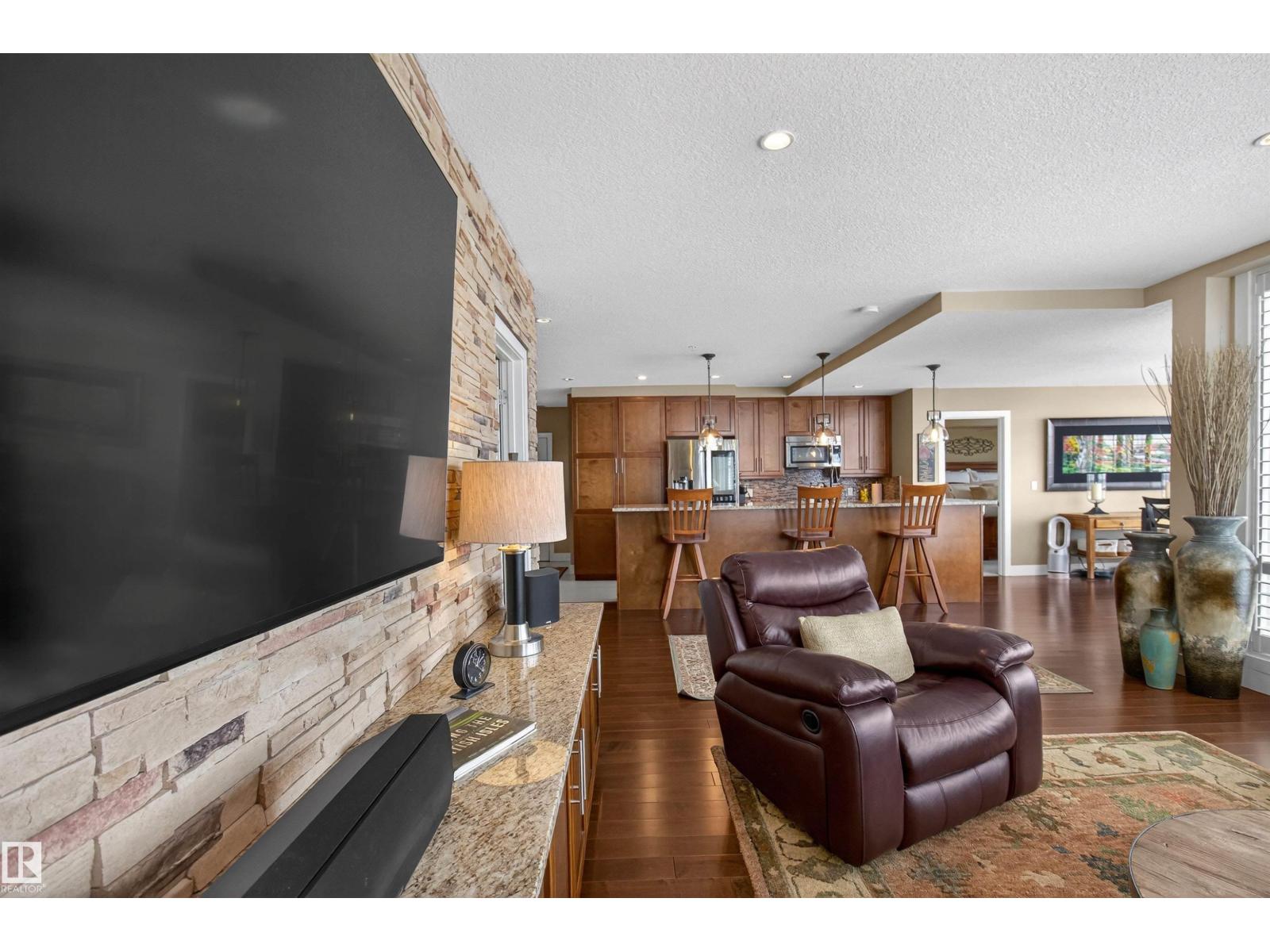 Welcome to the top-floor corner unit offering incredible natural light & beautiful pond views. Open-concept layout features spacious kitchen w/upgraded cabinetry, granite countertops, upgraded appliances, pantry, and a large custom island. Between the kitchen & living room you’ll find a built-in desk with cabinetry, ideal for a home office. Living room showcases hardwood flooring, custom cabinetry & stone feature wall, & a wall of windows that fill the space with sunlight. Step onto your private balcony overlooking the pond. Large dining area, surrounded by windows on two sides, offers a bright space with scenic views. Primary bedroom features carpet, large window, & walk-through closet w/custom cabinetry leading to 5-pc ensuite w/spacious custom corner shower. Bedroom two is generously sized & located next to 4-pc main bathroom. Well-maintained, immaculate unit is in the beautiful Windermere community, with all amenities minutes away. Titled two parking stalls & storage room w/fridge & shelves included. (id:63190)