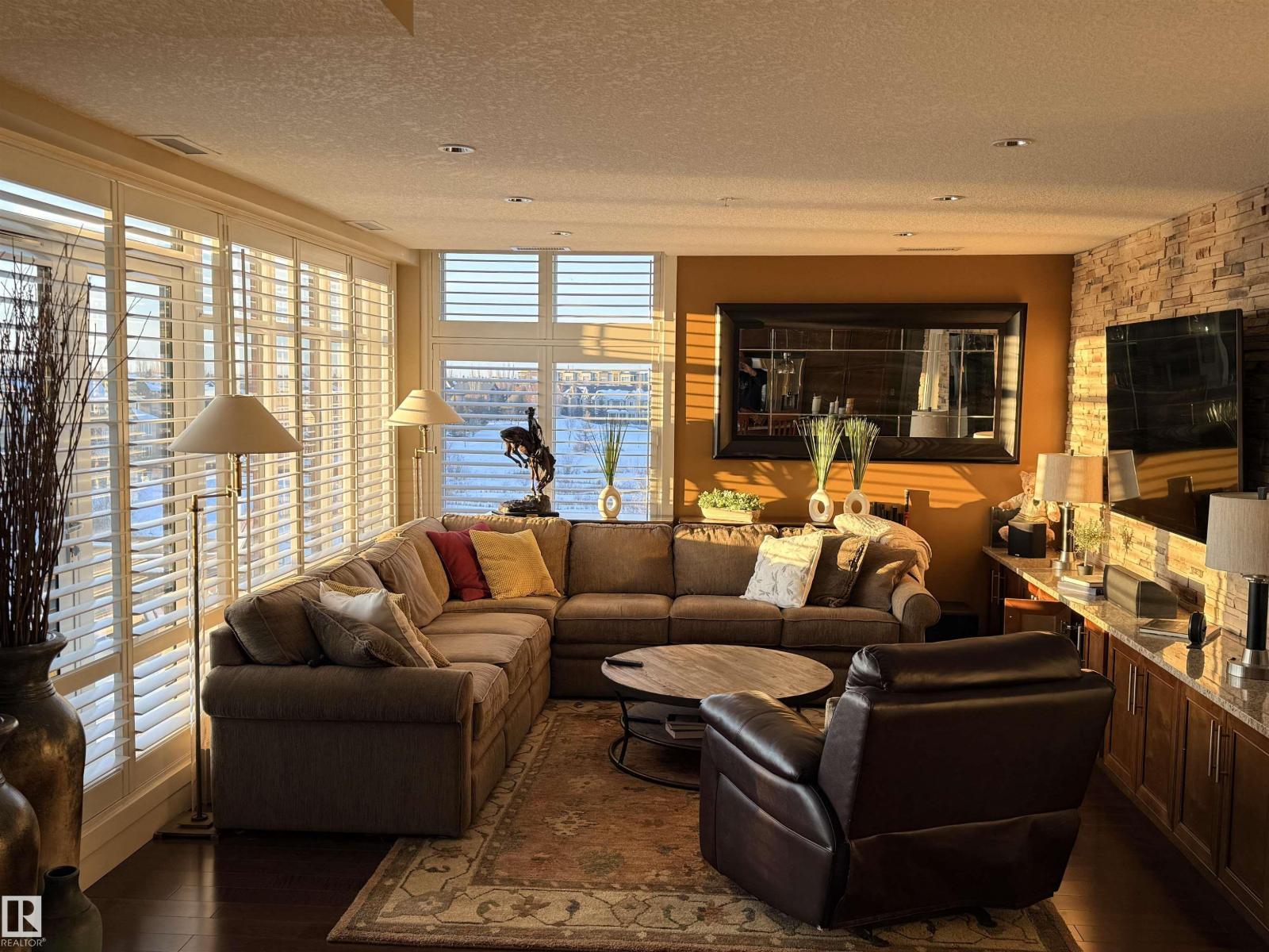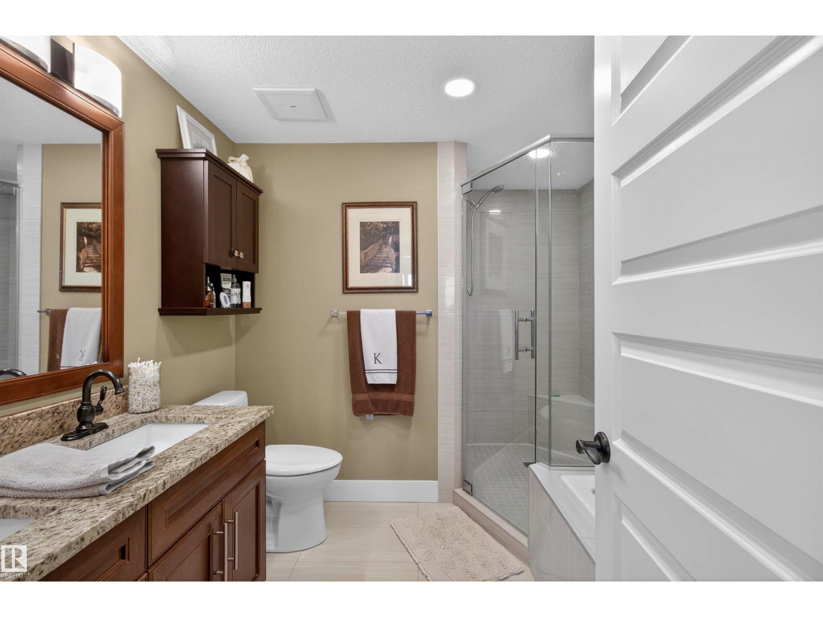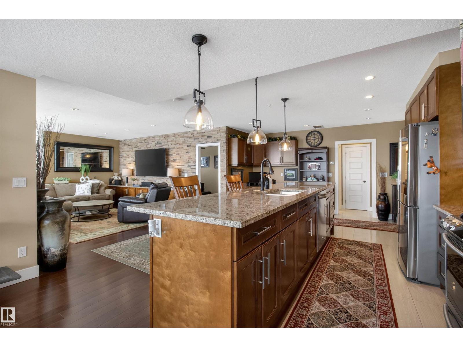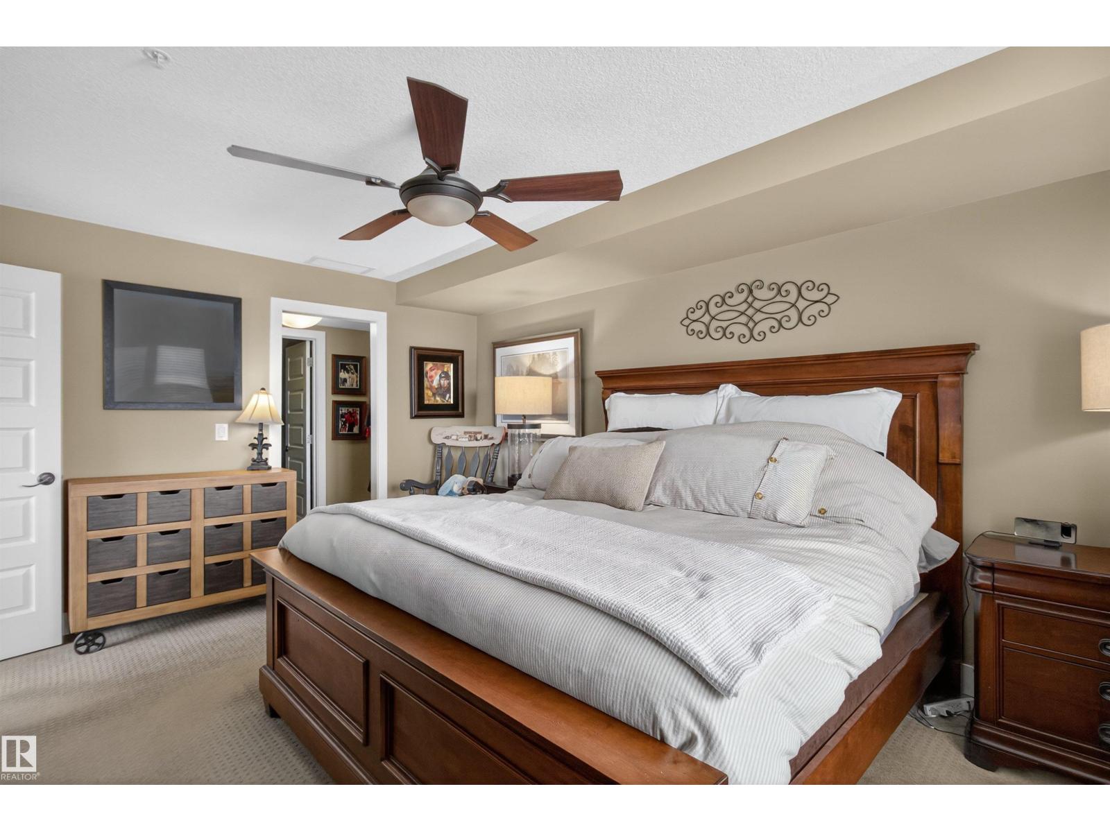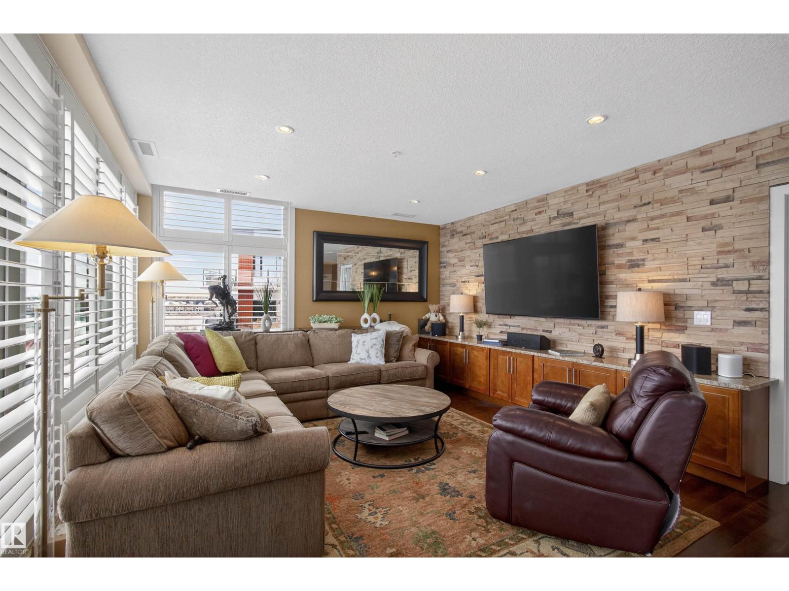 Welcome to the top-floor corner unit offering incredible natural light & beautiful pond views. Open-concept layout features spacious kitchen w/upgraded cabinetry, granite countertops, upgraded appliances, pantry, and a large custom island. Between the kitchen & living room you’ll find a built-in desk with cabinetry, ideal for a home office. Living room showcases hardwood flooring, custom cabinetry & stone feature wall, & a wall of windows that fill the space with sunlight. Step onto your private balcony overlooking the pond. Large dining area, surrounded by windows on two sides, offers a bright space with scenic views. Primary bedroom features carpet, large window, & walk-through closet w/custom cabinetry leading to 5-pc ensuite w/spacious custom corner shower. Bedroom two is generously sized & located next to 4-pc main bathroom. Well-maintained, immaculate unit is in the beautiful Windermere community, with all amenities minutes away. Titled two parking stalls & storage room w/fridge & shelves included. (id:63190)