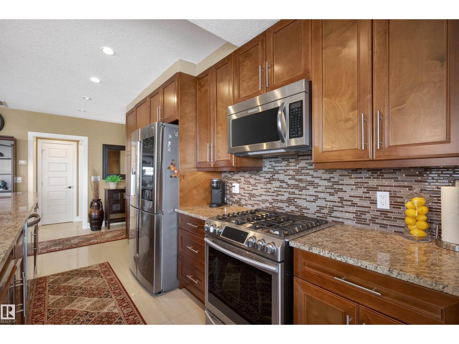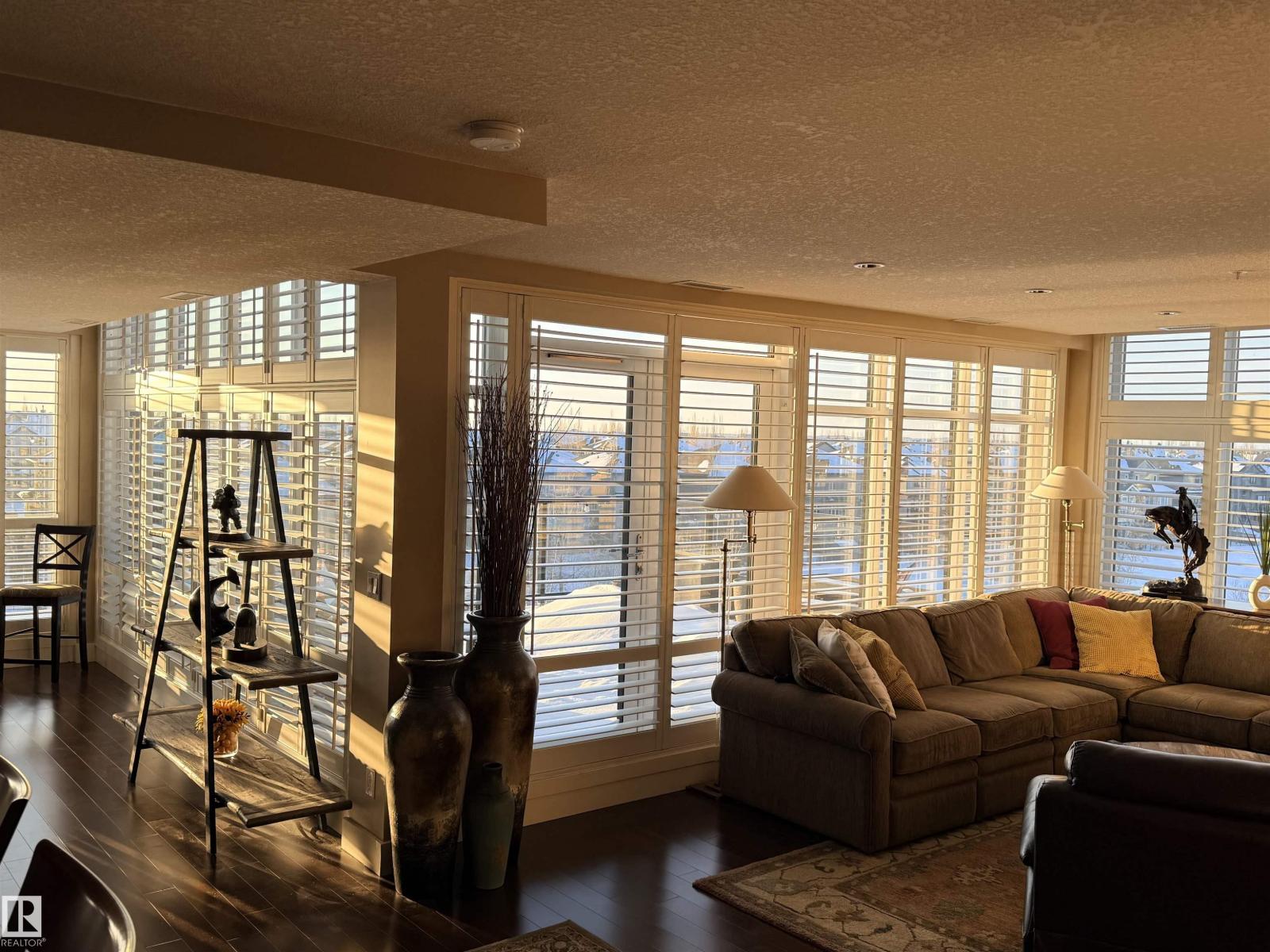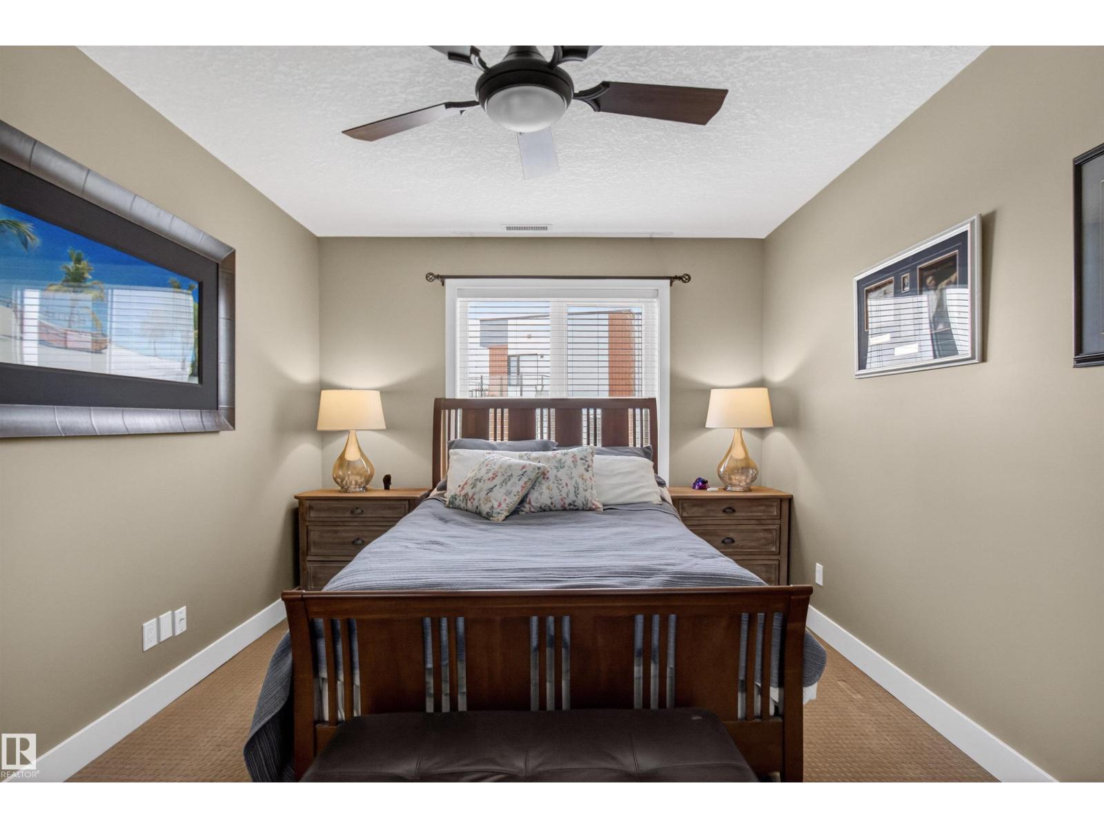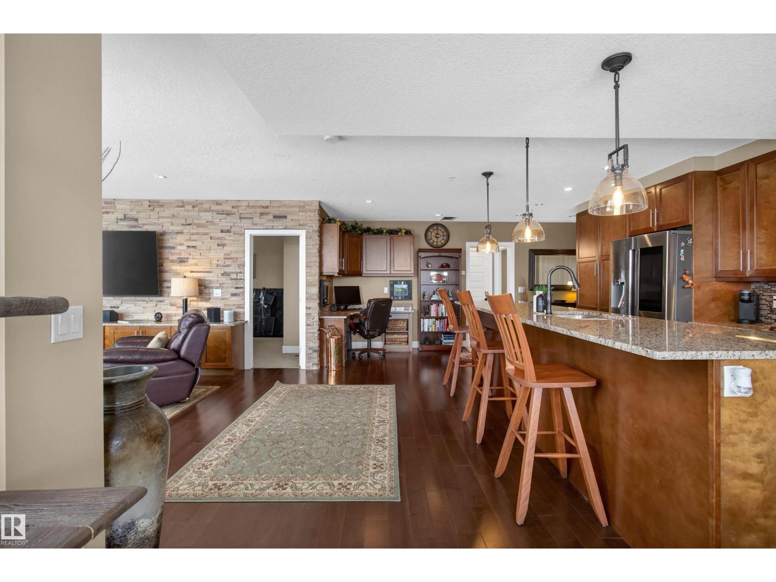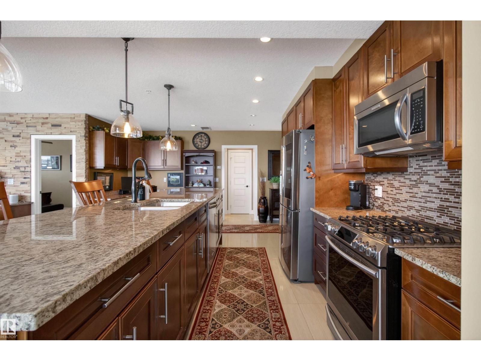 Welcome to the top-floor corner unit offering incredible natural light & beautiful pond views. Open-concept layout features spacious kitchen w/upgraded cabinetry, granite countertops, upgraded appliances, pantry, and a large custom island. Between the kitchen & living room you’ll find a built-in desk with cabinetry, ideal for a home office. Living room showcases hardwood flooring, custom cabinetry & stone feature wall, & a wall of windows that fill the space with sunlight. Step onto your private balcony overlooking the pond. Large dining area, surrounded by windows on two sides, offers a bright space with scenic views. Primary bedroom features carpet, large window, & walk-through closet w/custom cabinetry leading to 5-pc ensuite w/spacious custom corner shower. Bedroom two is generously sized & located next to 4-pc main bathroom. Well-maintained, immaculate unit is in the beautiful Windermere community, with all amenities minutes away. Titled two parking stalls & storage room w/fridge & shelves included. (id:63190)