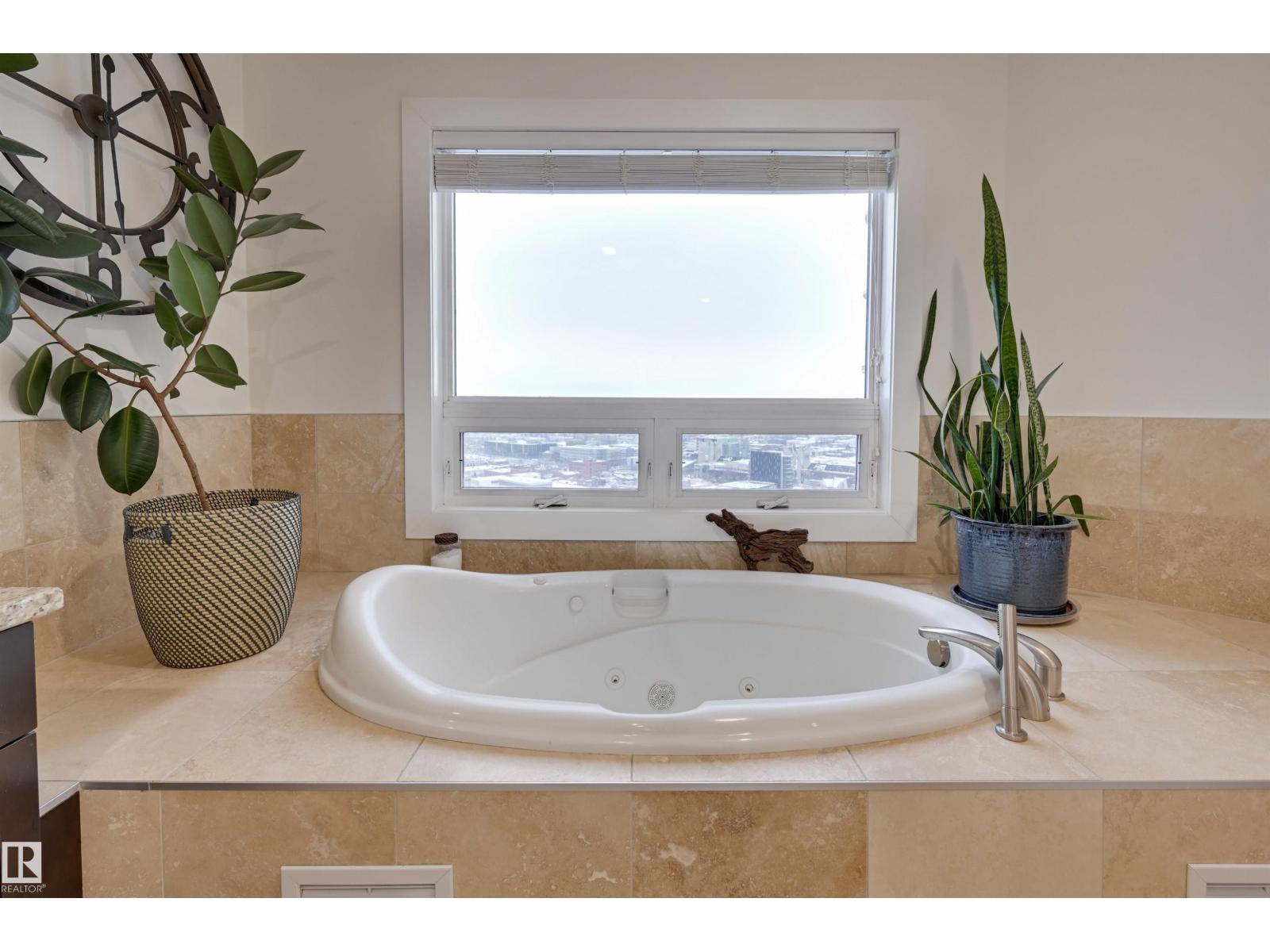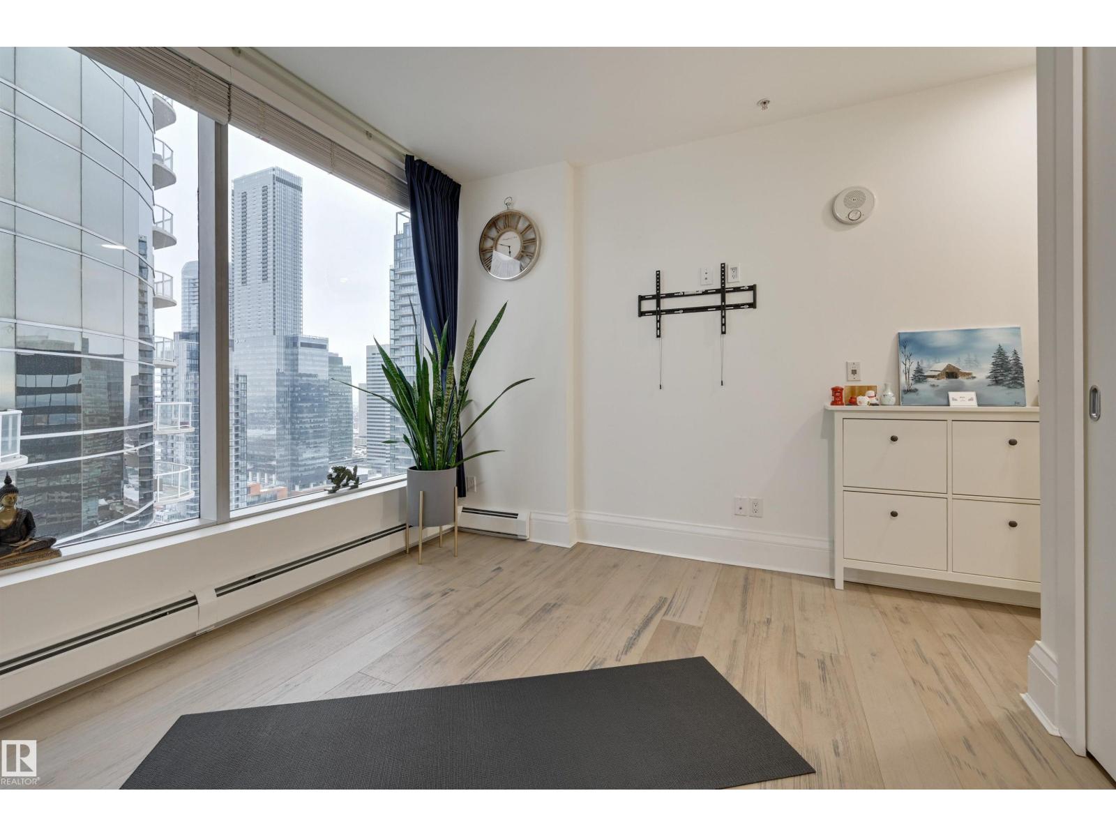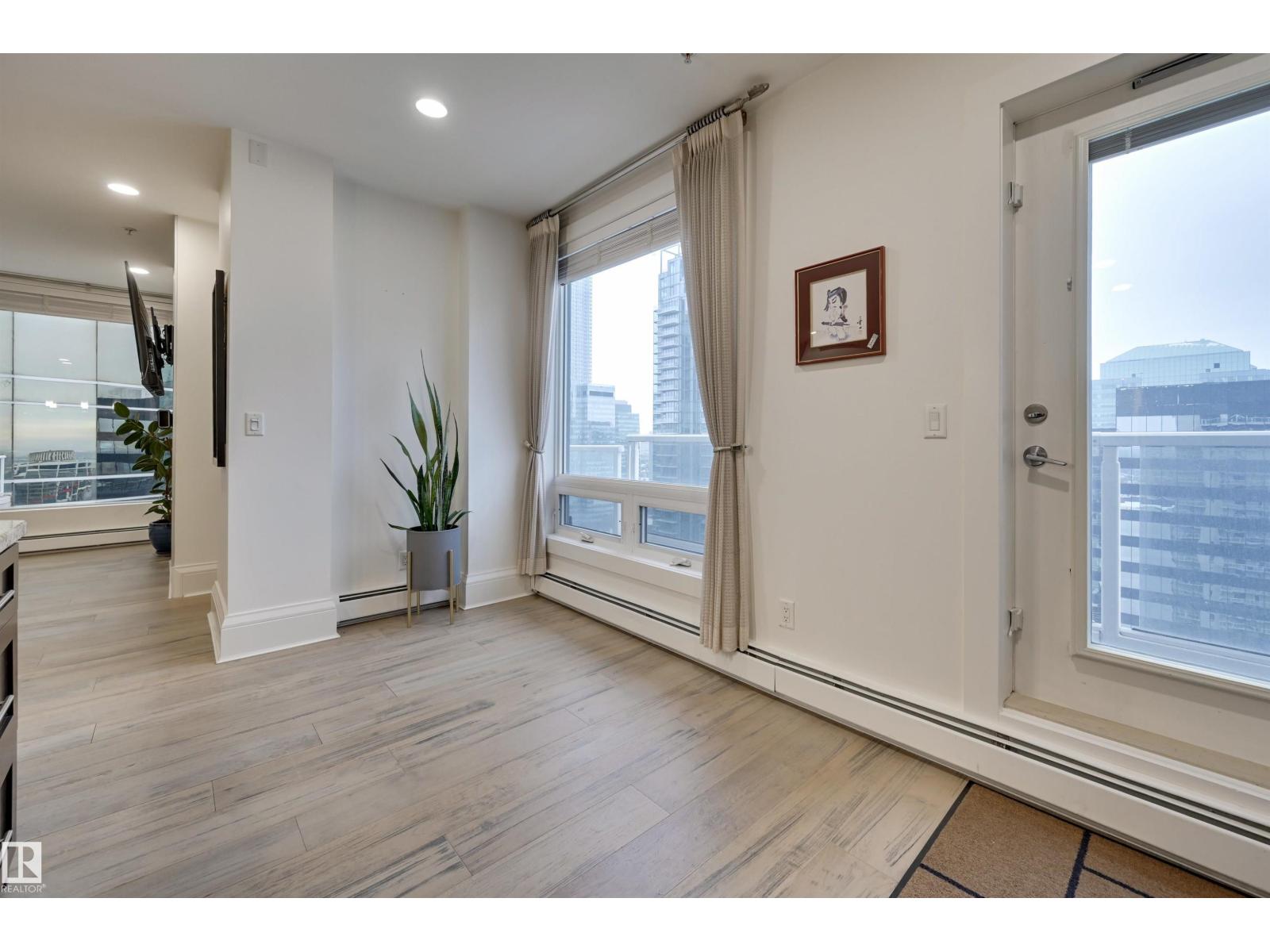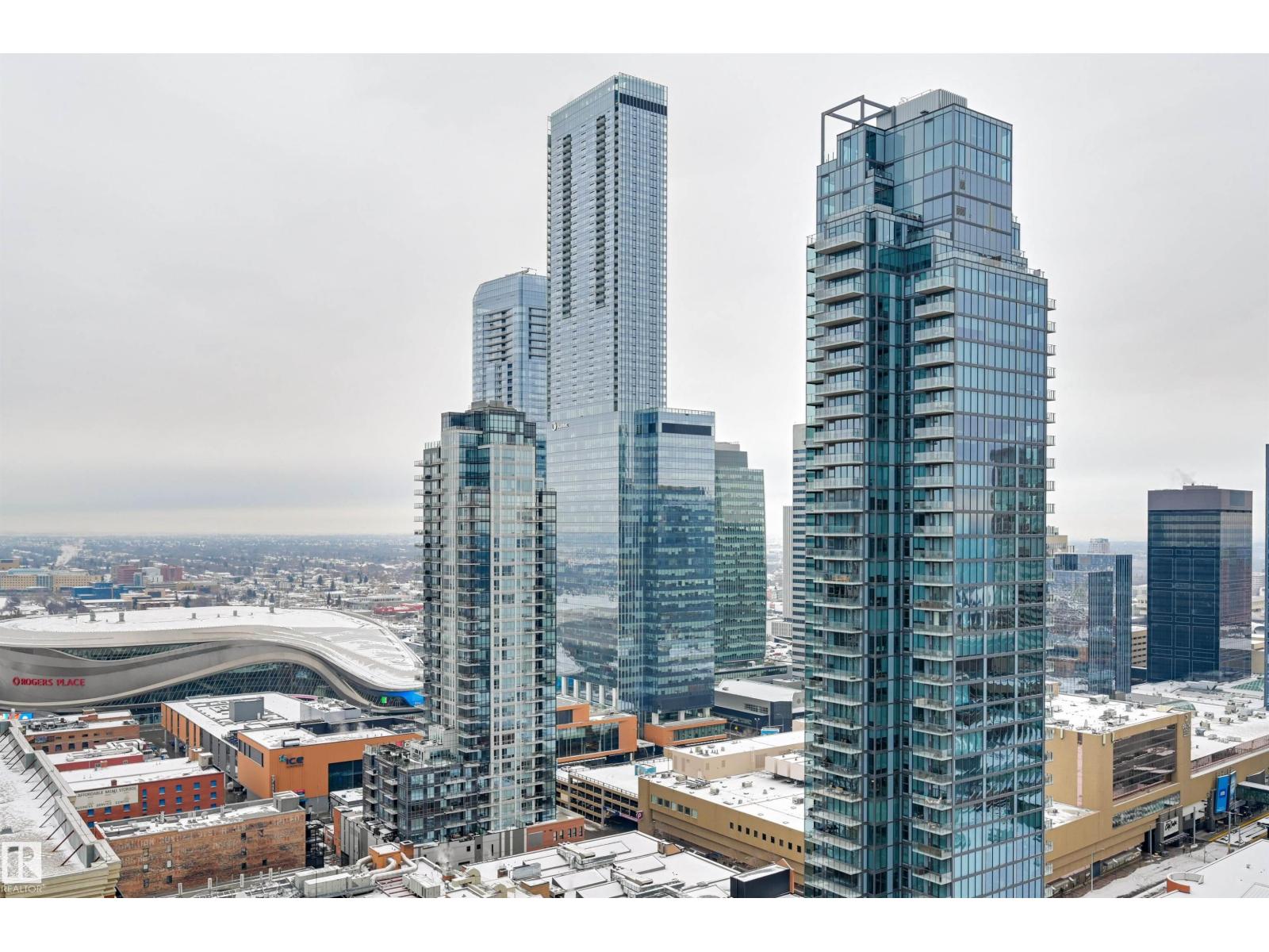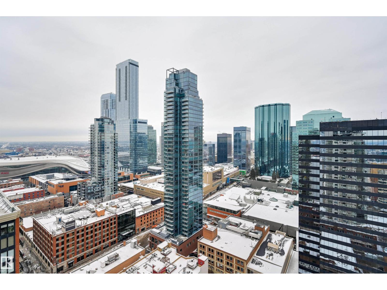 Experience elevated living in this luxurious 1,286 sq.ft. sub-penthouse. This impressive 2-bed, 2-bath residence is one of only three units on the 28th floor. The condo comes with two underground parking stalls (tandem) and a large storage cage. Perfect for entertaining is the expansive upgraded living area, highlighted by wide-plank hardwood floors, air conditioning, two balconies, and a cozy gas fireplace. The open kitchen showcases granite countertops, upgraded stainless steel appliances, and breakfast bar. Spacious primary bedroom with it's own balcony and walk in custom closet while the ensuite adds a steam shower and Japanese bidet toilet for spa-level comfort. Smart home features elevate convenience with LED pot lights, a video doorbell, upgraded fixtures, and integrated controls for lighting, music, and more. All of this in an unbeatable 104 St. location—steps to the outdoor farmers market, Ice District, top restaurants, and cafes. Move-in ready and designed to impress! (id:63190)