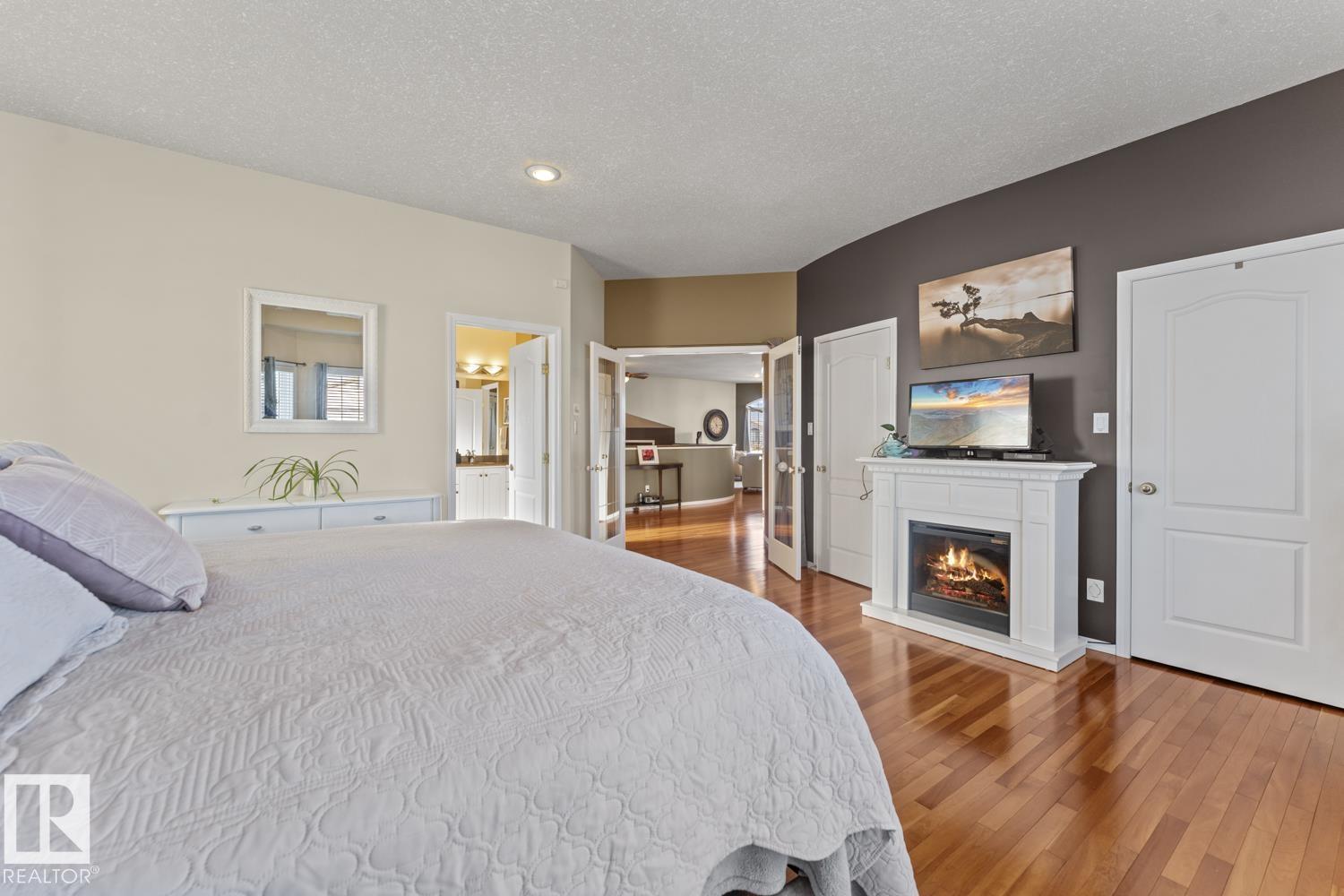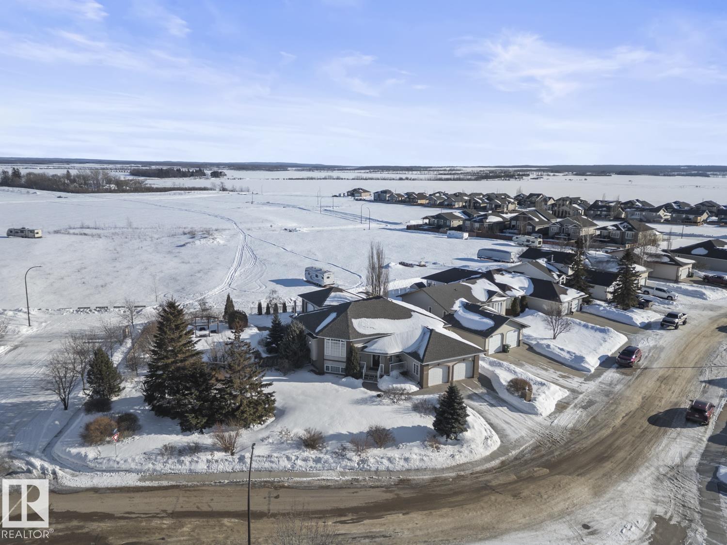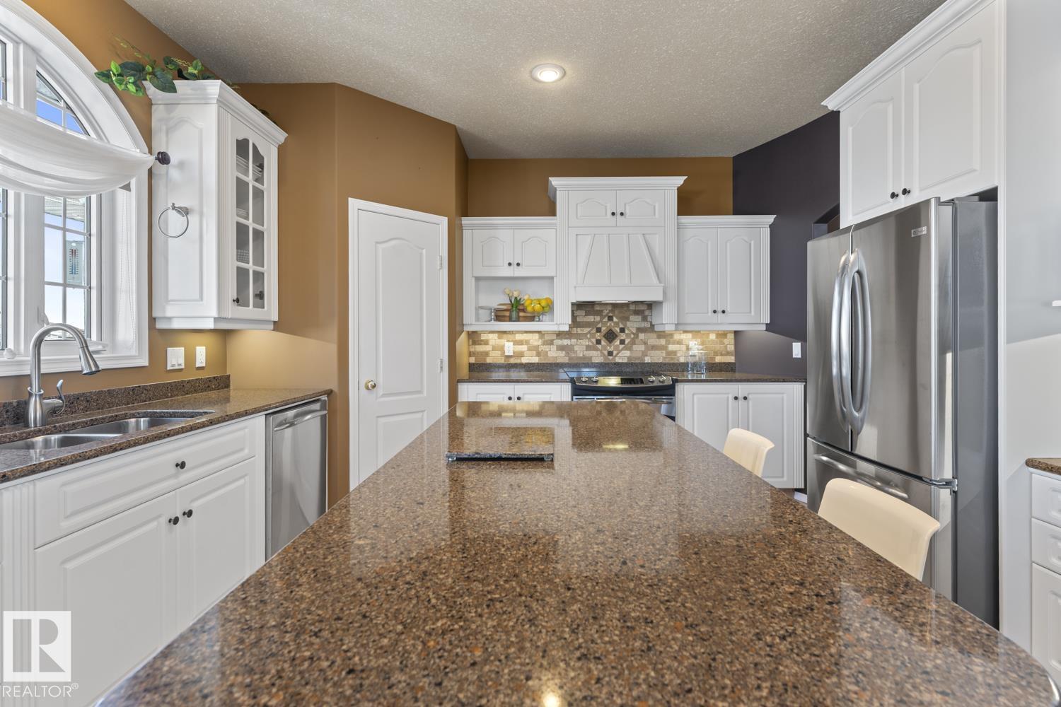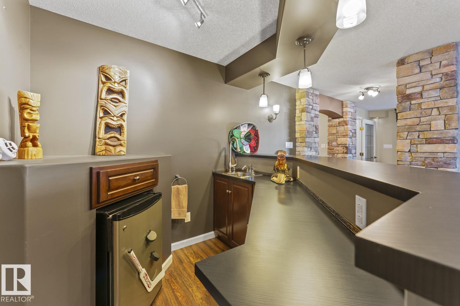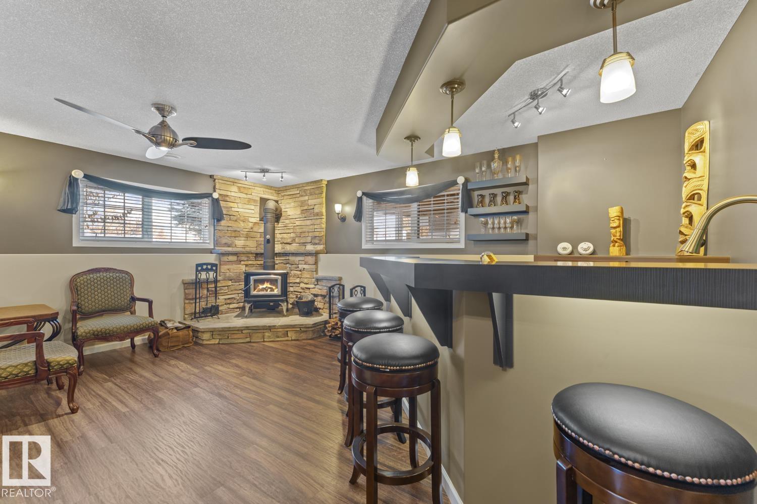 This custom-built home sits on two landscaped lots and offers exceptional space inside and out. The main floor features a modern kitchen with quartz countertops, stainless steel appliances, and a bright, open living area with a fireplace. The primary bedroom includes a 4-piece ensuite with jacuzzi tub, separate 4-ft shower, and his-and-hers walk-in closets. A second bedroom can function as a home office. The lower level has in-floor heating, a large family/games room with wood stove, full wet bar, a spacious third bedroom with access to a 3-piece bathroom, plus dedicated laundry and storage areas. An oversized heated double attached garage and an additional heated double detached garage provide ample parking and workspace. Professionally landscaped yard with underground sprinklers and mature trees completes this one-of-a-kind property. (id:63190)