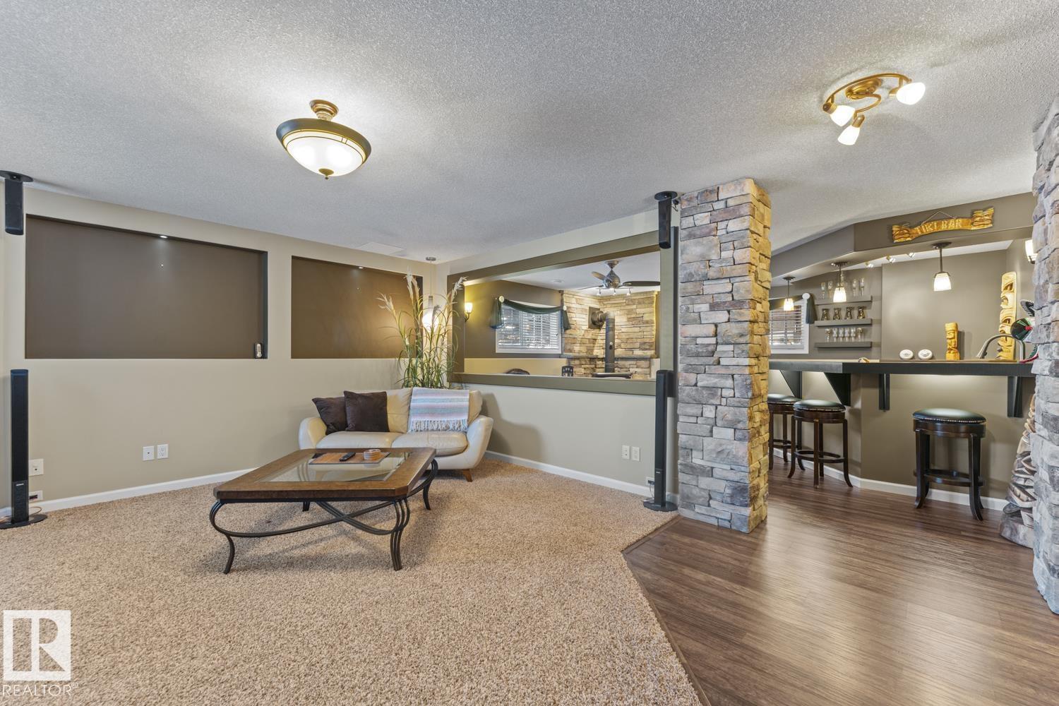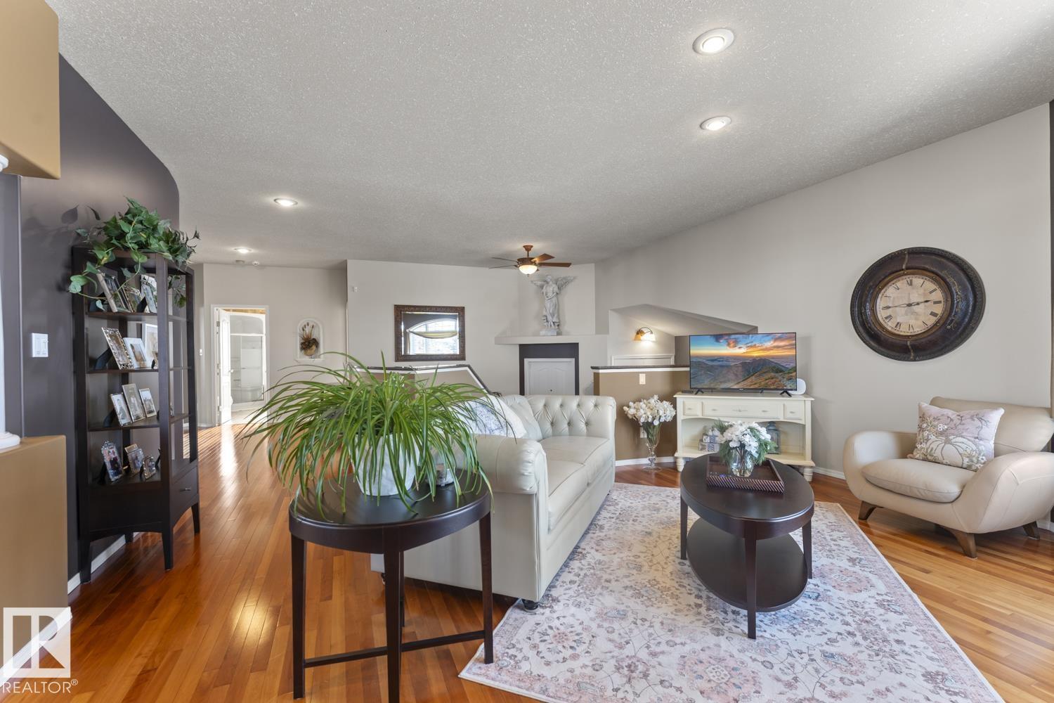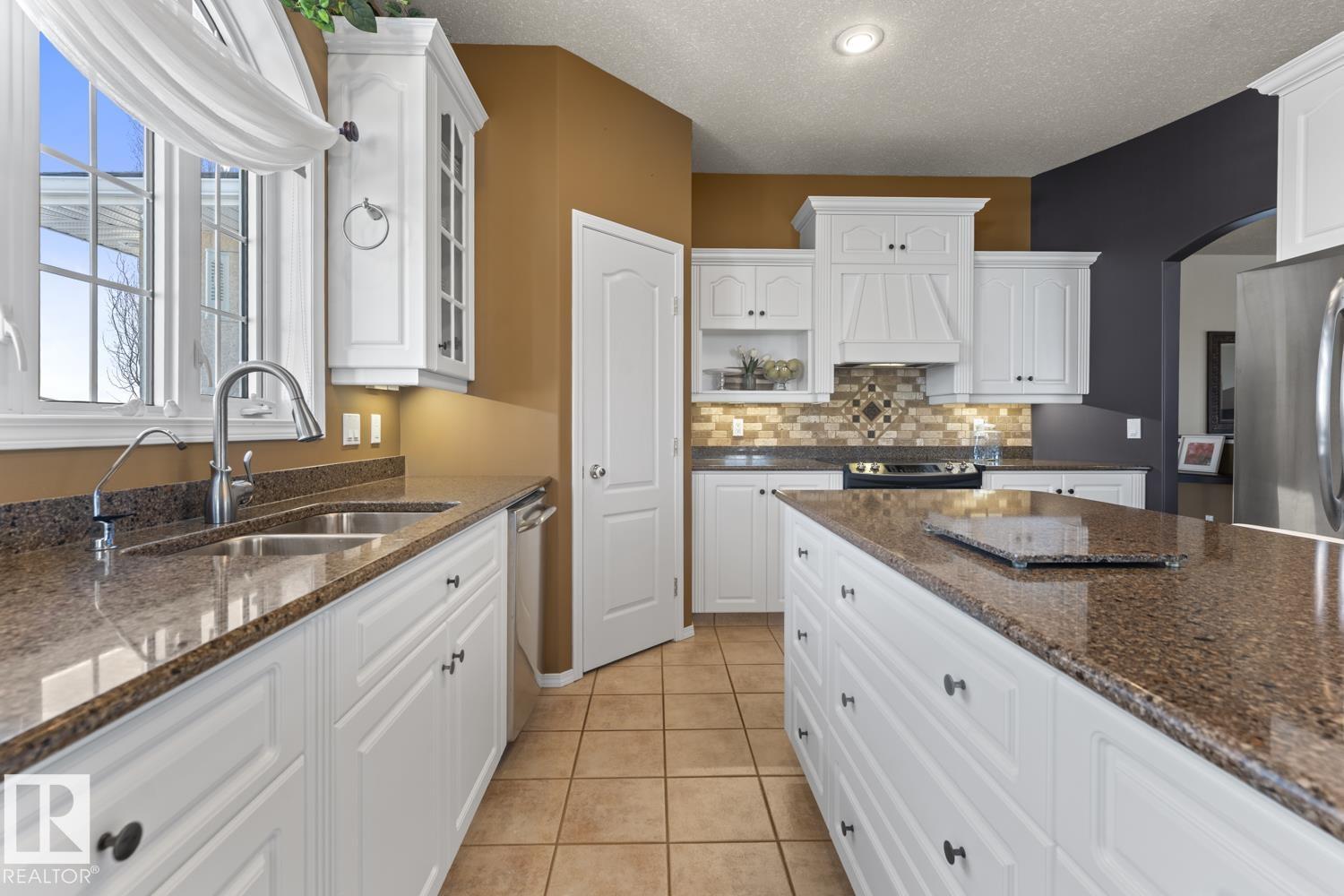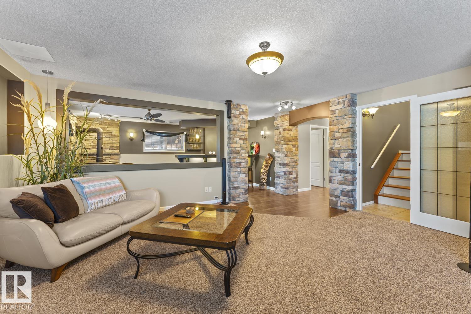 This custom-built home sits on two landscaped lots and offers exceptional space inside and out. The main floor features a modern kitchen with quartz countertops, stainless steel appliances, and a bright, open living area with a fireplace. The primary bedroom includes a 4-piece ensuite with jacuzzi tub, separate 4-ft shower, and his-and-hers walk-in closets. A second bedroom can function as a home office. The lower level has in-floor heating, a large family/games room with wood stove, full wet bar, a spacious third bedroom with access to a 3-piece bathroom, plus dedicated laundry and storage areas. An oversized heated double attached garage and an additional heated double detached garage provide ample parking and workspace. Professionally landscaped yard with underground sprinklers and mature trees completes this one-of-a-kind property. (id:63190)
