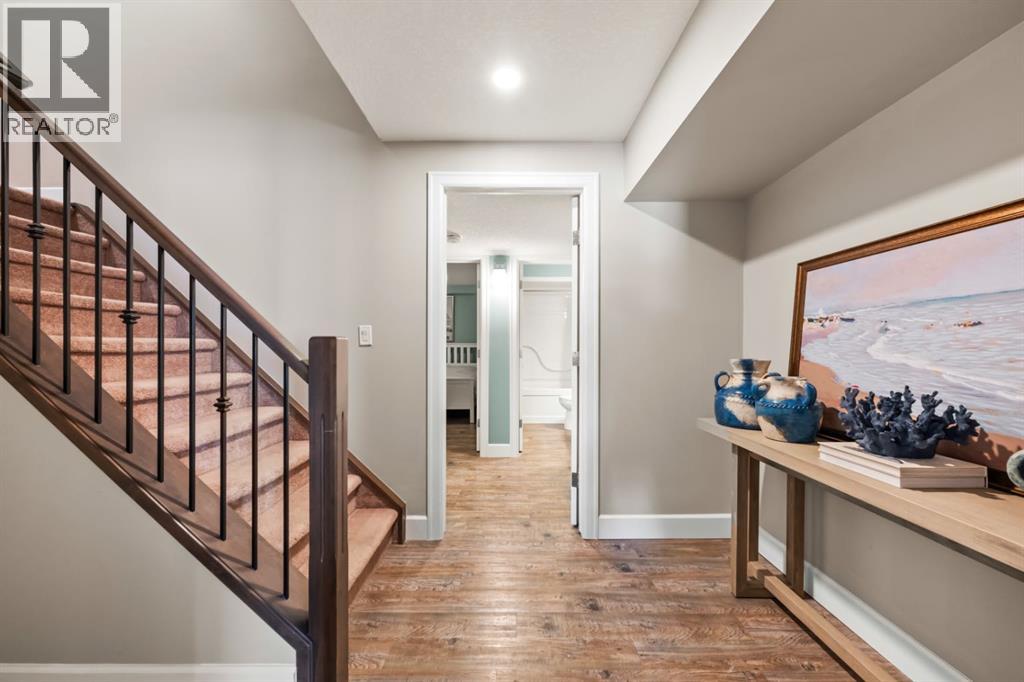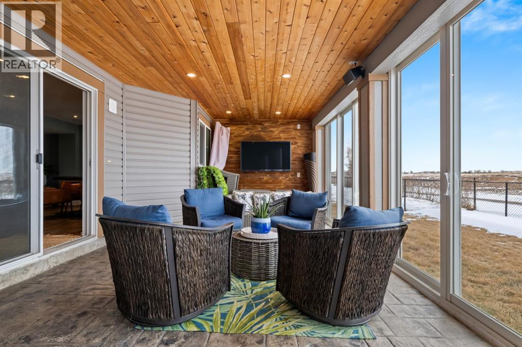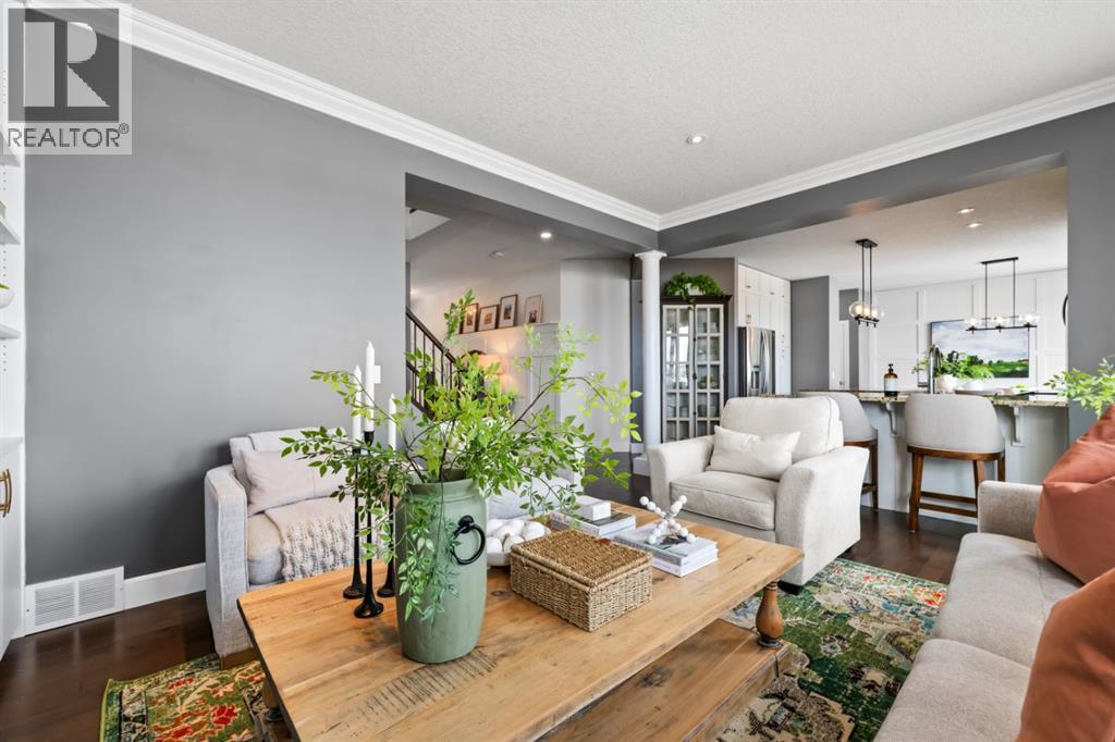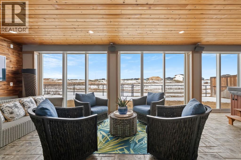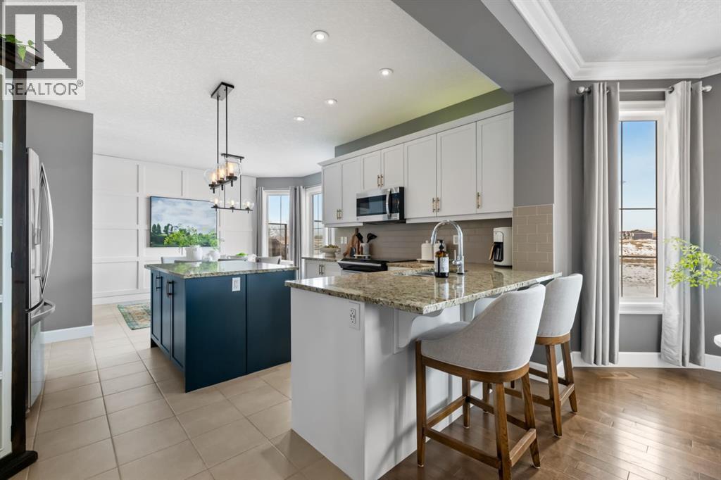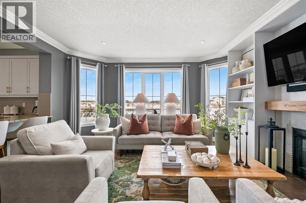 This exceptional executive two-storey walkout home offers over 3,000 sq. ft. of fully developed living space and backs onto a beautiful green space and a scenic pond which provides peaceful views and breathtaking sunsets. A spacious entryway welcomes you inside, where a bright flex room behind French doors creates the perfect home office or reading space. The main level features a sun-filled living room with west-facing windows, a cozy gas fireplace, and custom built-ins.The open-concept kitchen is designed for both everyday living and entertaining, showcasing a large granite island, ceiling-height cabinetry, stainless steel appliances, and recessed lighting. Step onto the oversized upper deck with a gas line for BBQ, perfect for enjoying the tranquil pond views. Upstairs you’ll find a spacious bonus room, upper-level laundry with a linen closet, and three generous bedrooms. The primary suite offers a walk-in closet and a spa-inspired ensuite with double vanities, a soaker tub, and a steam shower. Two additional bedrooms and a full bathroom complete the upper floor. The fully developed walkout basement adds incredible living space with a large recreation area and wet bar, an additional bedroom, full bathroom, and a bright sunroom with hot tub. There is direct access to walking paths along the pond and green space.Additional highlights include solar panels, air conditioning, a heated garage, irrigation system, permanent Govee exterior lighting, and concrete side stairs for convenient access. Ideally located close to parks, walking paths, a skate park, and pickleball courts. This home offers the perfect blend of space, comfort, and lifestyle. (id:63190)