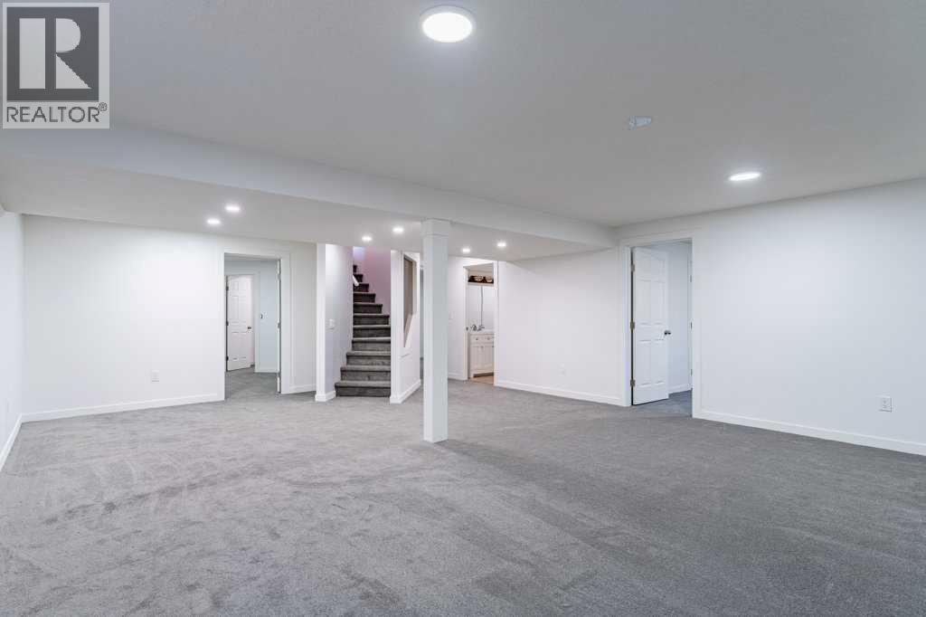 Well maintained, fully finished bungalow located in the desirable community of Douglasdale. Situated on a quiet street with no neighbours behind, this spacious open-concept home offers vaulted ceilings throughout the main floor, creating a bright and airy feel.The main level features two generous bedrooms, including a large primary retreat with a four-piece ensuite complete with jetted tub, separate shower, and skylight. The inviting living and dining areas are centered around a gas fireplace with wood mantle, perfect for both everyday living and entertaining. The kitchen is flooded with natural light from large windows and includes an island, pantry, and dining nook, offering ample cupboard and counter space. New carpet throughout the home adds comfort and a fresh, move-in-ready feel.The fully renovated basement significantly expands the living space and includes three additional bedrooms, a full bathroom, and a large recreation room with wet bar—ideal for guests, teens, or multi-generational living.Additional highlights include a double attached garage, large fenced backyard, spacious deck and patio for outdoor entertaining, and front veranda. Located on a large lot in one of Douglasdale’s most sought-after communities, close to golf courses, pathways, parks, and amenities. This home is a must-see! (id:63190)