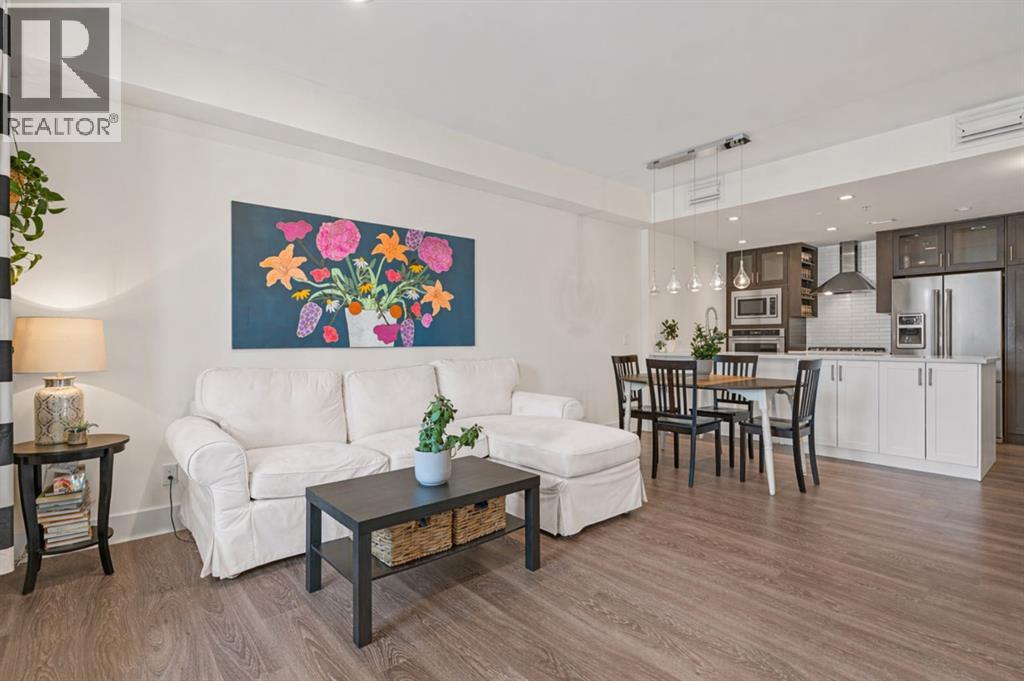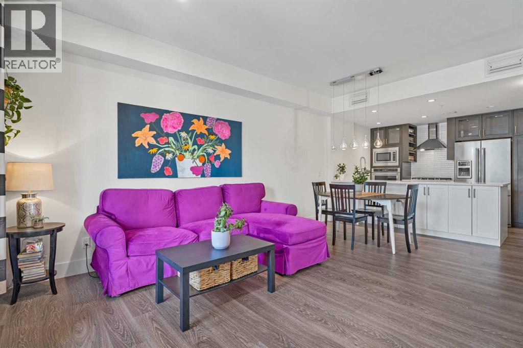 Welcome to The Riviera in Parkdale, offering refined inner-city living in one of Calgary’s most desirable riverfront communities. Ideally located directly across from the Bow River and its extensive pathway system, this location provides easy access to Kensington, Downtown, Foothills Hospital, and Alberta Children’s Hospital.This south-facing main floor 1 bedroom + den unit offers over 665 sq ft of thoughtfully designed living space with 9’ ceilings and large windows that fill the home with natural light. The modern kitchen features quartz countertops, quality appliances, a pull-out pantry, and a large island, opening seamlessly to the bright living area.Additional features include laminate flooring, in-suite laundry, central A/C, in-floor heating, central water softener, and extensive soundproofing. Enjoy the spacious south-facing patio with pleasant river valley views. The primary bedroom is bright and comfortable with convenient access to the 4-piece bath complete with a soaker tub.The Georgian-inspired Riviera building showcases a stunning lobby with 20’ coffered ceilings and elegant chandeliers, and the unit includes titled underground parking and an assigned storage locker.An excellent opportunity for professionals and investors seeking a premium location close to hospitals, downtown, shops, restaurants, and Calgary’s beautiful river pathways. Contact your favourite realtor today to book a showing! (id:63190)