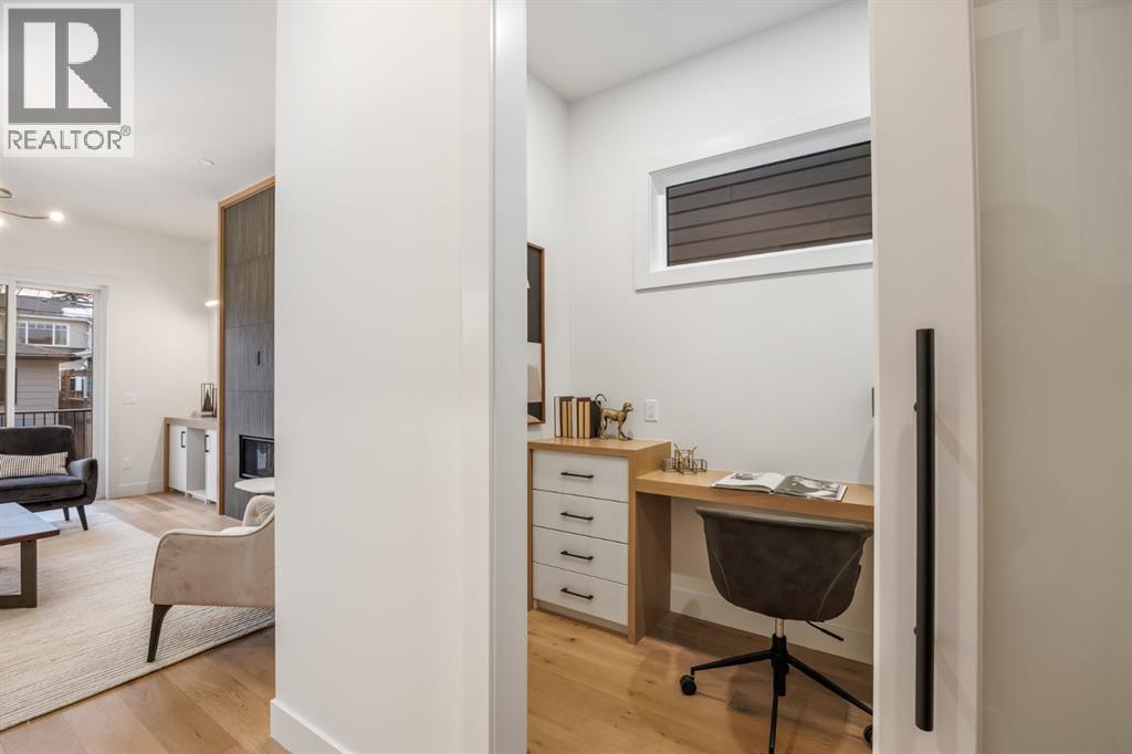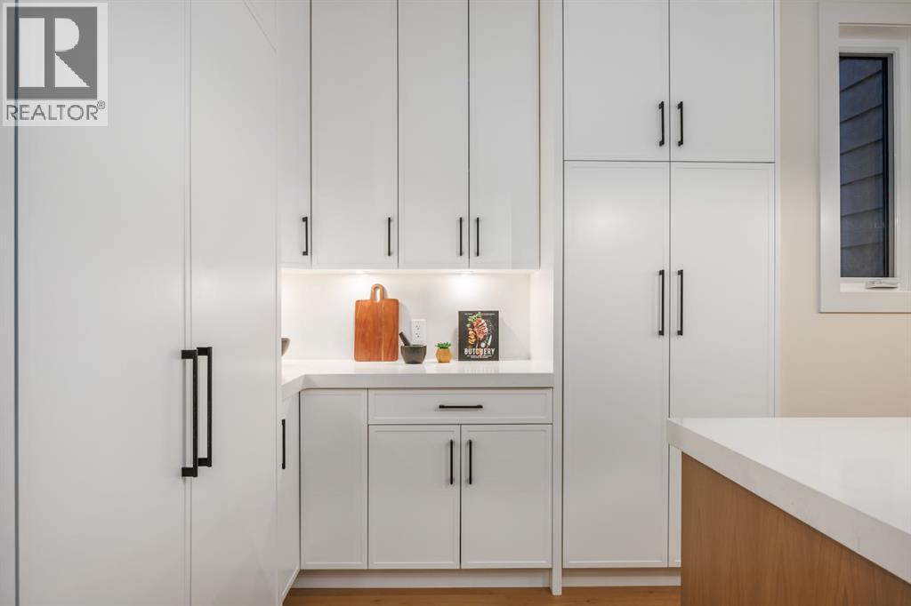 OPEN HOUSE Saturday April 25th 3-5PM, Sunday April 26th 2-4PM! Experience elevated inner-city living with this impeccably designed, brand-new home nestled in one of Calgary’s most sought-after neighbourhoods: Hillhurst. Constructed by a trusted local builder known for craftsmanship, functionality, and aesthetic excellence, this 2-storey residence offers 2,224 SF above grade, with a fully developed basement, 4 bedrooms, and 4.5 bathrooms—a perfect blend of modern luxury and thoughtful detail. From the striking brick facade to the high-end engineered wide plank oak hardwood, every inch of this home exudes quality. The main floor welcomes you with a built-in entry feature and a front formal dining area, accented by elegant wall mouldings, white and gold sconces, and a designer chandelier. At the other end, an open-concept living room is a showstopper, featuring a large-format textured tile fireplace, custom built-ins with display lighting, and massive patio sliders leading to a west-facing, 135-ft deep backyard with a raised patio and gas line—ideal for indoor-outdoor entertaining. The chef’s kitchen is nothing short of stunning, complete with a 2.5" thick quartz island, panel-ready fridge/freezer with knurled handles, sleek quartz countertops, a gas range with pot filler, and backlit display cabinets framing the custom hood fan. You’ll also find a farmhouse sink, full slab backsplash, hidden coffee/appliance nook, built-in pantry, and a drawer-style microwave—each designed to inspire culinary creativity. Tucked behind a barn-style sliding door, the den offers a quiet workspace with a built-in desk, shelving, and bright window. The mudroom, also with a barn door, features tiled flooring, a built-in bench, and a large closet for seamless organization. Upstairs, each of the three spacious bedrooms come with walk-in closets and custom built-ins, along with private ensuites. The primary is sure to impress with vaulted ceilings, a LED-lit feature wall, statement gold light fixture, and a spa-inspired ensuite that boasts a steam shower, dual vanities, and a standalone soaker tub with dramatic black and white tile wall backdrop. A nearby laundry room offers convenience with a sink, folding station, shelving, and tile backsplash. The fully finished, carpeted basement, with 9-ft ceilings, is roughed in for in-floor heating and designed for comfort and versatility—featuring a spacious rec area, a TV wall with built-in components, a wet bar with lit display shelves and tile flooring, a full bath, and a large fourth bedroom with built-ins including a desk. An efficient mechanical room completes the lower level, with additional upgrades including solid core doors and built-in speakers throughout the entire home. Perfectly situated just steps from shops along 14 St NW and walking distance to Kensington Village, Calgary’s extensive river pathways, and the Downtown Core—this is urban luxury at its finest. Act now and make this exceptional Hillhurst property your forever home. (id:63190)