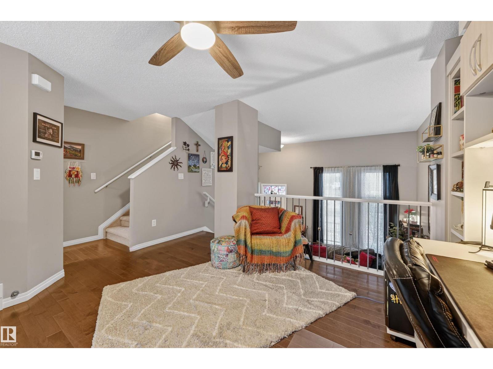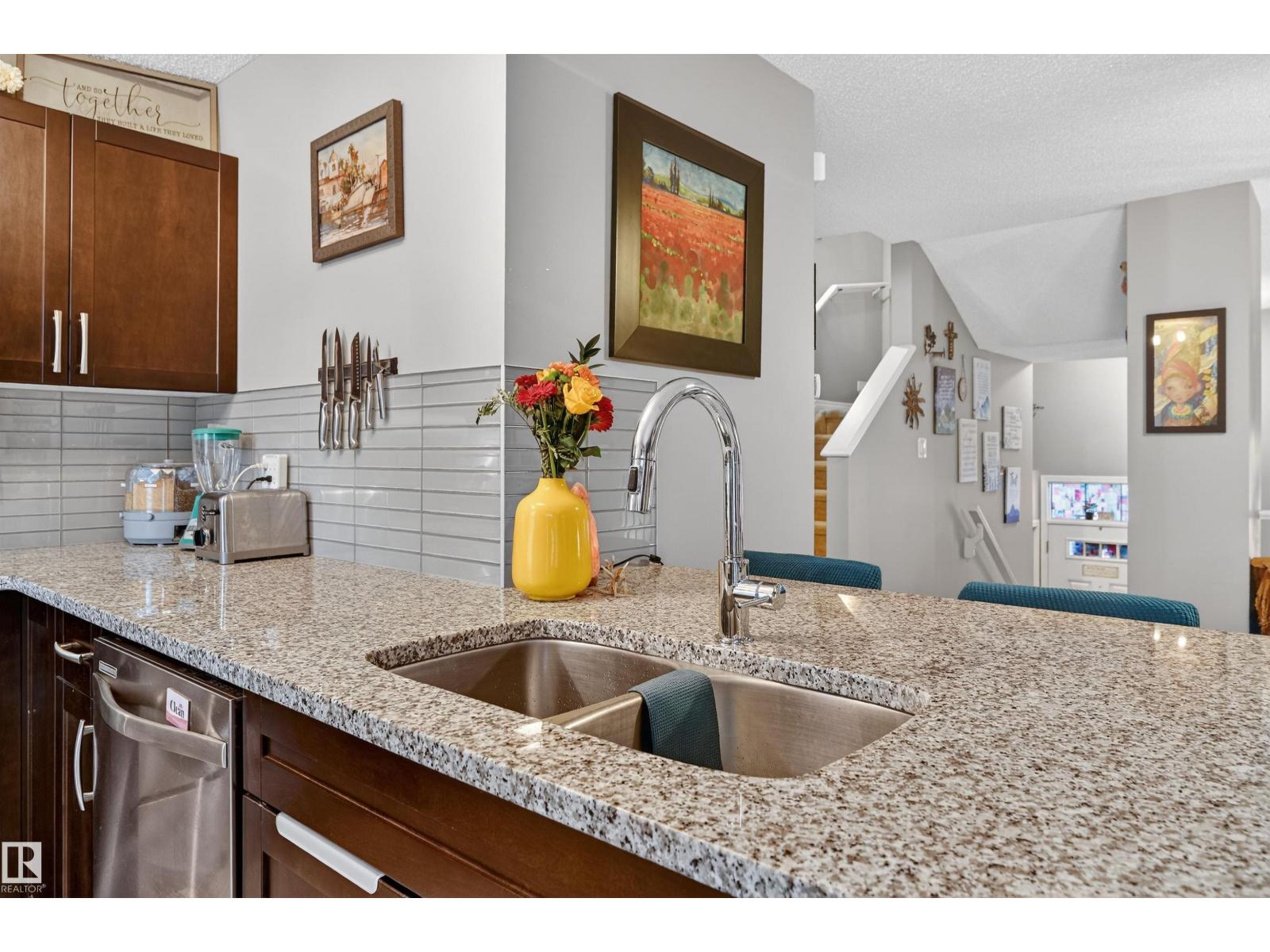 TURN KEY 3 bed 1.5 bath townhome with fantastic views! Facing open green space (not another row of homes), enjoy stunning sunrises and sunsets through oversized windows that flood the home with natural light. The front yard is upgraded with turf and tile for low-maintenance living, and the private rear balcony offers the perfect spot for morning coffee or evening unwinding. There is a dedicated office/library space, built-in shelving, California Closets throughout Upgrades include: granite countertops, breakfast bar, sunken living room, hardwood floors and 3 ceiling fans. The rear layout offers comfortable separation from neighboring units. Walking distance to the vibrant 6600 sq ft Chapelle Gardens community centre offering year round events- including skating, spray park, BBQ, event rentals , gazebo, child day camp programs, dance, soccer, billiards, book clubs, paint nights. Limitless entertainment for families. (id:63190)