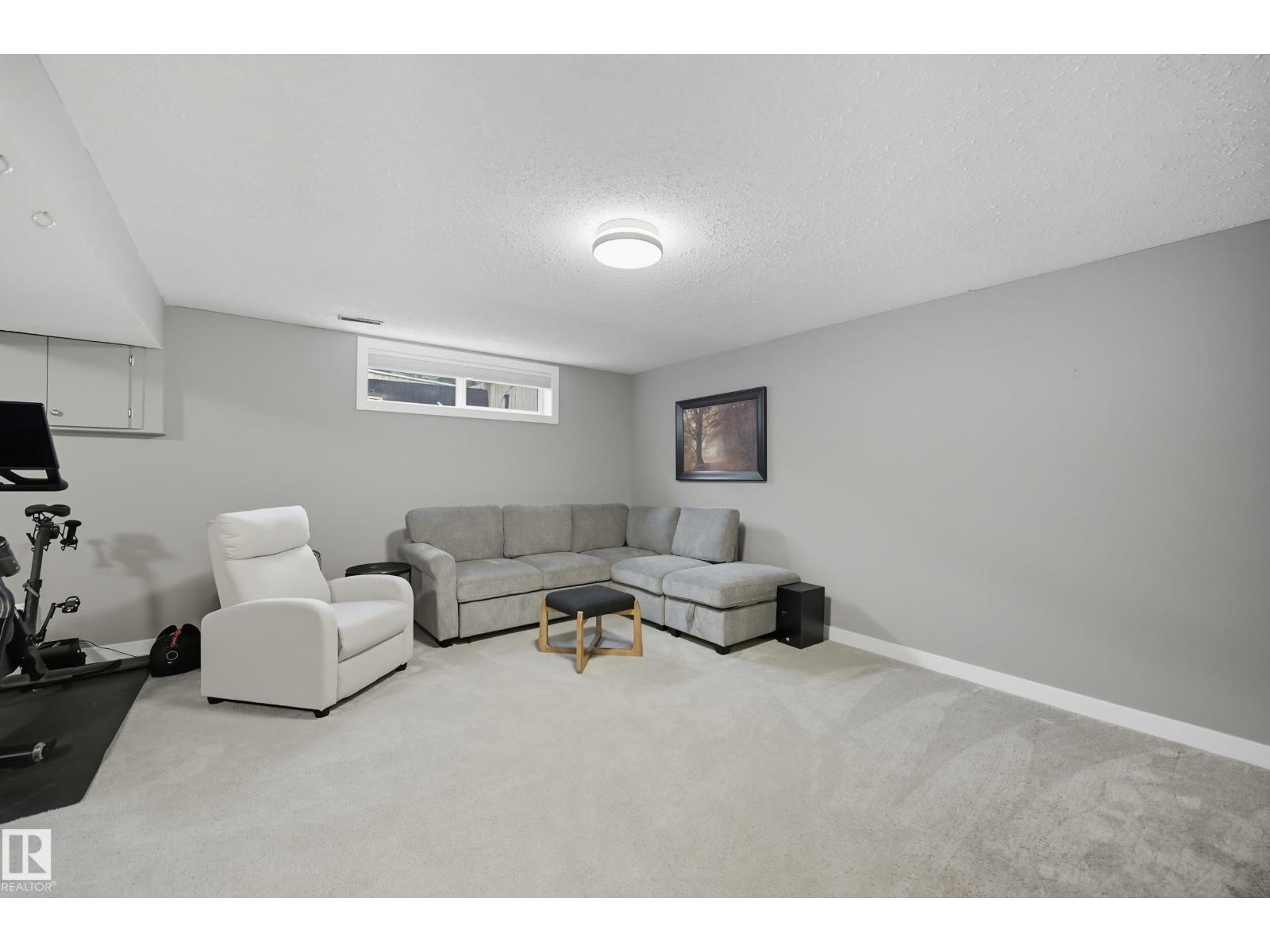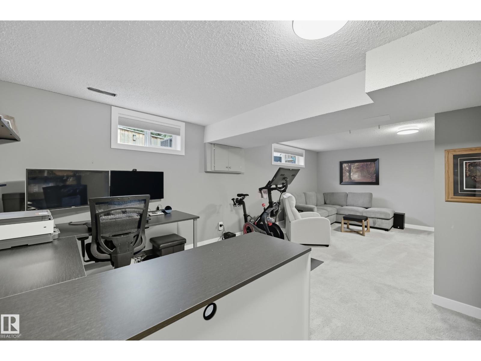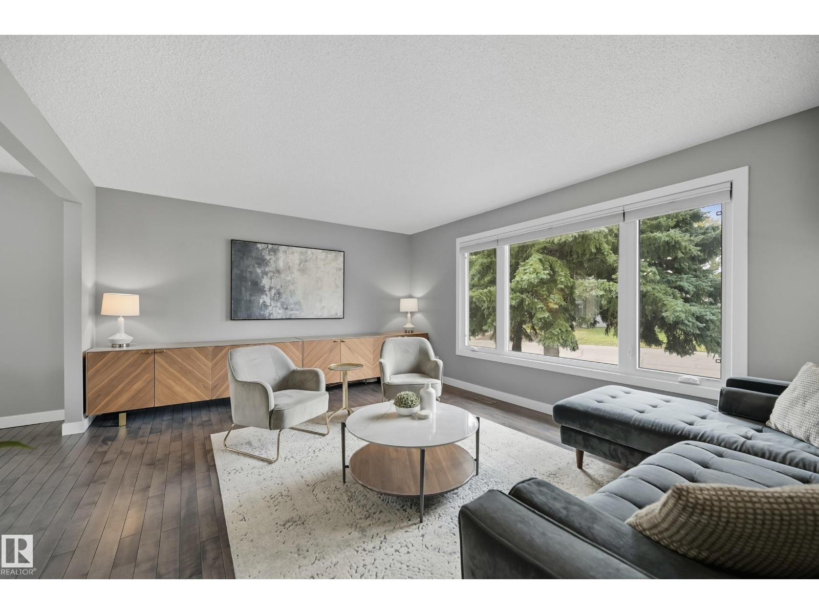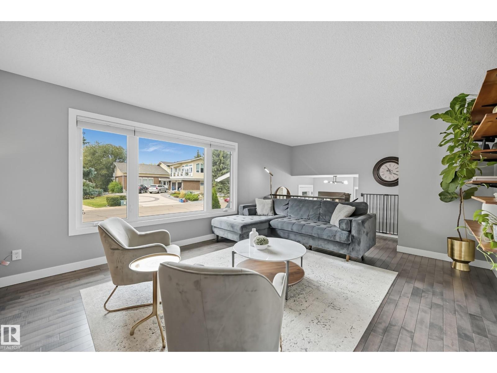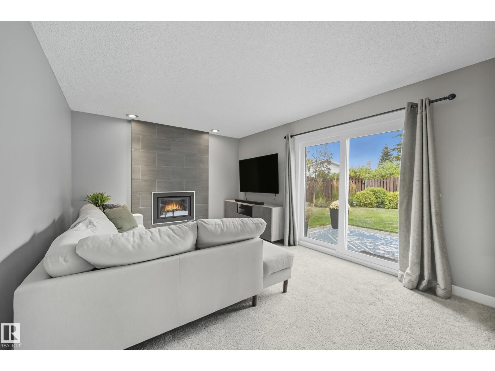 Discover this stunning 1,739 sq. ft. four-level split nestled in the prestigious Broadmoor community of Sherwood Park steps away from the golf course. This meticulously maintained home features an airy, open layout flooded with natural light from expansive windows in the massive living room. The heart of the home is an open-concept kitchen boasting a peninsula island and sleek stainless steel appliances, flowing seamlessly into a generous dining area. Upstairs, find three spacious bedrooms, including a primary retreat with a convenient 2-piece ensuite and a full 4-piece bath. The lower level offers versatility with a cozy family room anchored by a natural gas fireplace, a private office or fourth bedroom, and an additional 3-piece bathroom. Enjoy peace of mind with major updates including a new AC (2022), hot water tank (2022), and shingles (2021). The property sits on a massive, beautifully landscaped pie-shaped lot with mature trees and an attached double garage. A perfect blend of comfort and location! (id:63190)