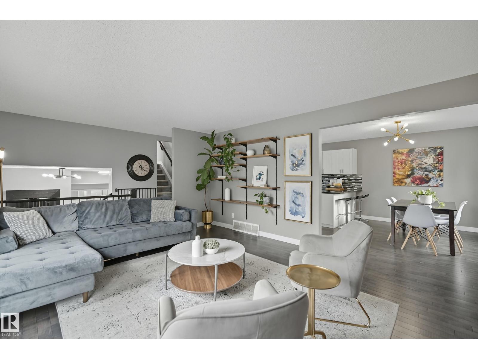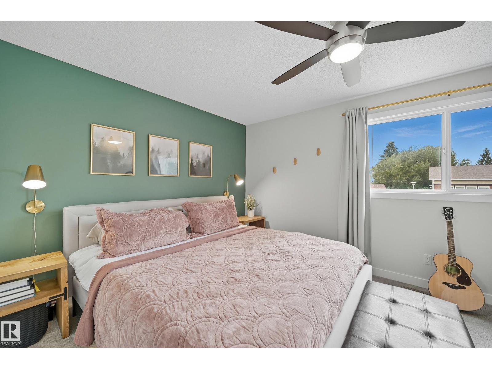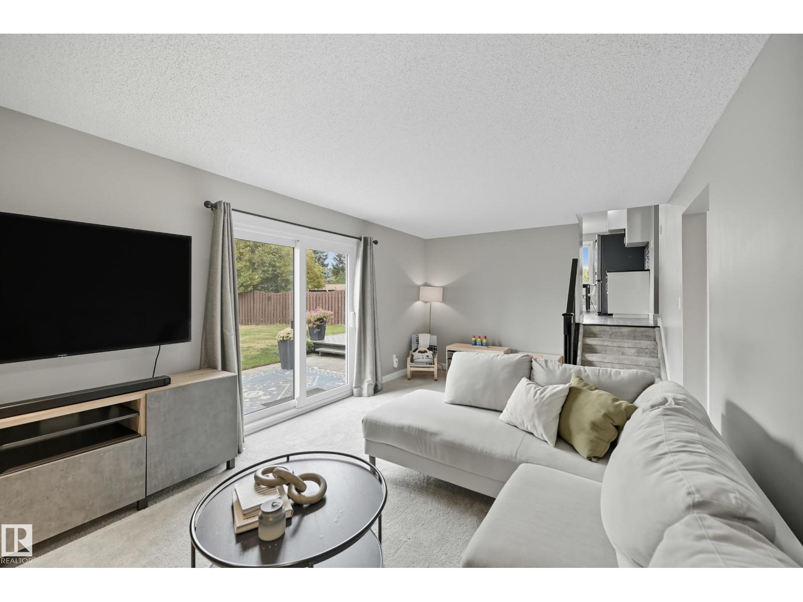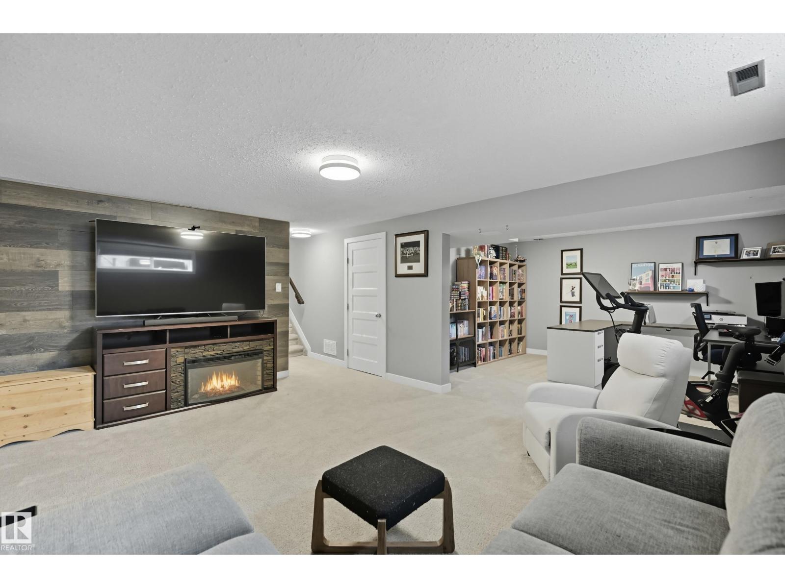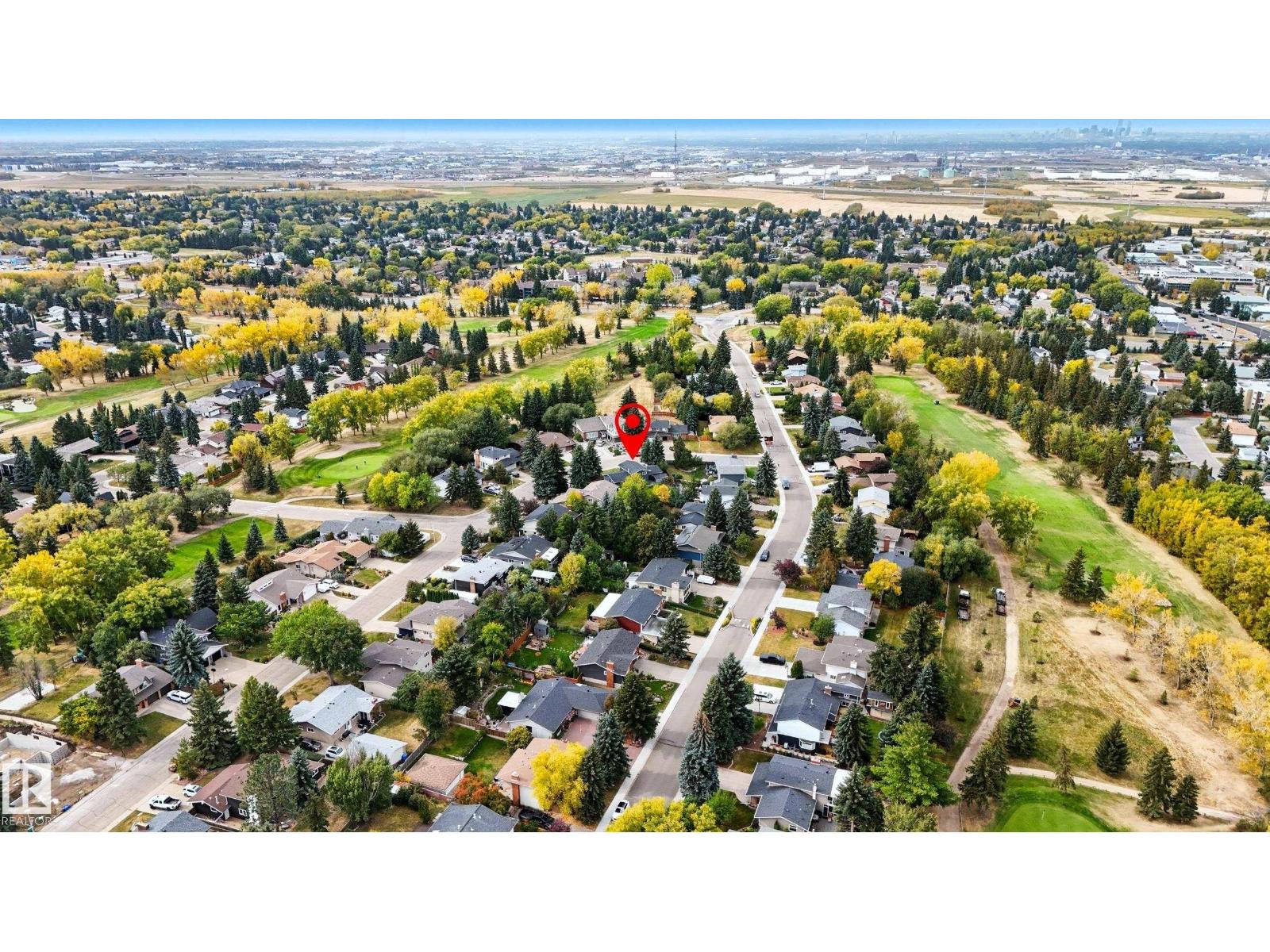 Discover this stunning 1,739 sq. ft. four-level split nestled in the prestigious Broadmoor community of Sherwood Park steps away from the golf course. This meticulously maintained home features an airy, open layout flooded with natural light from expansive windows in the massive living room. The heart of the home is an open-concept kitchen boasting a peninsula island and sleek stainless steel appliances, flowing seamlessly into a generous dining area. Upstairs, find three spacious bedrooms, including a primary retreat with a convenient 2-piece ensuite and a full 4-piece bath. The lower level offers versatility with a cozy family room anchored by a natural gas fireplace, a private office or fourth bedroom, and an additional 3-piece bathroom. Enjoy peace of mind with major updates including a new AC (2022), hot water tank (2022), and shingles (2021). The property sits on a massive, beautifully landscaped pie-shaped lot with mature trees and an attached double garage. A perfect blend of comfort and location! (id:63190)