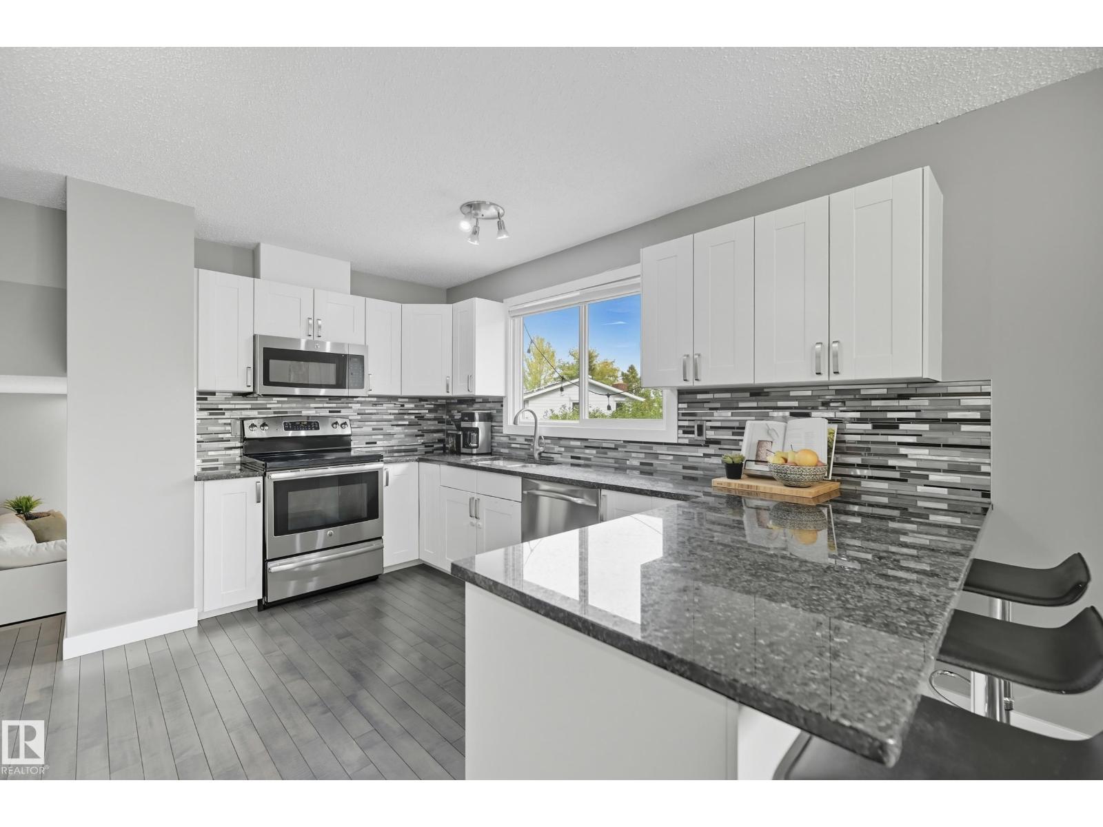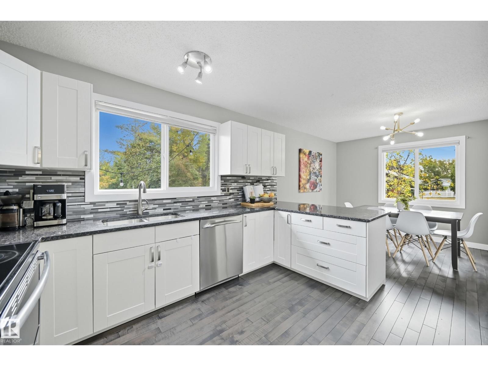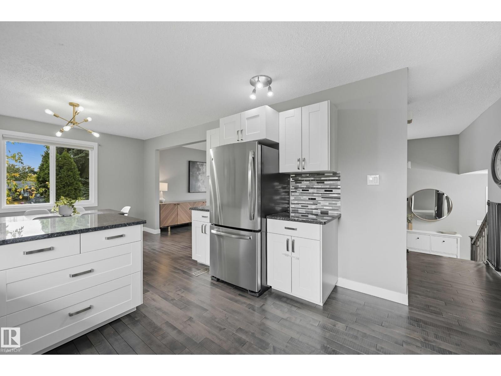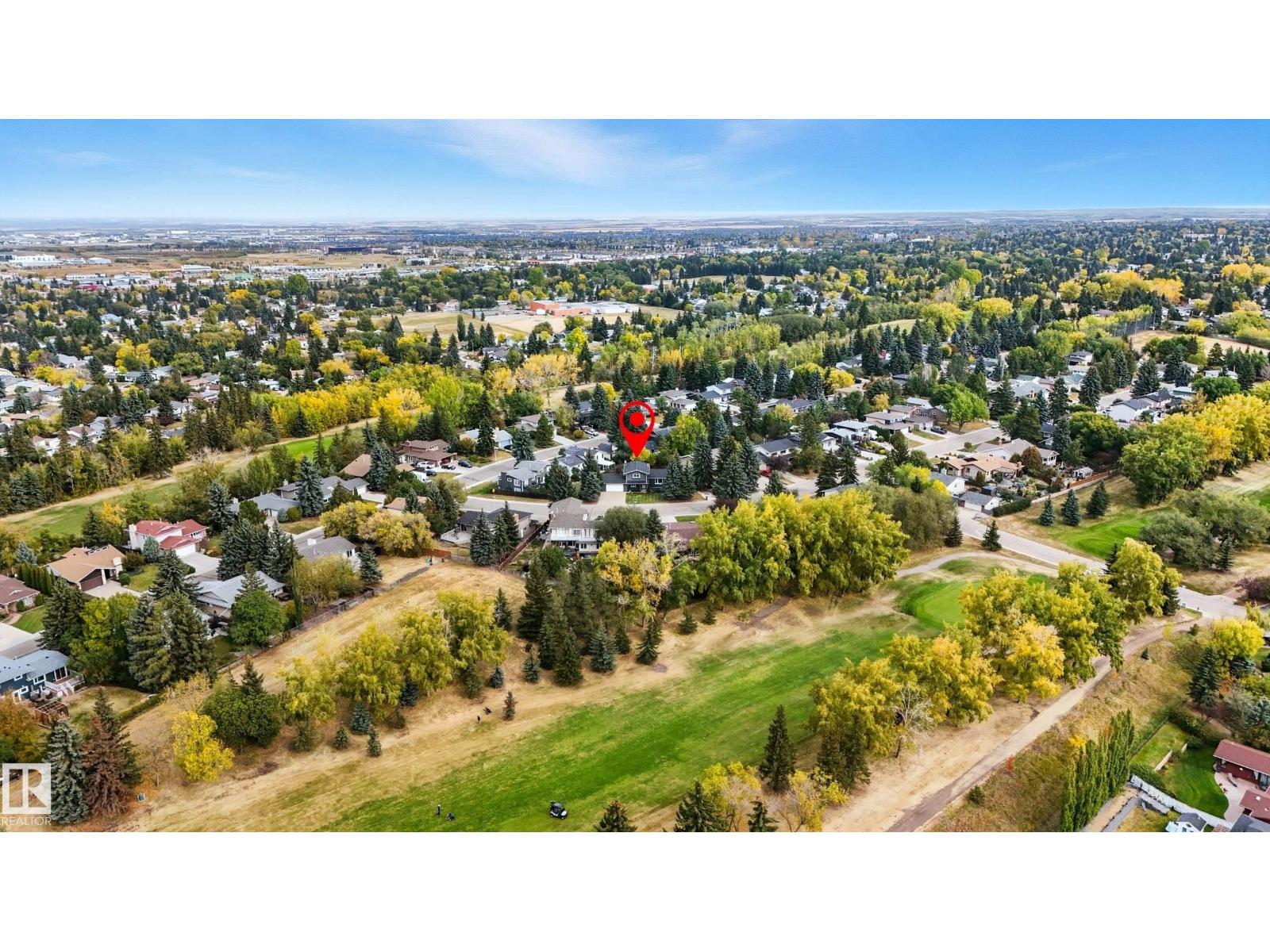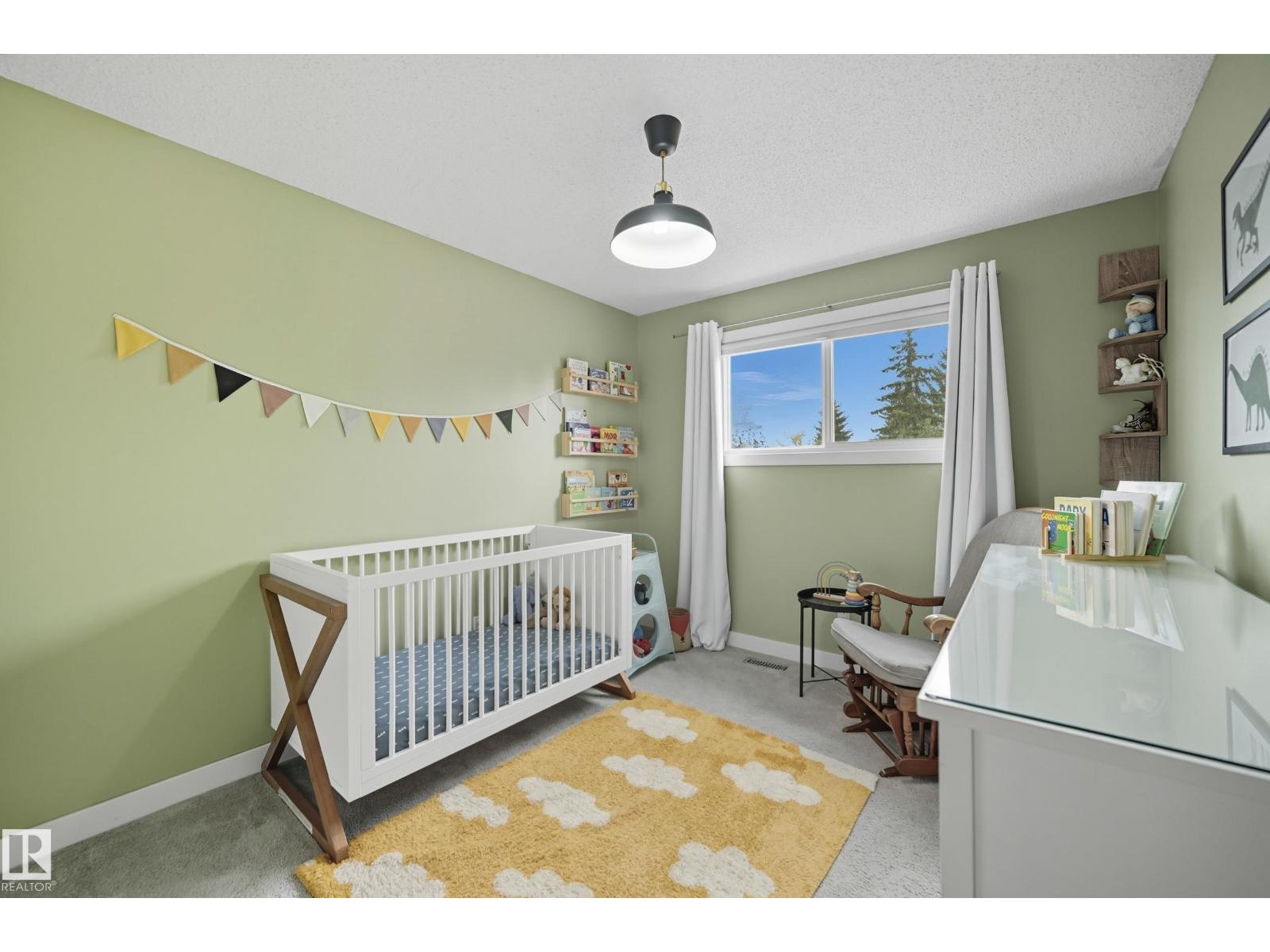 Discover this stunning 1,739 sq. ft. four-level split nestled in the prestigious Broadmoor community of Sherwood Park steps away from the golf course. This meticulously maintained home features an airy, open layout flooded with natural light from expansive windows in the massive living room. The heart of the home is an open-concept kitchen boasting a peninsula island and sleek stainless steel appliances, flowing seamlessly into a generous dining area. Upstairs, find three spacious bedrooms, including a primary retreat with a convenient 2-piece ensuite and a full 4-piece bath. The lower level offers versatility with a cozy family room anchored by a natural gas fireplace, a private office or fourth bedroom, and an additional 3-piece bathroom. Enjoy peace of mind with major updates including a new AC (2022), hot water tank (2022), and shingles (2021). The property sits on a massive, beautifully landscaped pie-shaped lot with mature trees and an attached double garage. A perfect blend of comfort and location! (id:63190)