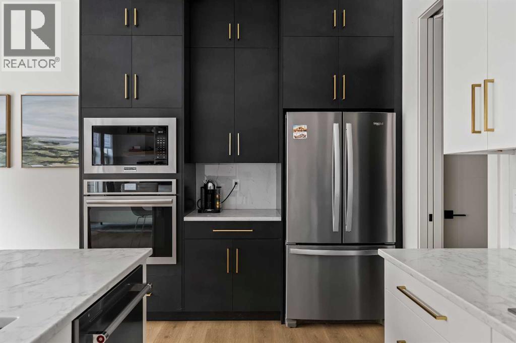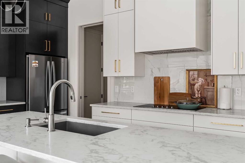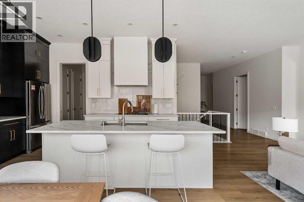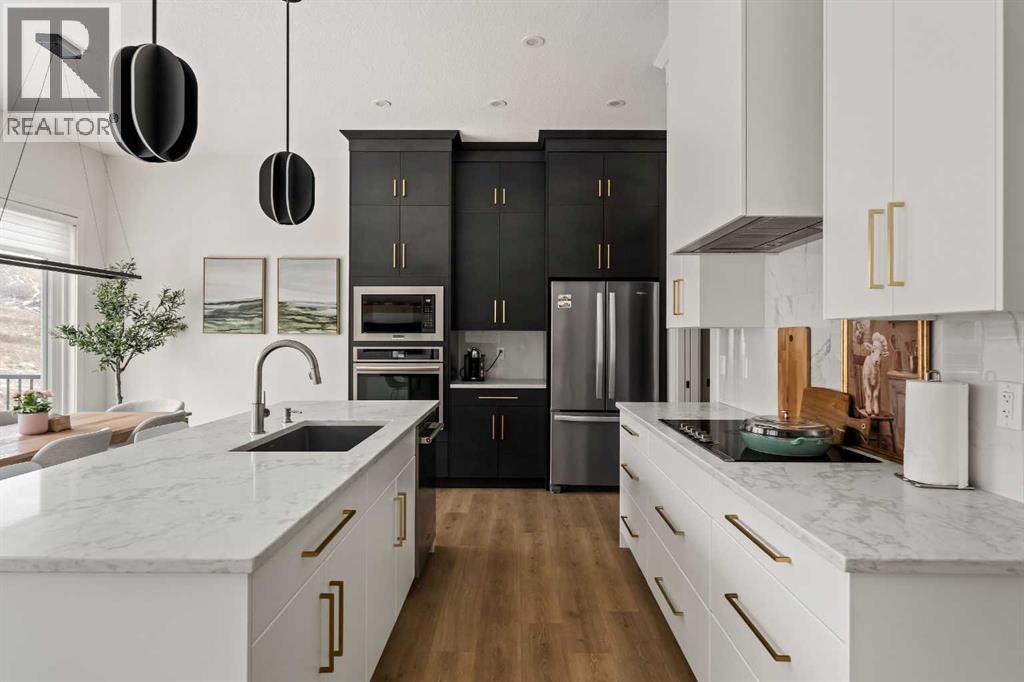 AMAZING PRICE. An Exceptional Luxury Residence offering unobstructed views of the picturesque escarpment hills in Cranston’s prominent community of Riverstone. Nestled on a quiet cul-de-sac pie lot in the Bow River Valley & surrounded by the natural scenery of Fish Creek Park this like-new custom bungalow is the perfect balance of relaxed sophistication, contemporary design & thoughtful functionality.The inspired interior delivers over 2700 SF of curated living space where the main floor’s open kitchen, dining & living areas showcase high calibre finishes. Two-toned extended cabinets, stunning quartz, & stainless-steel appliances bring style & function to the luxe kitchen boasting a wealth of storage, induction stove-top, quartz counters, oversized pantry & an island with seating for 3.The dining & living areas sit across a backdrop of expansive glass with viewpoints to the escarpment & provides access to the rear deck. A custom credenza & floating shelves elevate the inviting fireplace bringing an air of casual elegance to the sunlit living room. The spacious owner’s suite features a large primary bedroom with beautiful views & gorgeous floor-to-ceiling window coverings, an indulgent spa-like ensuite with dramatic vanity & tiling, luxurious stand-alone tub, separate oversized shower & heated floors! Built-in shelving provides organization to the walk-in closet while a folding table & extra storage bring added convenience to the laundry room. Completing the main floor is a charming powder room detailed with designer wallpaper & a spacious mudroom offering ample room for storage & a small workstation. The warm vinyl plank flooring extends down the staircase & throughout the fully developed walk-out lower level. Finished to the same exacting standards this floor likewise enjoys uninterrupted views while providing direct access to the lovely patio.Two generous bedrooms offer flexibility for a variety of lifestyle needs — one capturing the escarpment views & boasting cu stom drapery & the other featuring its own walk-in closet making them equally well-suited as a guest room, home office, or a gym. A 2nd full bathroom with heated floors rounds off this delightful level. Not to be outdone by the extraordinary interior, the exterior’s sleek appearance creates a sense of arrival. The private backyard is a peaceful spot to host summer barbecues or simply unwind under the stars. Other highlights of this remarkable property incl. 1) 10’ ceilings & 8’ doors, 2) ceiling speakers, 3) water softener, 4) a/c & 5) double garage with additional height & wired for EV charger. Please see a full list of features in the supplements. A short stroll to the river & scenic pathways & easy access to Deerfoot & Stoney Trails & the Cranston Resident’s Association at Century Hall offering indoor & outdoor recreational amenities, programs & events, & banquet & meeting room rentals. This exquisite gem delivers it all – a beautiful home nestled in nature, an active lifestyle & a connected community. (id:63190)