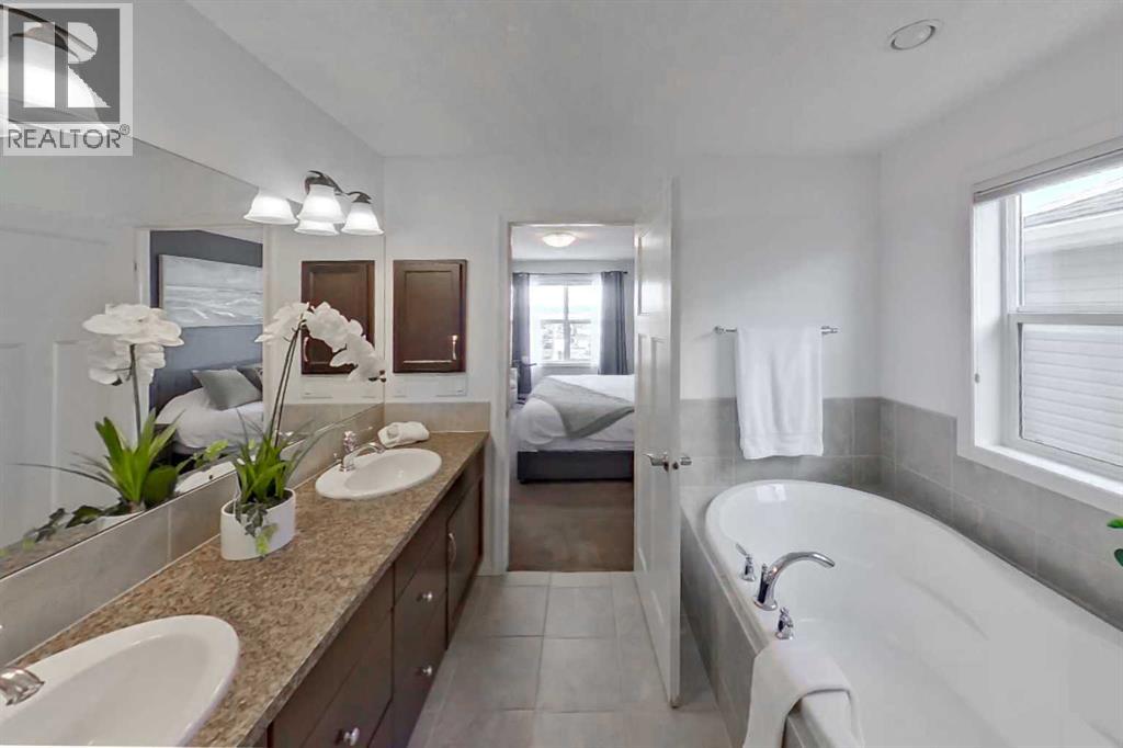 BEAUTY BACKED BY EFFICIENCY || MEGA MOUNTAIN VIEWS + SOLAR POWERED LIVING. Welcome to this exceptional walkout home in the highly sought-after community of Sunset Ridge in Cochrane, offering breathtaking mountain views from all three levels and backing directly onto a park—an ideal setting for families who value space, serenity, and community. From the moment you arrive, the expansive views set the tone for this special property. Inside, a large foyer with ceramic tile welcomes you and leads into a bright open-concept main floor featuring warm hardwood flooring throughout the kitchen, dining, and living areas. Designed for both everyday living and entertaining, the spacious kitchen offers abundant cabinetry, a large island, and raised breakfast bar seating. The dining area opens onto the back deck where you can soak in the panoramic mountain vistas, watch the kids play in the park behind, or enjoy grilling with friends using the natural gas BBQ hookup. The inviting living room features a gas fireplace, creating a warm and comfortable gathering space while taking in the spectacular views. Upstairs, the home continues to impress with a thoughtfully designed layout. The upper level includes three bedrooms, a huge bonus room with soaring 10-foot ceilings, a convenient laundry room, and a dedicated tech desk with two workspaces—perfect for homework, remote work, or family organization. The primary suite is a true retreat, featuring breathtaking mountain views, ample space for a king-sized bed, and a practical five-piece ensuite bathroom that leads to your walk-in closet.The fully developed walkout basement provides additional living space and flexibility with vinyl plank flooring throughout. This level includes a fourth bedroom, a full bathroom, office or flex space (a rough-in behind the wall allows for easy future installation of a bar or craft sink), and a bright recreation room with endless possibilities. Step outside to the beautifully finished lower patio with pa ver stones and rough-in wiring for a future hot tub. The yard is generously sized and opens directly toward the park, enhancing the sense of space and enjoyment of your outdoor living area. This home also offers thoughtful upgrades for comfort and efficiency, including a Zeno solar panel system to help reduce energy costs and environmental impact. The system includes a microgeneration permit, allowing the homeowner to sell excess electricity back to the utility grid. A radon mitigation system is also installed to help reduce indoor radon levels. A double attached garage and extra-deep driveway provide ample parking and convenient space for larger vehicles or loading up before a weekend of camping. Sunset Ridge is one of Cochrane’s most desirable family communities, known for its scenic pathways, parks, and mountain views. (id:63190)