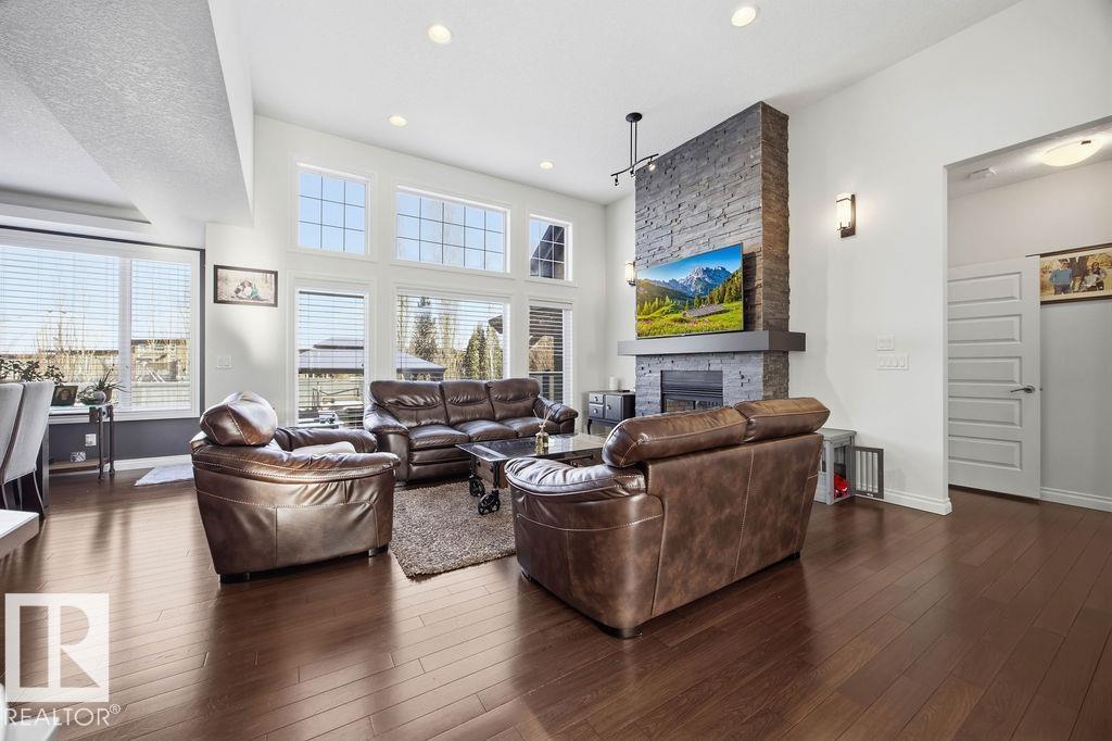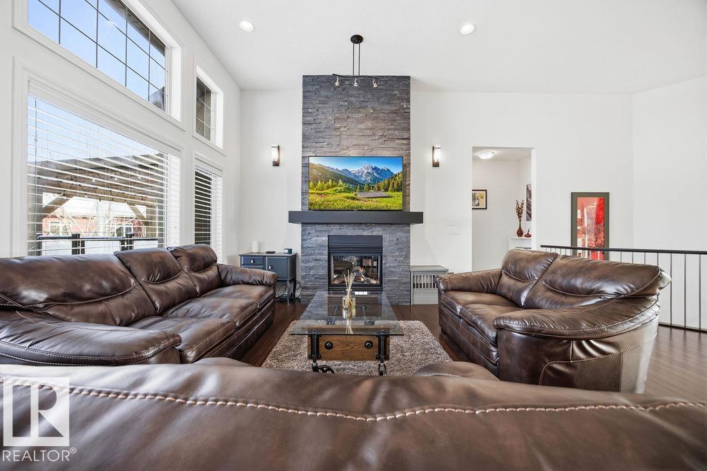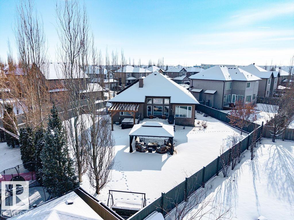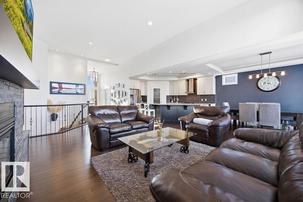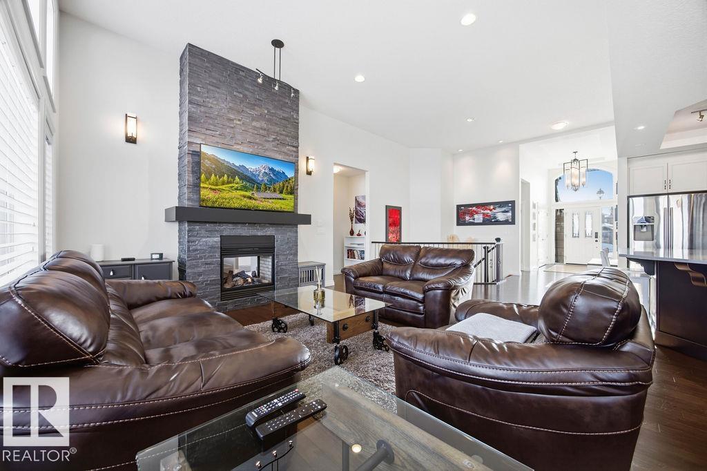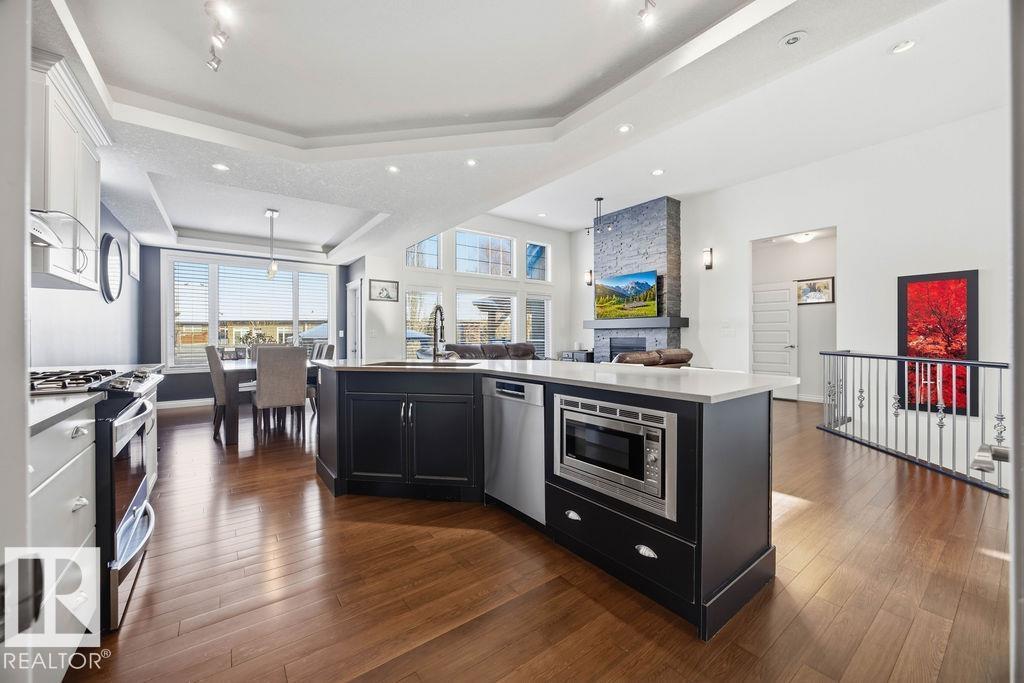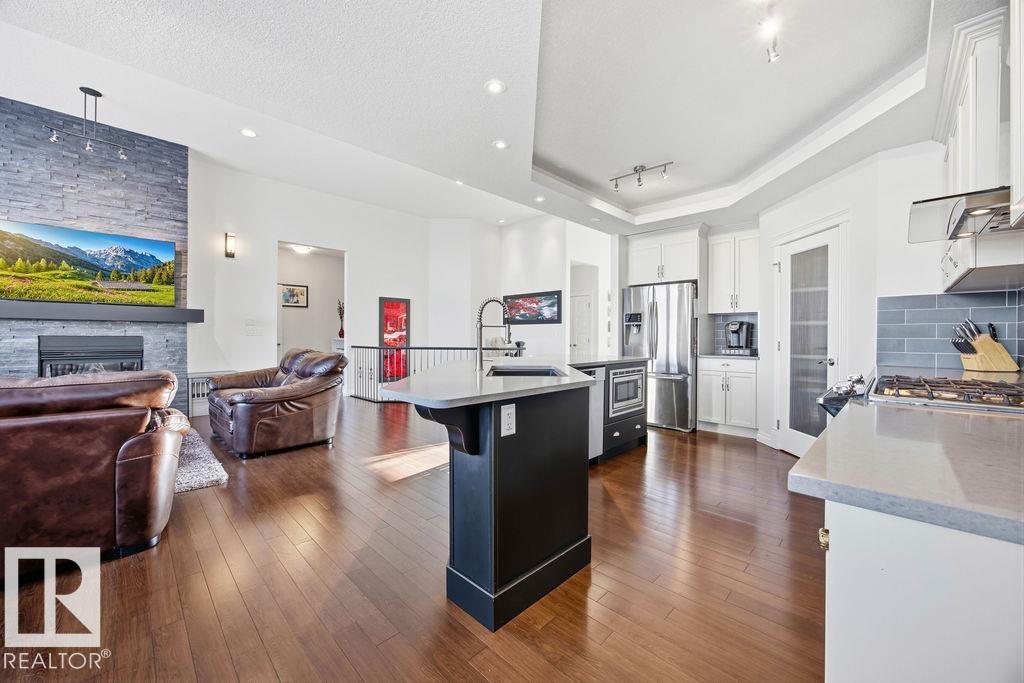 Lovely 1902 sq ft Bungalow with DREAM CAR TRIPLE GARAGE and fully fin basement located in Place Chaleureuse.Bright open design with coffered ceilings and hardwood galore on your main floor.Enjoy your dream kitchen with high end appliances,corner pantry,large center island,quartz tops and elegant back splash.Your dining overlooks a large mtce free deck with glass rail and enormous back yard with underground sprinkler with gazebo,pergola,hot tub and stamp concrete patio.Your living room has a showcase stone fireplace and there is also a double door executive den.Your primary bdrm has a fireplace and gorgeous ensuite with his & her sinks and glass shower.There is a 4 pce bath and 2nd bedroom with convenience of main floor laundry.Down stairs has in floor heat,2 additional bdrms,4 pce bathroom and a large recroom with wet bar and a 120 in screen with projector for movie nights.Other features include central air,water softner,water filtration system,heater in garage and aggregate driveway. A must SEE. (id:63190)