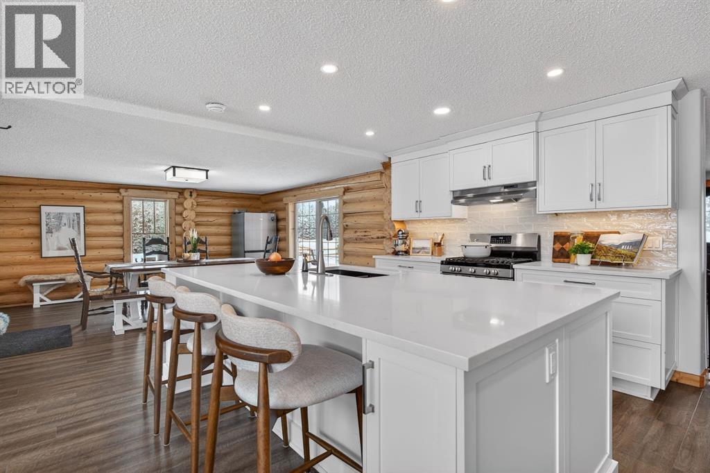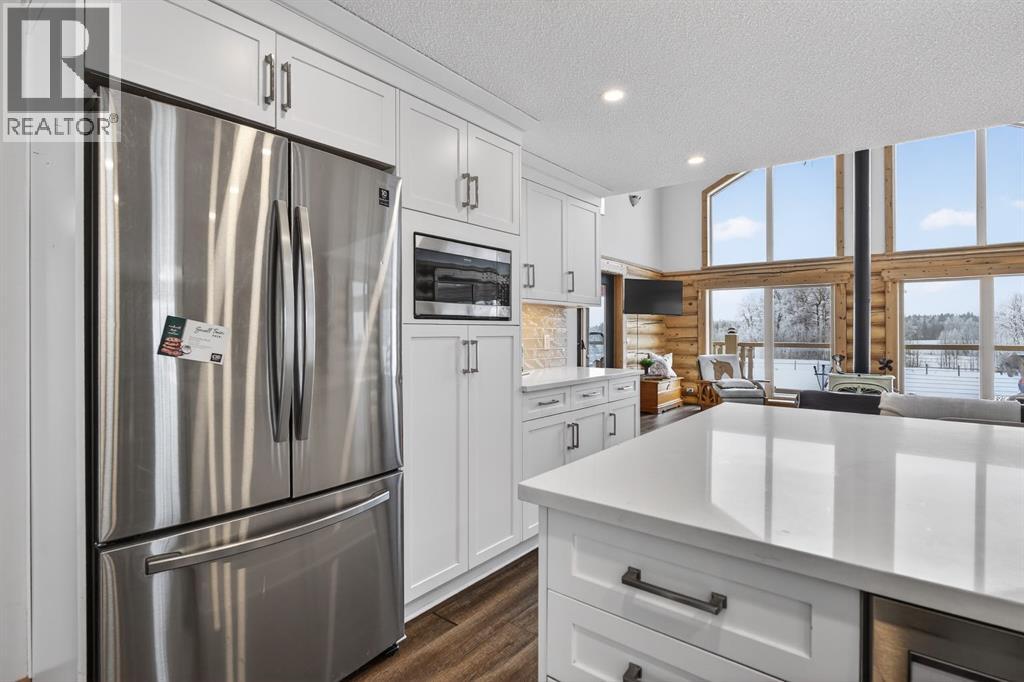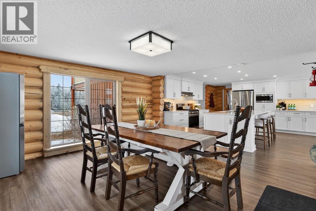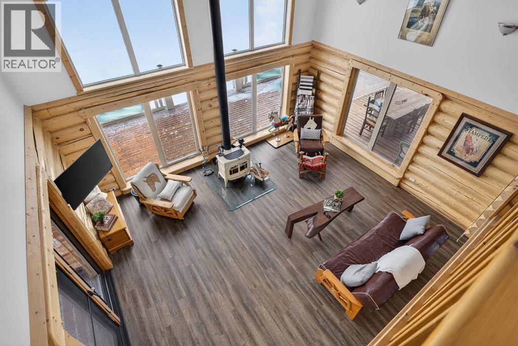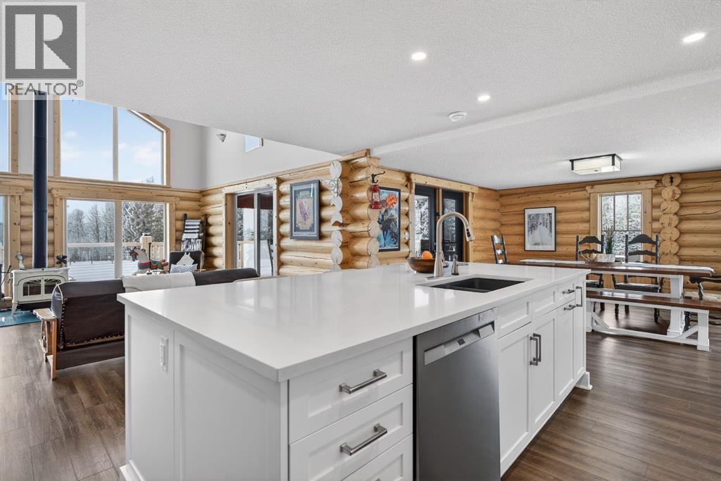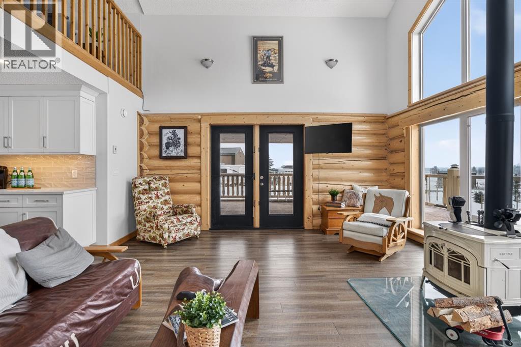 ‘A Better Place’ is just down the road on Township Road 320. This STUNNING log home features an impressive amount of square footage, 5 bedrooms, 3.5 bathrooms, two living spaces and a modern open concept kitchen. When you step through the front door, home greets you with warmth—a view right through to the south facing windows and a wood burning stove. In this front entry way are ‘his’ and ‘hers’ closets, as well as a newly completed stacked laundry room and half bath. Wander through the home into the modern kitchen (woodkraft kitchens) which features soft closing doors and granite countertops. Never get bored of your dishwashing view again. A well appointed dining room for family gatherings await you, and there is a beautiful balance between indoor and outdoor gathering spaces. This level also includes a wrap around deck featuring full views of your new property. The living room centers itself on floor to ceiling windows and a wood burning stove….perfect for your morning coffee and late evening tea. On the main level you will also locate a primary bedroom, complete with large wall in closet and ensuite—access to the deck is included in this room. Venture upstairs to discover the ultimate loft looking down on your main living space. This loft is a great flex room, connecting to a full bathroom and bedroom with significant closet space. This upstairs bedroom features a unique separate patio off of French doors. In the walkout basement there are three oversized bedrooms, a full bathroom with tub, storage for days, and a great family area for TV or games nights. As impressive as the house is, the boiler system is equally impressive and is newly updated. This boiler system is one of two—there is also a new boiler system in the detached shop/garage space, as well as a newly installed separate septic tank for a shop bathroom. This shop has seen significant upgrades including an 8” poured concrete floor. Outside discover a horse setup that includes cross fe ncing around the pasture, and new Ritchie Waterers. Step into country living knowing the setup is already READY TO GO. This gem of a home and acreage is seeking new ownership…….is that you? Call your Realtor to book a showing-it won’t dissapoint. (id:63190)