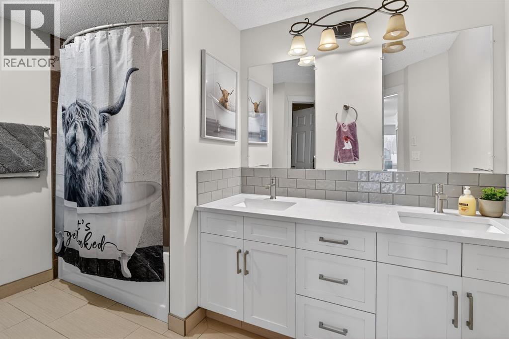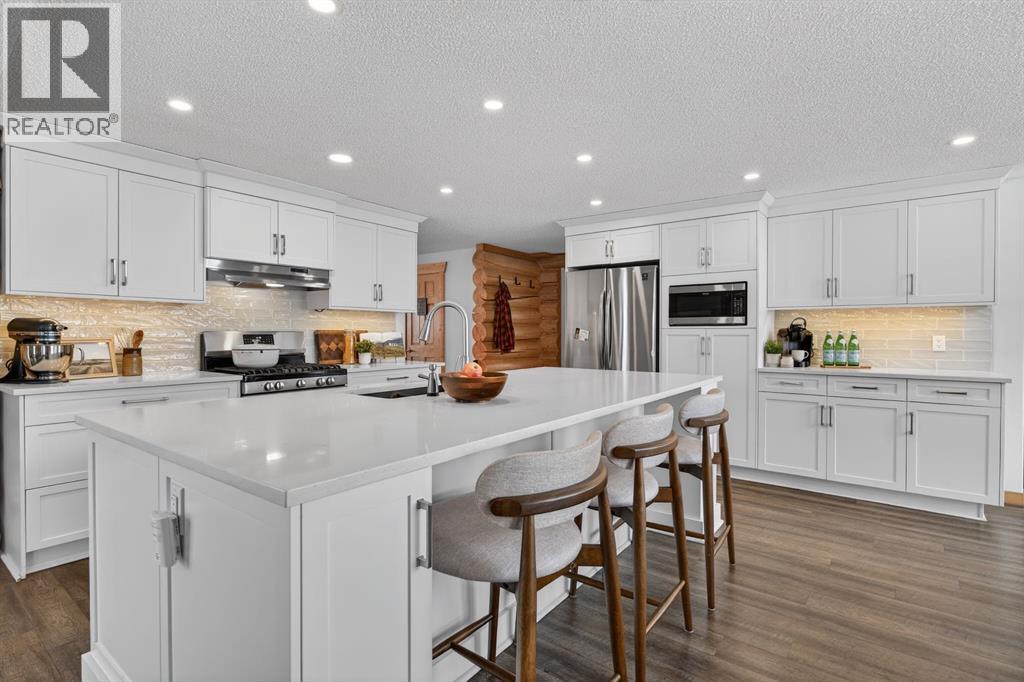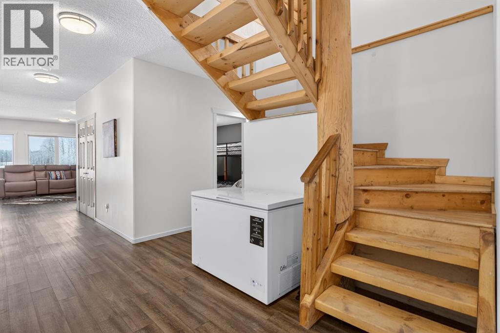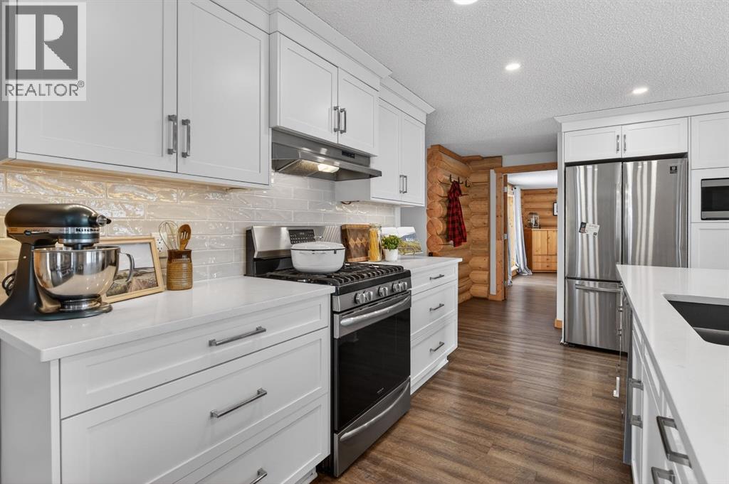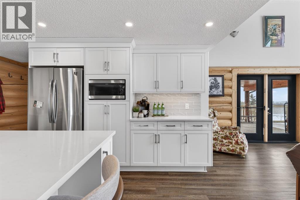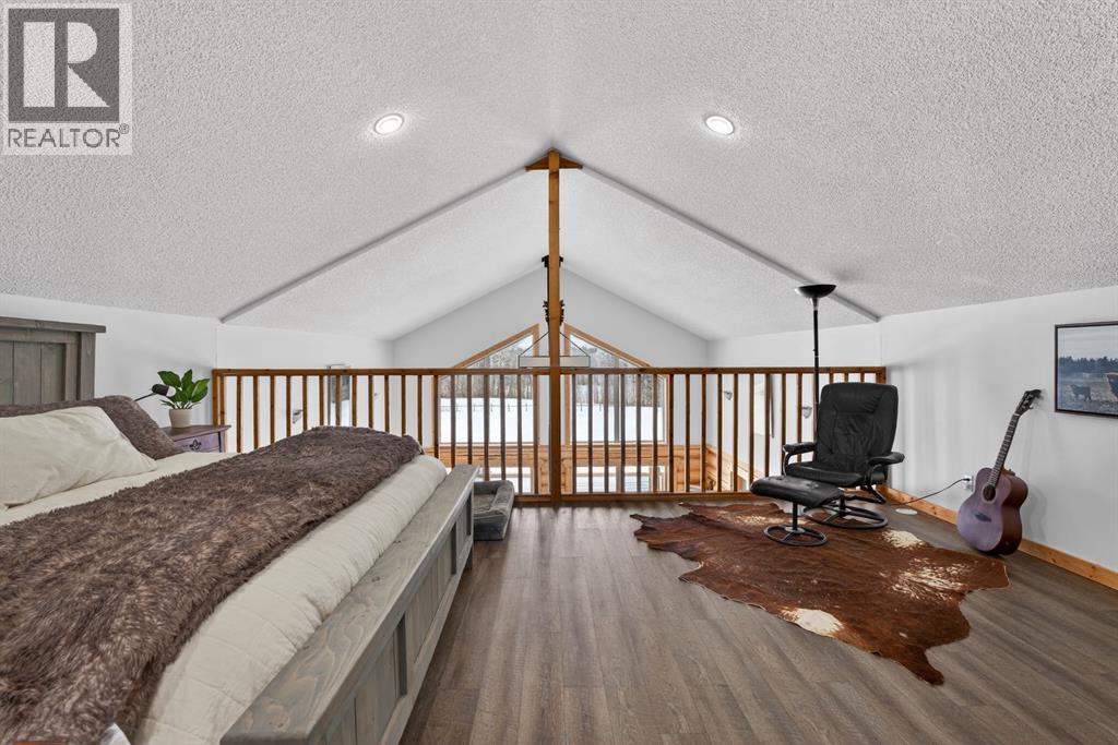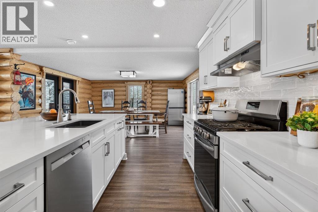 ‘A Better Place’ is just down the road on Township Road 320. This STUNNING log home features an impressive amount of square footage, 5 bedrooms, 3.5 bathrooms, two living spaces and a modern open concept kitchen. When you step through the front door, home greets you with warmth—a view right through to the south facing windows and a wood burning stove. In this front entry way are ‘his’ and ‘hers’ closets, as well as a newly completed stacked laundry room and half bath. Wander through the home into the modern kitchen (woodkraft kitchens) which features soft closing doors and granite countertops. Never get bored of your dishwashing view again. A well appointed dining room for family gatherings await you, and there is a beautiful balance between indoor and outdoor gathering spaces. This level also includes a wrap around deck featuring full views of your new property. The living room centers itself on floor to ceiling windows and a wood burning stove….perfect for your morning coffee and late evening tea. On the main level you will also locate a primary bedroom, complete with large wall in closet and ensuite—access to the deck is included in this room. Venture upstairs to discover the ultimate loft looking down on your main living space. This loft is a great flex room, connecting to a full bathroom and bedroom with significant closet space. This upstairs bedroom features a unique separate patio off of French doors. In the walkout basement there are three oversized bedrooms, a full bathroom with tub, storage for days, and a great family area for TV or games nights. As impressive as the house is, the boiler system is equally impressive and is newly updated. This boiler system is one of two—there is also a new boiler system in the detached shop/garage space, as well as a newly installed separate septic tank for a shop bathroom. This shop has seen significant upgrades including an 8” poured concrete floor. Outside discover a horse setup that includes cross fe ncing around the pasture, and new Ritchie Waterers. Step into country living knowing the setup is already READY TO GO. This gem of a home and acreage is seeking new ownership…….is that you? Call your Realtor to book a showing-it won’t dissapoint. (id:63190)