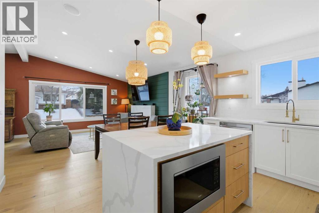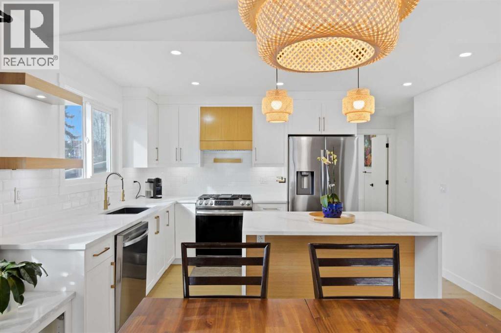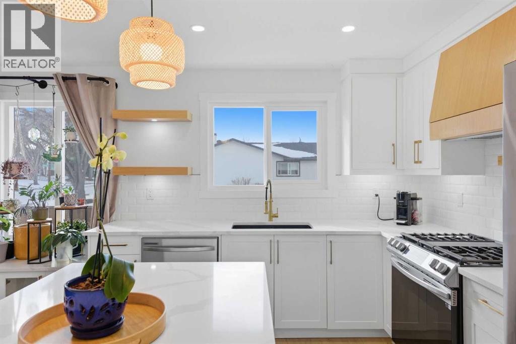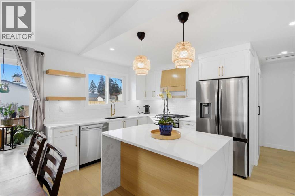 Welcome to this exceptionally renovated 4-bedroom home situated on a premium corner lot inthe established community of Queensland, which is framed by mature trees adding a feeling ofnatural charm. Thoughtfully upgraded throughout, this home blends modern design withtimeless comfort. You’ll feel the warm, inviting atmosphere the moment you step inside,highlighted by bright recessed lighting, natural Light, high vaulted ceilings, and custom in-ceiling speakers.On the main floor, the spacious primary retreat with a striking feature wall truly stands out! Thespa Inspired ensuite features a walk-in glass shower, deep soaker tub, a double vanity withelegant finishes and a dream walk-in closet. Paired with a second bedroom and a seamless flowfrom the kitchen to the living room, which is filled with bright south-facing sunlight. The fullydeveloped lower level creates the perfect gathering space, complete with a stylish wet bar and cozy lounge area ideal for hosting family & friends. Finishing off the basement with 2 fullbedrooms, laundry and storage.Step outside to your covered outdoor oasis, a peaceful extension of the home- perfect forenjoying Calgary’s summer evenings. The expansive corner lot provides additional yard spacefor recreation and outdoor living, all enclosed by a brand-new fully fenced backyard with anoversized double gate for easy trailer or small equipment access.The home’s exterior showcases Hardie board siding, providing exceptional durability along witha clean, upscale aesthetics designed to stand the test of time. Inside all major appliances,drywall, windows, spray foam insulation, HVAC, hot water tank, plumbing pipes, electricalwiring, and roof have been updated within the past two years offering peace of mind andmodern efficiency. Those hot Alberta summers are no match for the recently installed central AC!Families, car enthusiasts and hobbyists will appreciate the rare garage configuration that offer's adouble oversized de tached garage plus a single attached garage, both featuring durable epoxyfloors. The single attached garage offer's the added convenience of a functional boot room entryinto the home. With its proximity located just a short walk from a dog park, Fish Creek Provincial Park, schools,pathways and everyday amenities, this home delivers the perfect balance of nature,convenience, and refined living in one of Calgary’s most welcoming communities. Beautifully upgraded, perfectly located, and thoughtfully designed, this is a rare opportunity toown a truly standout home in Queensland. (id:63190)