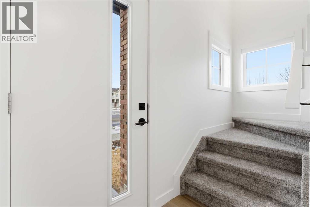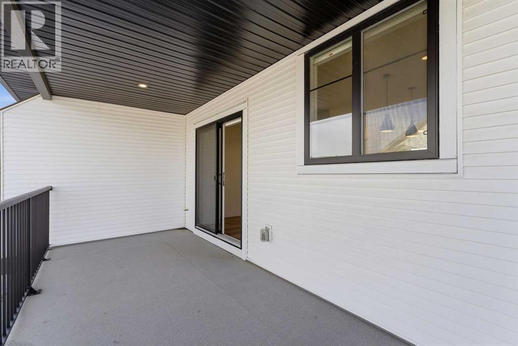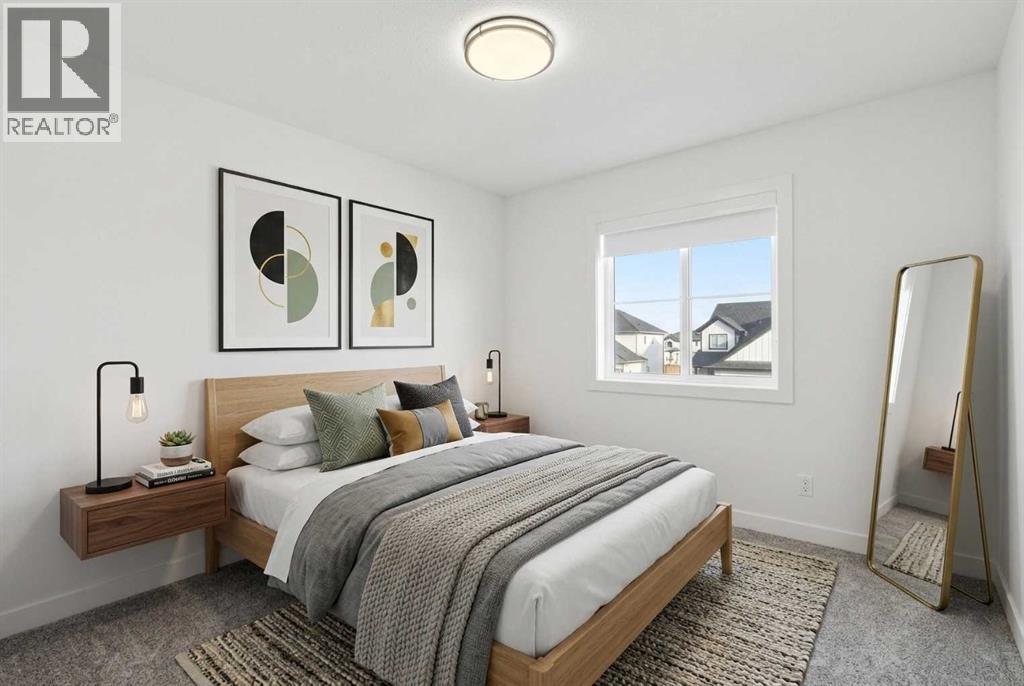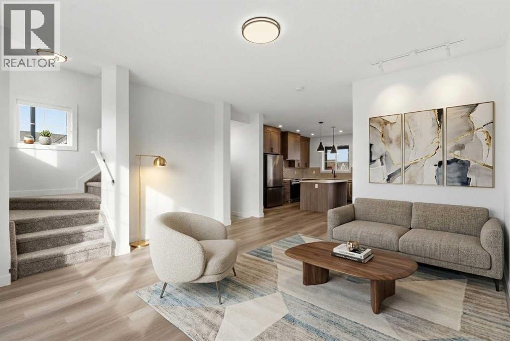 A sophisticated award winning END Unit 3-storey a Vesta Elevate Collection nested in Cooper’s Crossing, an 13th-time recipient of Airdrie’s "Best Community" award. This modern masterpiece seamlessly blends contemporary architecture with upscale interior finishes, offering a versatile layout that includes 3 bedrooms, 2.5 bathrooms, and a ground-floor flex room perfect for a home office or gym. The heart of the home is a bright, open-concept main floor anchored by a gourmet kitchen featuring full-height cabinetry, sleek modern finishes, and generous prep space that flows effortlessly into the dining and living areas. Upstairs, the deluxe primary suite serves as a private retreat, complemented by secondary bedrooms that are impressively oversized compared to typical townhome designs. Beyond the stylish interior, this home boasts a rare and highly coveted parking setup: a double attached garage plus two additional private driveway stalls. Perfectly positioned across from Cooper’s Town Promenade, you’ll enjoy walkable access to Starbucks, Save-On-Foods, and local dining, while nearby parks and school. This the ultimate low-maintenance sanctuary for professionals and families alike who refuse to compromise on convenience for "elevated" living. Please note: Entrance Level 235 total sq ft, living space 675 total sq ft, Upper level (bedrooms) 681 sq ft. (id:63190)