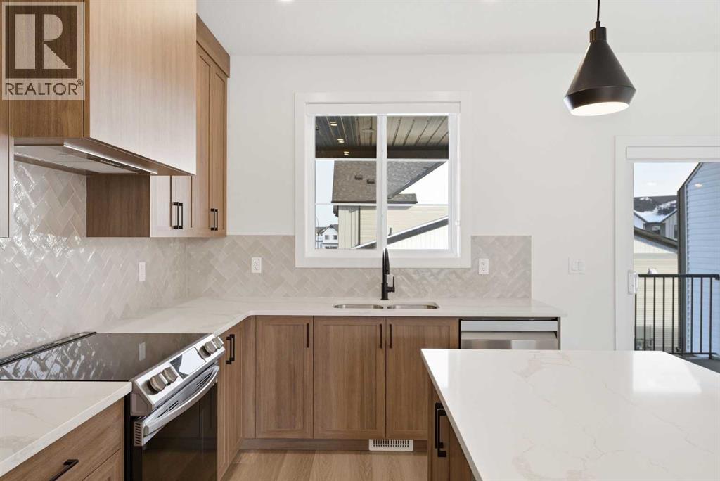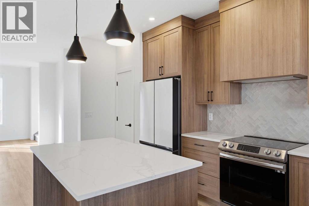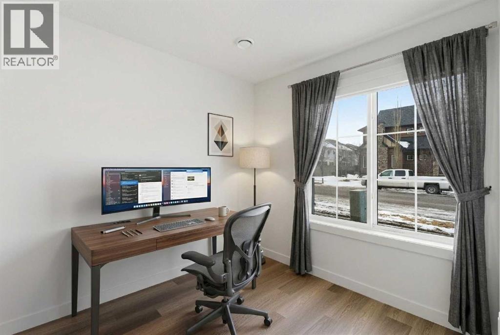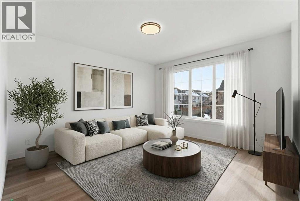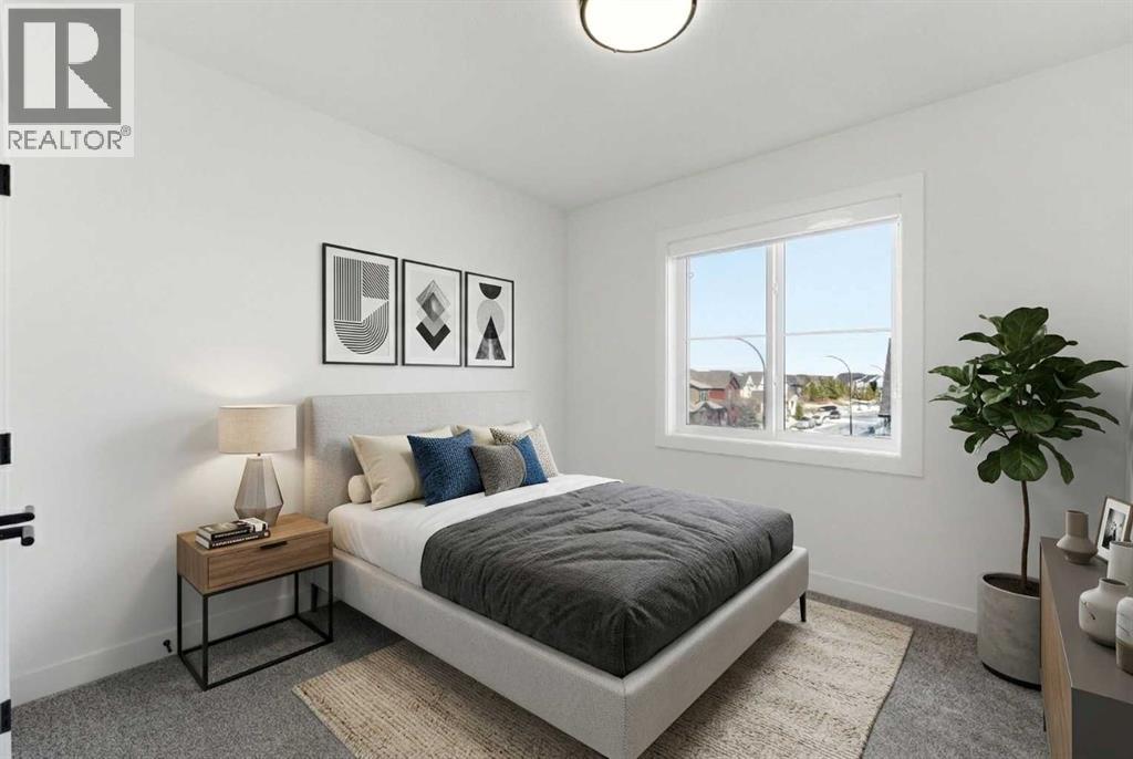 A sophisticated award winning END Unit 3-storey a Vesta Elevate Collection nested in Cooper’s Crossing, an 13th-time recipient of Airdrie’s "Best Community" award. This modern masterpiece seamlessly blends contemporary architecture with upscale interior finishes, offering a versatile layout that includes 3 bedrooms, 2.5 bathrooms, and a ground-floor flex room perfect for a home office or gym. The heart of the home is a bright, open-concept main floor anchored by a gourmet kitchen featuring full-height cabinetry, sleek modern finishes, and generous prep space that flows effortlessly into the dining and living areas. Upstairs, the deluxe primary suite serves as a private retreat, complemented by secondary bedrooms that are impressively oversized compared to typical townhome designs. Beyond the stylish interior, this home boasts a rare and highly coveted parking setup: a double attached garage plus two additional private driveway stalls. Perfectly positioned across from Cooper’s Town Promenade, you’ll enjoy walkable access to Starbucks, Save-On-Foods, and local dining, while nearby parks and school. This the ultimate low-maintenance sanctuary for professionals and families alike who refuse to compromise on convenience for "elevated" living. Please note: Entrance Level 235 total sq ft, living space 675 total sq ft, Upper level (bedrooms) 681 sq ft. (id:63190)