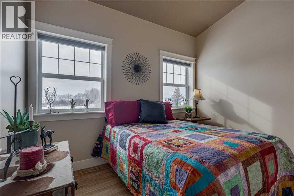 Private, 21 acres surrounded by farmland, offering exceptional privacy and peaceful country living! Set back from the road and sheltered by mature trees, this AG-zoned property provides the space and freedom acreage buyers are looking for. A circular asphalt driveway at the front of the home provides convenient access and a welcoming approach to the property. Inside, a bright entry leads to the upper level. The main/ground floor offers a comfortable living area, a flexible den currently being used as a bedroom, and a 3-piece bathroom. The space is generously sized with room for a desk or small table in addition to bedroom furniture. Double doors from this area open onto a large patio, privately screened with decorative lattice- an ideal space for a future hot tub! The laundry and utility room is also located on the main floor and houses the boiler system for in-floor heating, along with a high-efficiency furnace. Convenient access to the double attached heated garage is also located on the main level. Upstairs, the living space opens beautifully with cathedral ceilings and dormer windows that bring in natural light while adding architectural character. Hardwood floors and wide mouldings create warmth throughout the space, while a gas fireplace adds comfort to the living area. The kitchen offers generous cabinetry, a large pantry, and an easy flow into the dining and living spaces. There are two bedrooms on the upper level, including the primary. A 4-piece bathroom connects the primary bedroom and living area in a Jack & Jill layout, creating an ensuite-style setup while still allowing convenient access from the living area. If upper-level laundry is required there is a set of hook ups available. Outside, the property continues to impress with beautiful landscaping. The pergola and firepit area create a comfortable outdoor gathering space, while several sheds provide additional storage. A seasonal creek flows 2-3 weeks of the year adding to the natural beauty of the property. Mature trees offer natural wind protection and privacy throughout the yard. A rare opportunity to enjoy a large parcel of land, quiet country living with space, privacy, and endless potential! (id:63190)