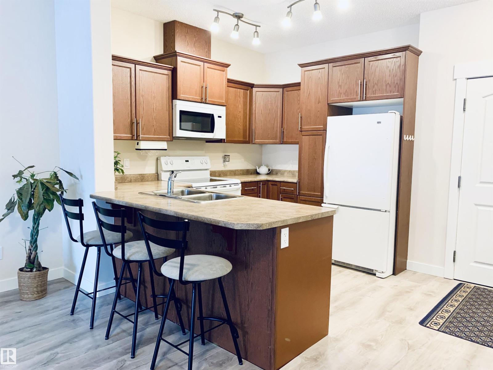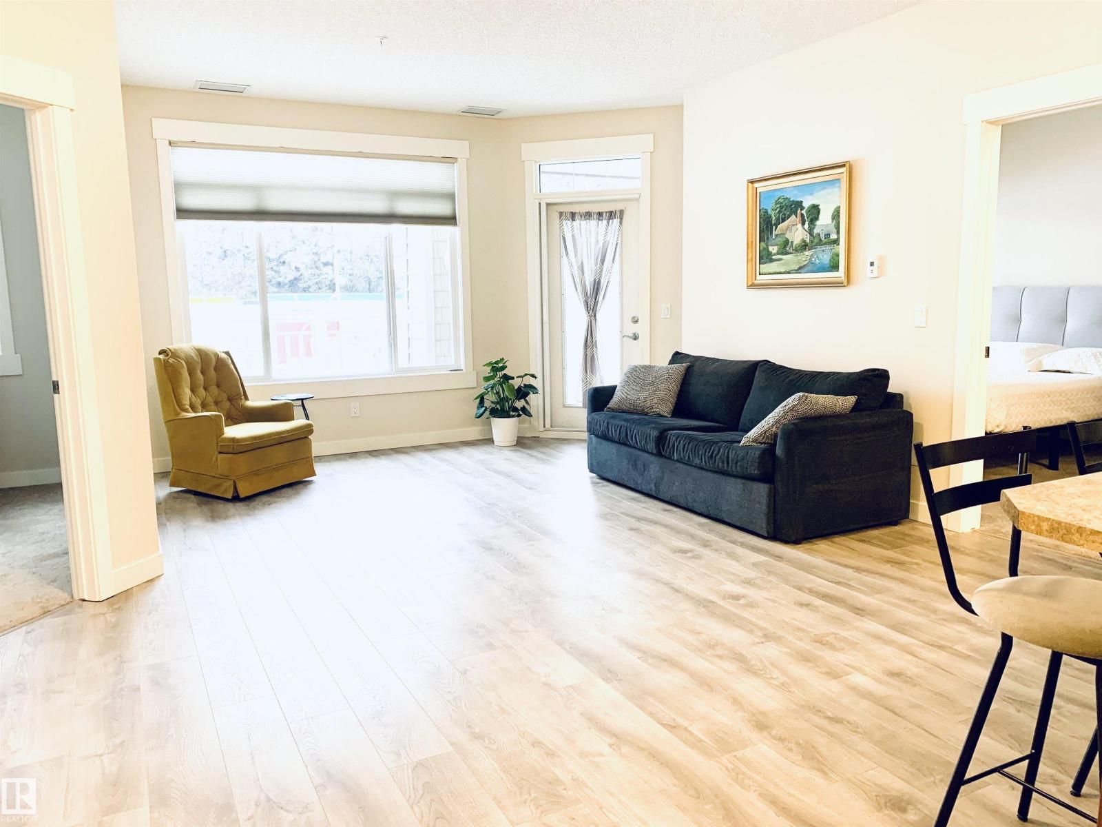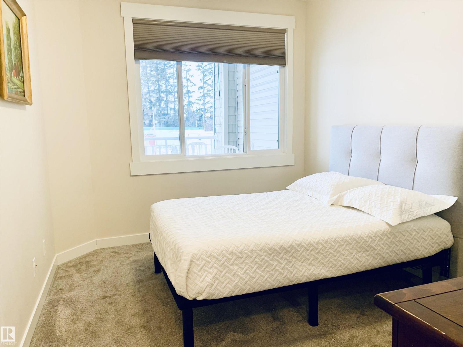 Enjoy the luxuries of living and settle into your new home at #116 Windsor Estates! 55+ condo living at its best. This bright 2-bedroom, 2-bathroom home offers 891 sq. ft. of functional living space. The primary bedroom features a walk-in closet and 3-piece ensuite with walk-in shower, while the second bedroom is steps from the 4-piece main bath. Upgraded flooring and fresh paint were completed in Fall 2024. Enjoy large windows, an extra-large west-facing covered balcony, in-suite laundry with storage cabinetry, air conditioning, and heated underground parking with secured storage. Included appliances: refrigerator, stove, built-in dishwasher, built-in microwave/range hood fan, washer, dryer, stand-up deep freezer, and window coverings. Building amenities include a theatre room, exercise room, social room, games area, guest suites, and car wash. Walking distance to downtown Spruce Grove and Queen Street Place. (id:63190)