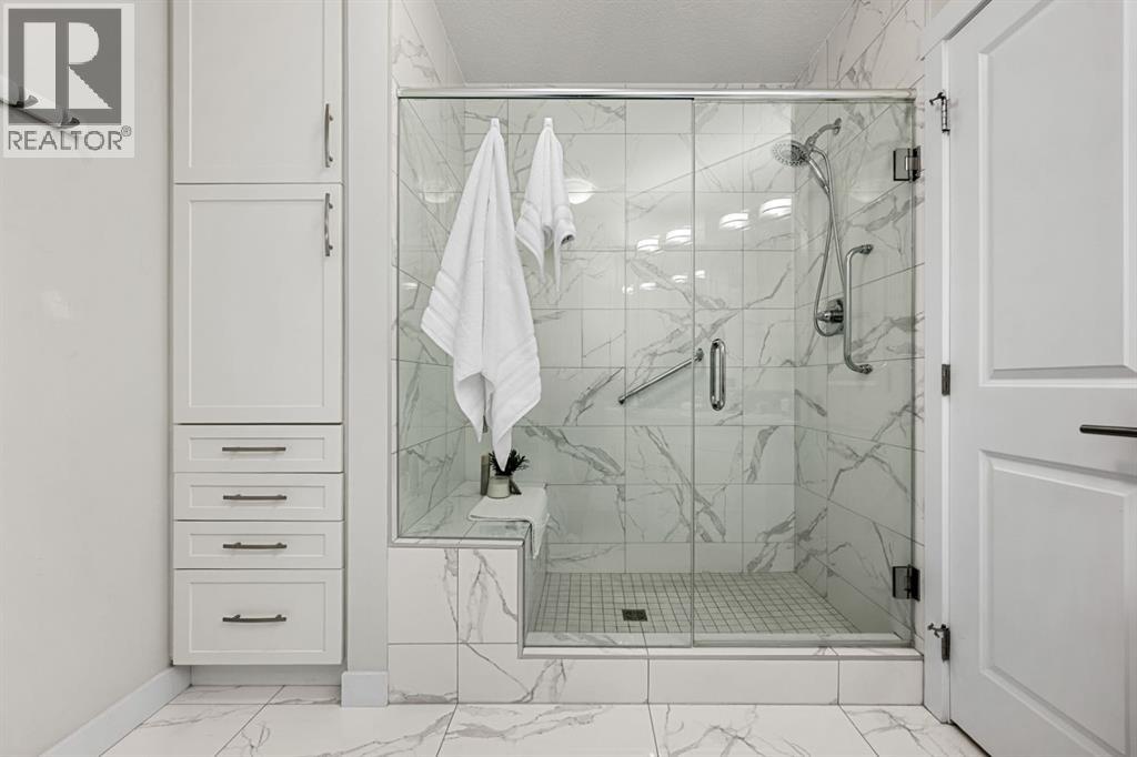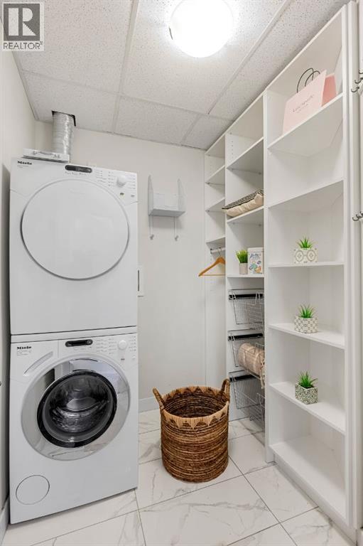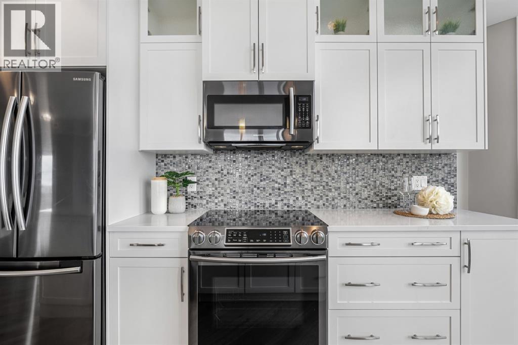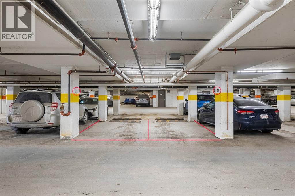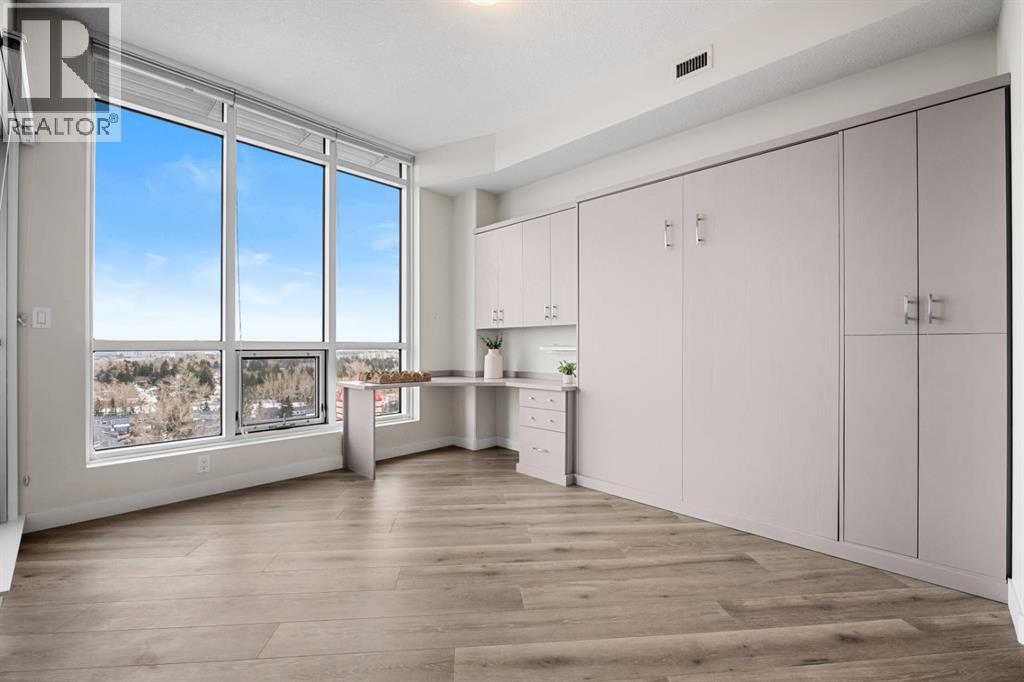 Welcome to penthouse living at the Groves of Varsity. Situated on the top floor, this corner suite captures unobstructed downtown views, beautiful natural light, and a layout that truly lives well day to day. With 10-foot ceilings and expansive windows, the space feels open and bright throughout. The private balcony, included in only select corner units, offers a gas BBQ hookup and two separate access points: one from the main living area and another from the secondary bedroom. It’s the perfect spot for morning coffee, fresh air, or evening city views. This thoughtfully designed 2-bedroom + den home offers exceptional privacy, with both bedrooms featuring walk-through closets and their own ensuite bathrooms. The primary suite includes double sinks and a glass shower, while the secondary ensuite offers a tub/shower combination, making it ideal for guests. A separate 2-piece powder room is a rare and practical addition for condo living. The kitchen is finished with quartz countertops, induction cooking, sleek cabinetry, and quality appliances. Luxury vinyl plank flooring runs throughout, complemented by custom built-ins and well-planned storage solutions. The secondary bedroom is equipped with a built-in Murphy bed and integrated desk, allowing the space to transition seamlessly between guest room and home office. Hunter Douglas window coverings and dual-zone central A/C ensure comfort year-round, and the in-suite Miele washer and dryer add everyday convenience. This unit includes two titled underground parking stalls that are side-by-side (not tandem), along with a rare double-sized assigned storage locker. Dedicated bike storage is also available in the parkade. Built with steel and concrete construction, the building offers a solid and quiet living environment. Residents enjoy rooftop amenities including a fully equipped fitness centre, steam rooms, an owner’s lounge that hosts yoga classes, and a large terrace with BBQ areas. An attached professional building prov ides exceptional convenience with a pharmacy, medical and dental clinics, and a coffee shop just steps away. Groceries, restaurants, shopping, banking, and the LRT are all within walking distance. Top-floor, corner location, skyline views, side-by-side parking — a rare opportunity in one of NW Calgary’s most sought-after buildings. (id:63190)