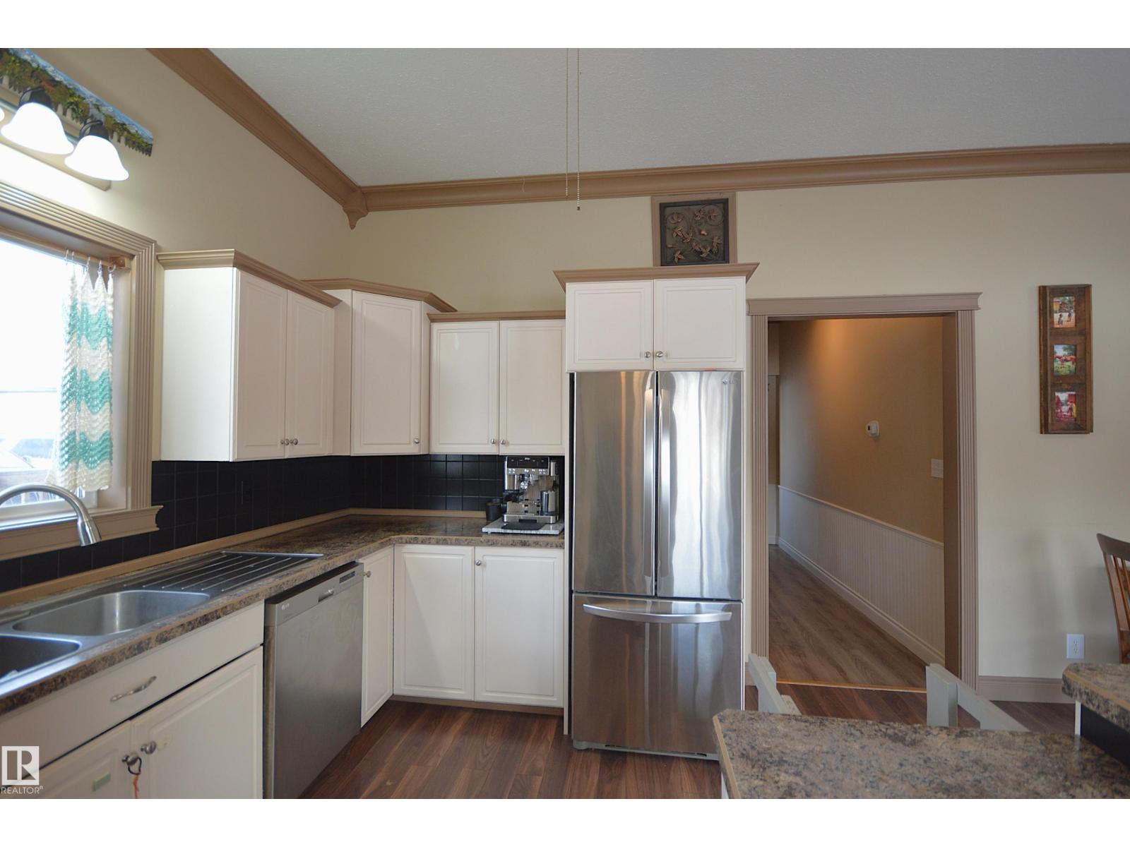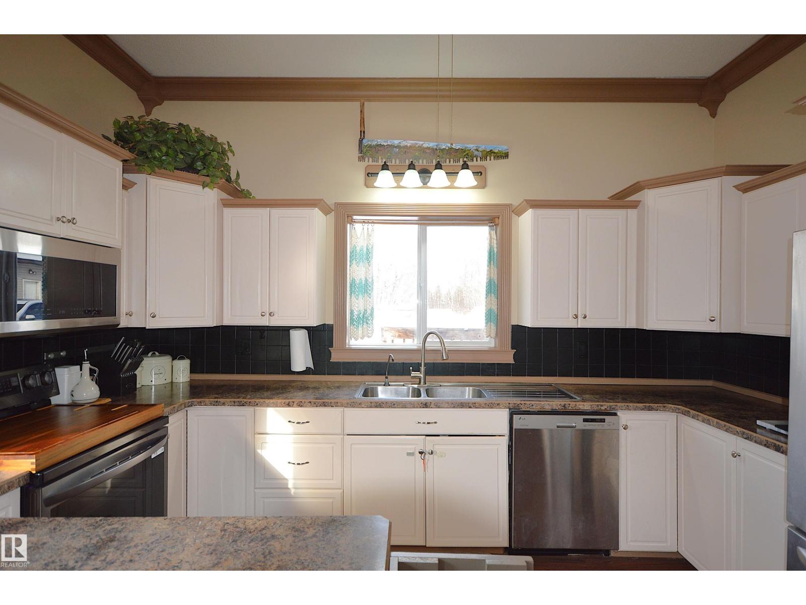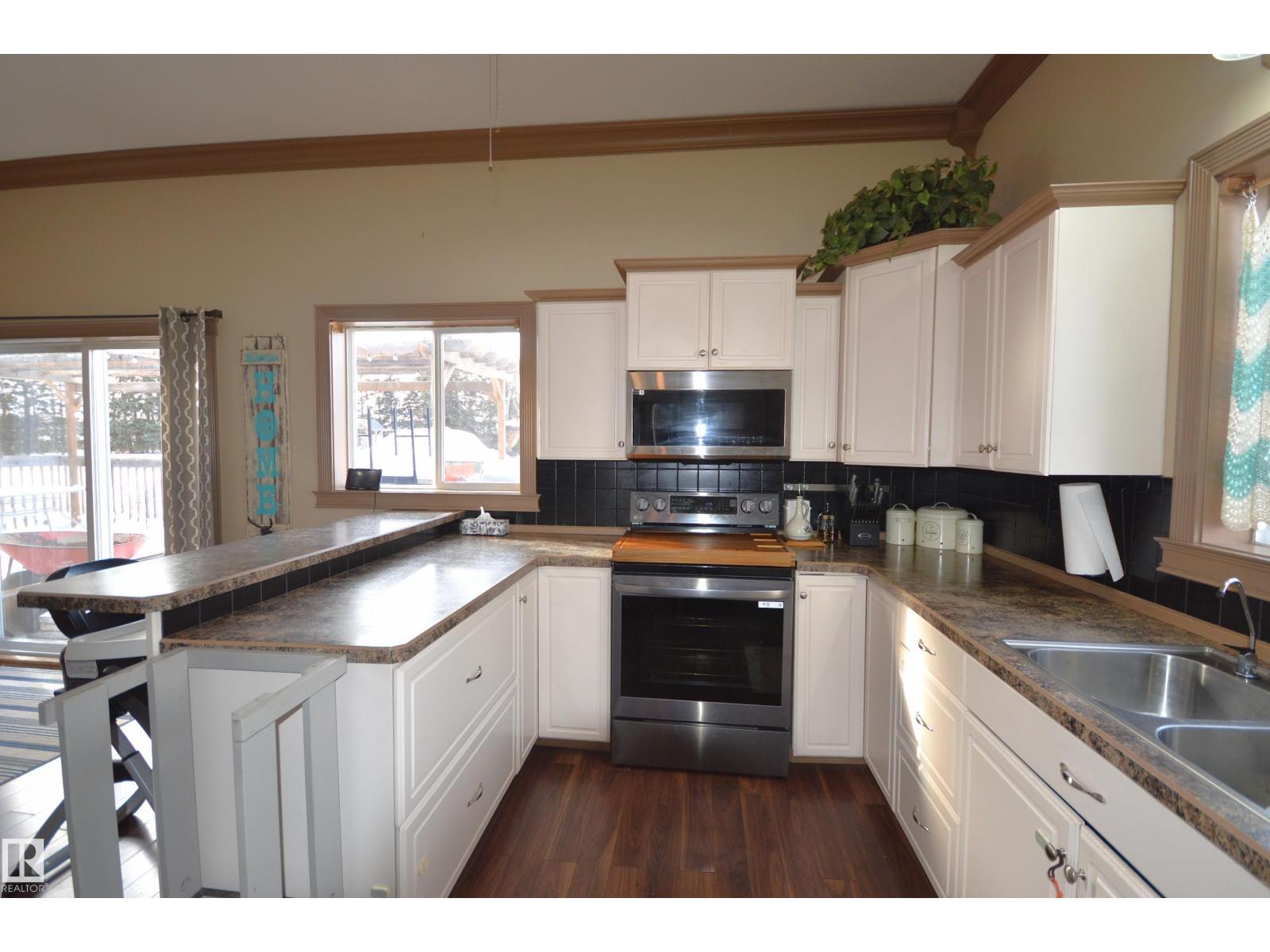 Zero stairs. Zero carpet. Here is the total country living package under $450k. Well maintained bungalow, big finished garage, close to town, wrap around deck, firepit, clothes line, private, mature trees all on 10 acres for the animals, gardens, kids, hobby farm, do as you may. 1500 sq ft of house with 2 bedroom, 1 den, 1 full bath, 1ensuite, open concept. The 10 ft high ceilings with plenty of windows give a bright space & extra cozy warmth coming from the wood stove. Modern white cabinets & newer appliances in U shaped kitchen that allows for a lunch counter and view to family room. Huge master with glass/tiled walkin shower ensuite. Wrap around deck offers great BBQ bar island, pergola. Yard includes the kids play centre, garden, fire pit, & 2 storage shelters. 1995 Garage is 30x40 plywood finished, O/H heat, large power panel, work bench & plenty of shelves. Beartrap lake nearby and 14 min to Bonnyville or 40 min to Cold Lake. Surrounding agriculture, wildlife, lakes, peace and quiet. (id:63190)