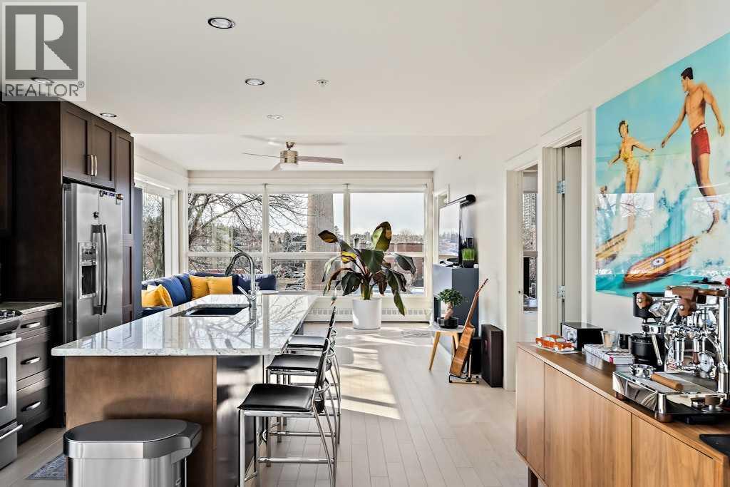 Fantastic 2 bedroom 2 full bath Penthouse at “Tweed” with double-height ceilings and ROOF DECK. 10 reasons to LOVE this exciting suite: 1) Newer white-oak hardwood flooring…upgraded from the original dark laminate and adds to the brightness and sophistication 2) Open plan with huge windows…great light quality 3) The best parking stall in the building…over 12’ wide and right beside the elevator 4) the parking stall has been electrified for an EV charger 5) two storage units...one on the 4th floor close to the unit and one on the main floor…perfect for sports equipment, tires etc. 6) 125+ sq ft ROOF DECK with sunny west exposure, views of the Mount Royal hill and newer wood decking 7) new electronic door lock (can be unlocked from your phone) 8) air conditioning added 9) 2 large bedrooms that will easily hold king-size beds 10) custom professional window shades with valances…when it’s time for privacy. Tweed enjoys a fantastic location on a tree-lined Street, just off 17th Avenue with endless amenities and a couple of the blocks to the 4th street village. Tweed is a red brick and solid concrete building…no PTC. (id:63190)