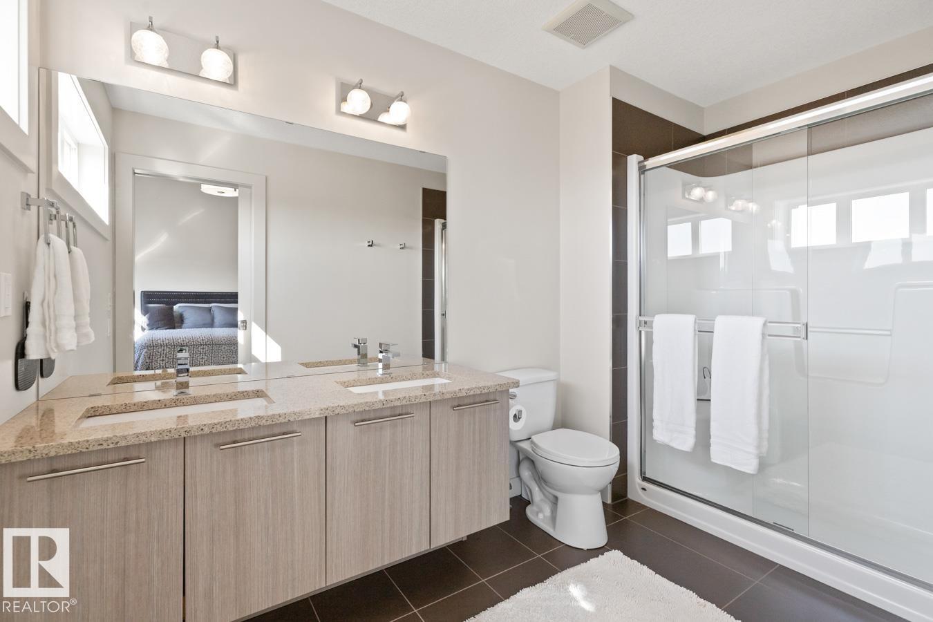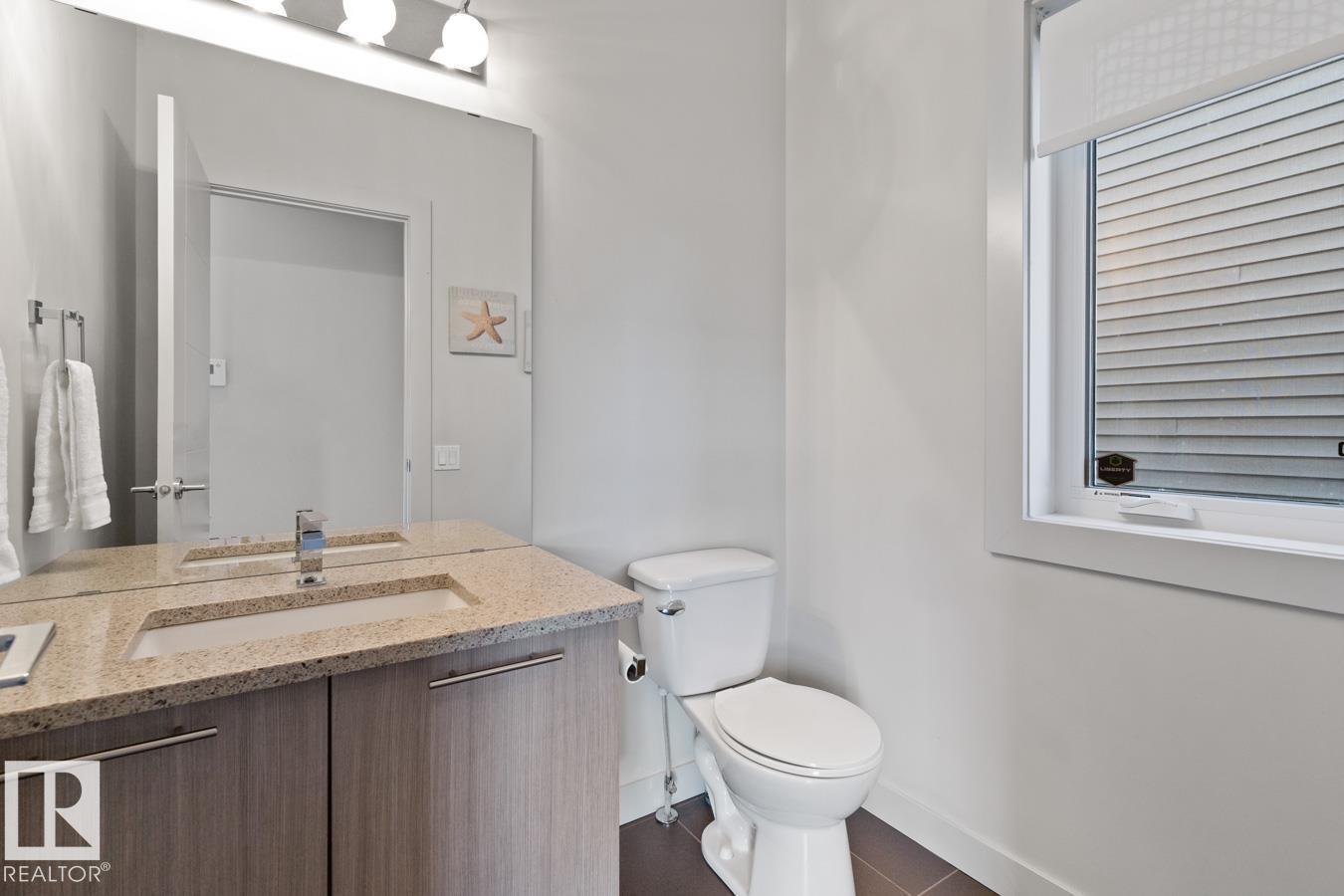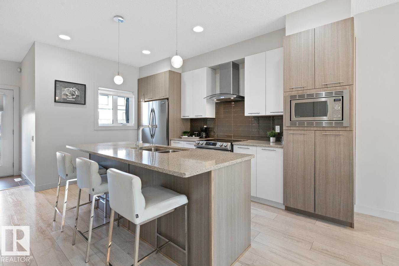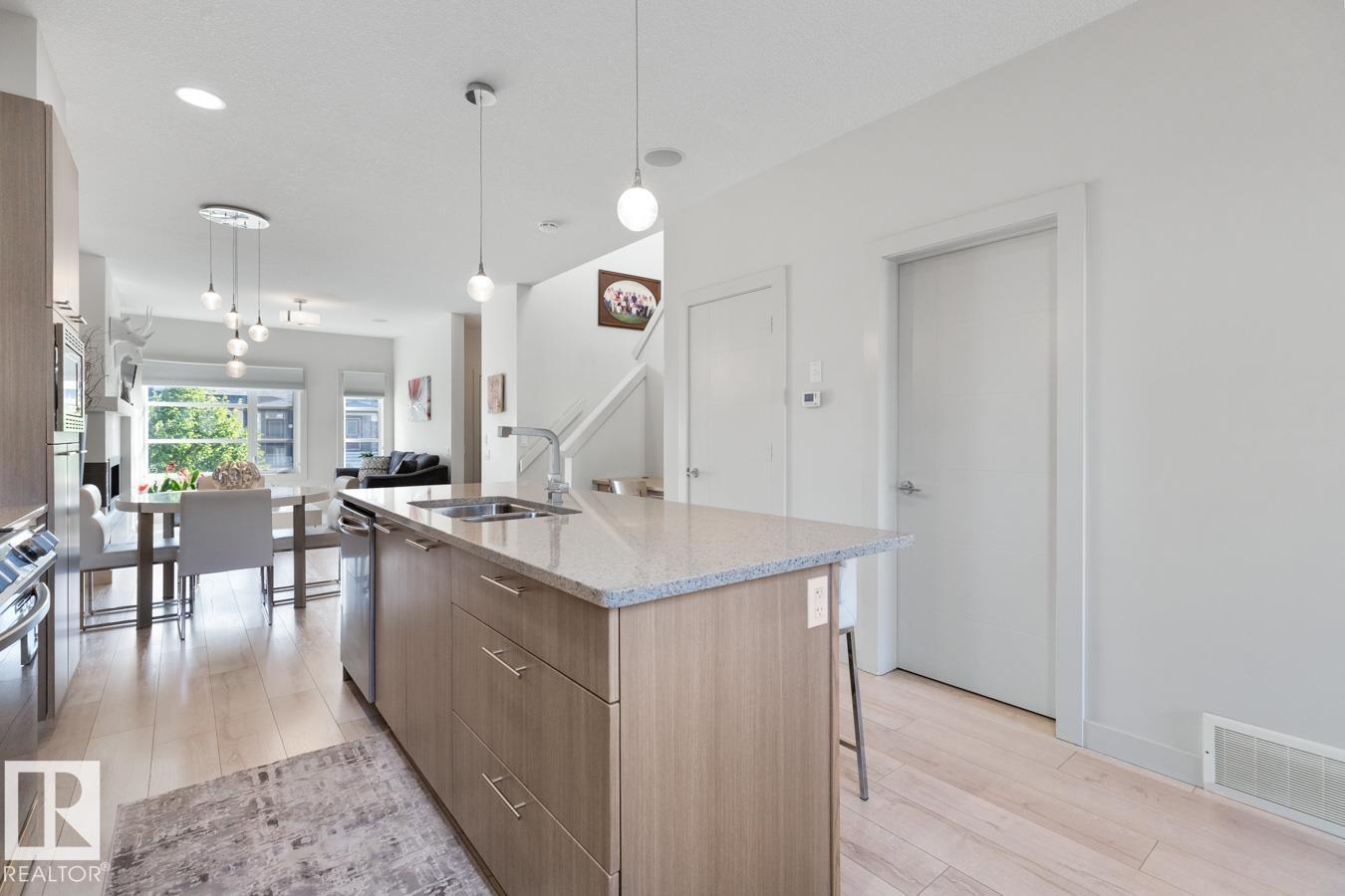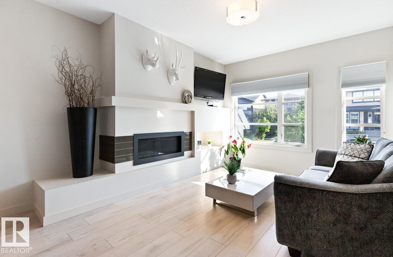Modern, open-concept main floor crafted for daily life and hosting. The chic kitchen boasts two-tone, tall cabinets, quartz counters, subway tile, stainless appliances, plus an island seating four. Pot lights and pendants add flair. Bright dining and living areas feature a sleek fireplace wall and large windows for sun. Upstairs holds three cozy bedrooms. A finished basement offers versatility with a family room, fourth bedroom, and full bath. Outside, find a landscaped yard and a double detached garage. Move-in ready and low-maintenance. Quick Yellowhead access, near shops, schools, parks and Golf. (id:63190)