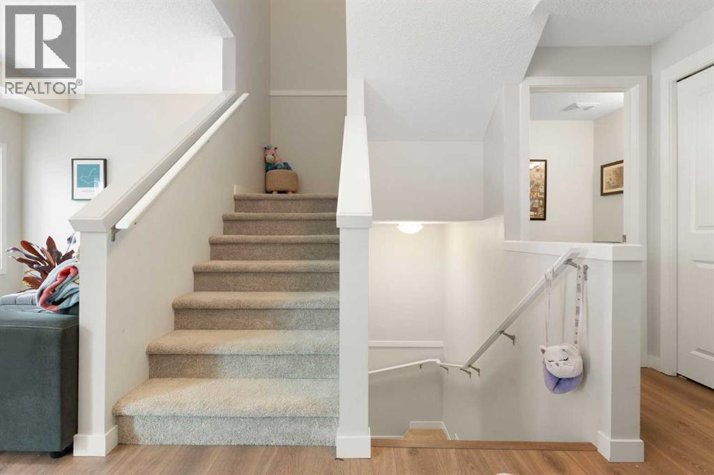 TWO TITLED PARKING STALLS | VIEWS | Welcome to this stylish townhome in the family-friendly community of Fireside. Upon entering, you’re welcomed by a bright foyer with stairs leading to the main living level. Upstairs, the spacious kitchen, living, and dining areas flow seamlessly together, creating the perfect space for both everyday living and entertaining. Rich dark wood cabinetry adds warmth, while large windows fill the space with natural light. A convenient two-piece powder room is also located on this level. The top floor features two well-appointed bedrooms, including a primary retreat complete with a walk-in closet and private balcony, an ideal spot to enjoy your morning coffee or unwind in the evening. A full four-piece bathroom and a stacked washer and dryer are also located on this level for added convenience. Situated in the family-friendly Fireside community, this home offers easy access to parks, pathways, schools, restaurants, pharmacy, and more, all while being just a short drive from the mountains and Calgary. Book your showing today to find out why Living in Cochrane is Loving where you Live! (id:63190)
