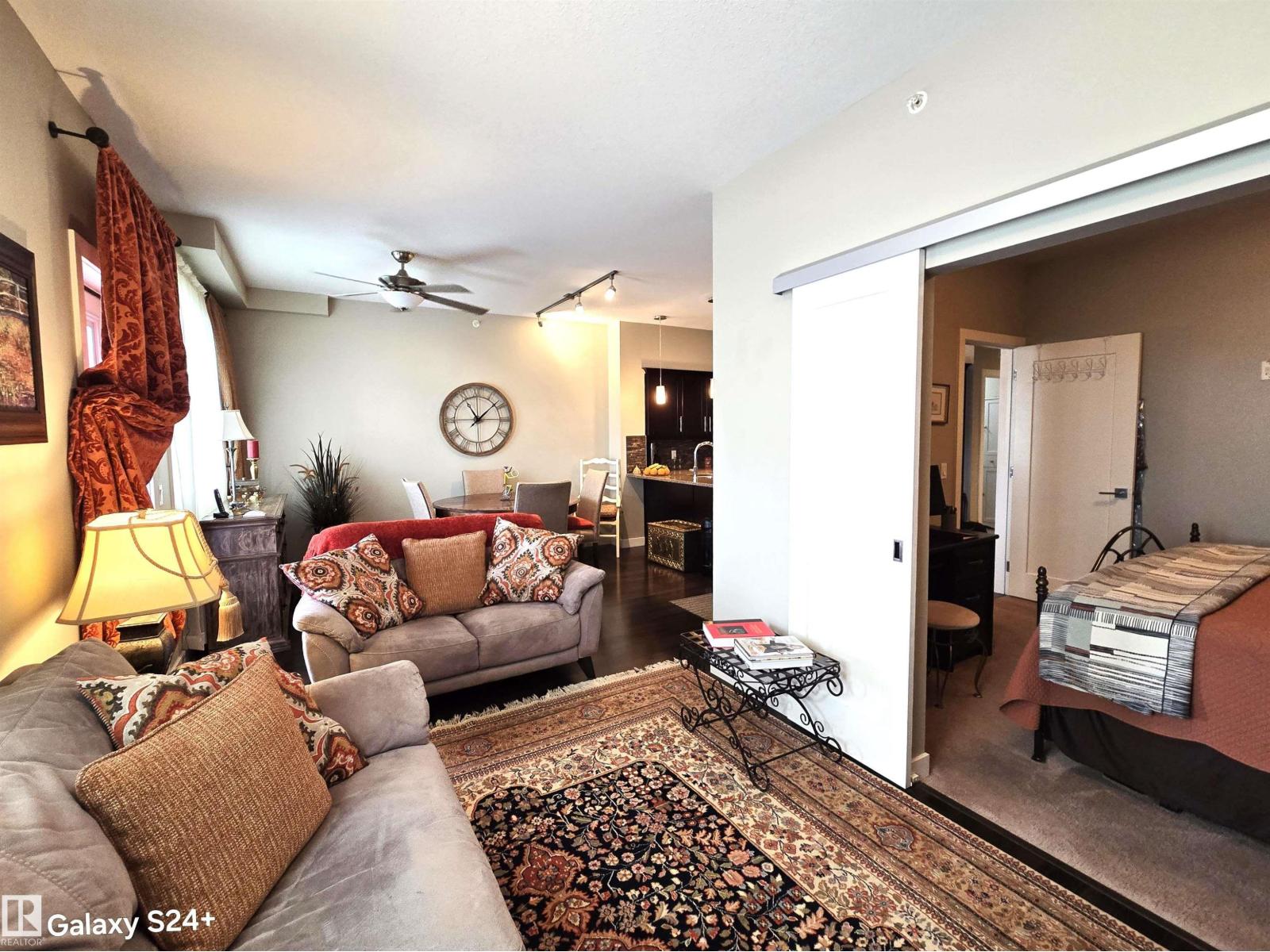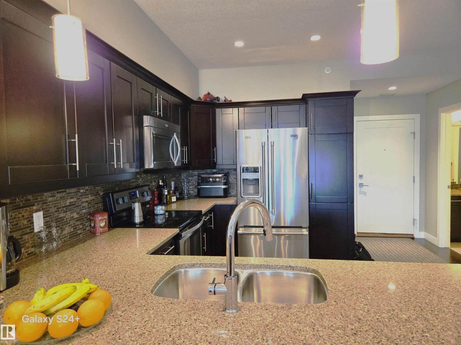 Very well kept like new. You will experience luxury from the top floor of the Essence of Windermere South (18+). This impeccably maintained just like a new 710 sq. ft. residence offers a premium lifestyle with 9-foot ceilings. The gourmet kitchen features quartz countertops, beautiful cabinetry, and a matching backsplash, fully equipped with stainless steel appliances. The master bedroom leading to a 4-piece bath a walkthrough closet, the 13'x7' balcony backs on open view. This unit includes rare value: two parking stalls (one underground, one surface) and two storage units (one at your stall and one titled cage on the same floor). Built by very reputed award winning Cove Properties, this professionally managed building offers low monthly fees $369 and is minutes away from the Anthony Henday, elite shopping, and conveniences like fast food, coffee shops etc etc. You will surely love owning and living here. (id:63190)