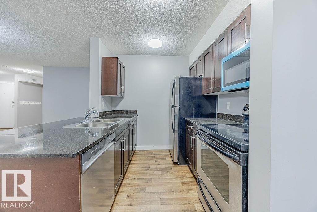 Excellent value two bedroom condo in Walker Lakes. This 964 square foot second floor condo features a bright and open living room, open den or flex space, dining area, and a kitchen that has granite countertops, eat at peninsula, stainless steel appliances, espresso cabinetry, and a breakfast bar. The primary bedroom has a walkthrough closet and four piece ensuite and the second bedroom is also a good size. Other features include two underground parking stalls, rough in for split system a/c, in-suite laundry, and a large corner balcony. Close to walking trails, schools, shopping, public transportation, and quick access to the Anthony Henday and Calgary Trail. (id:63190)