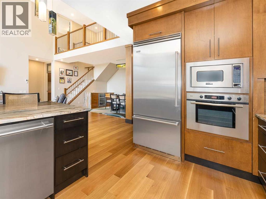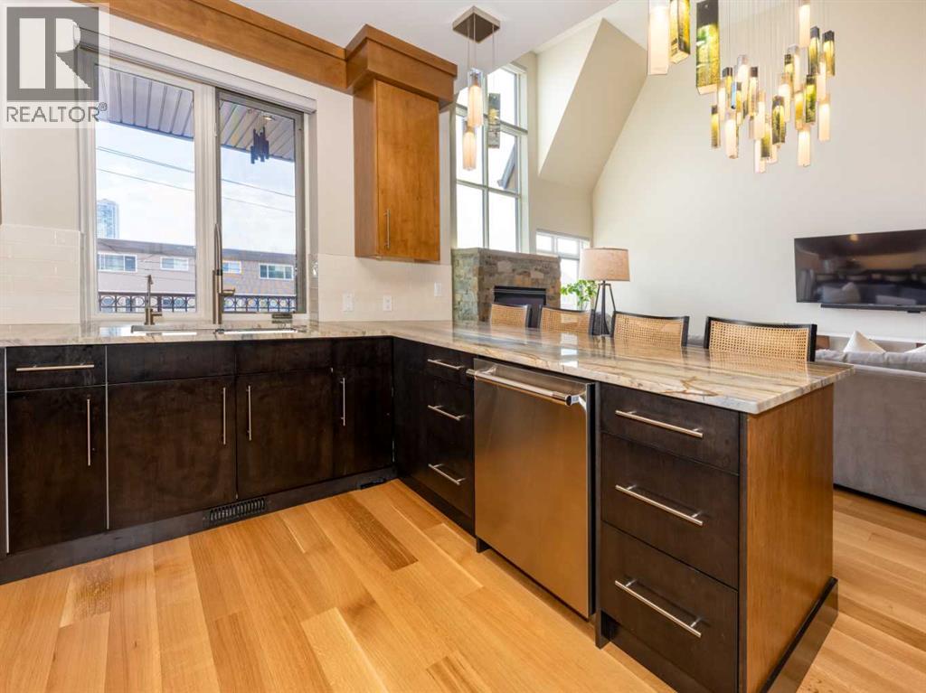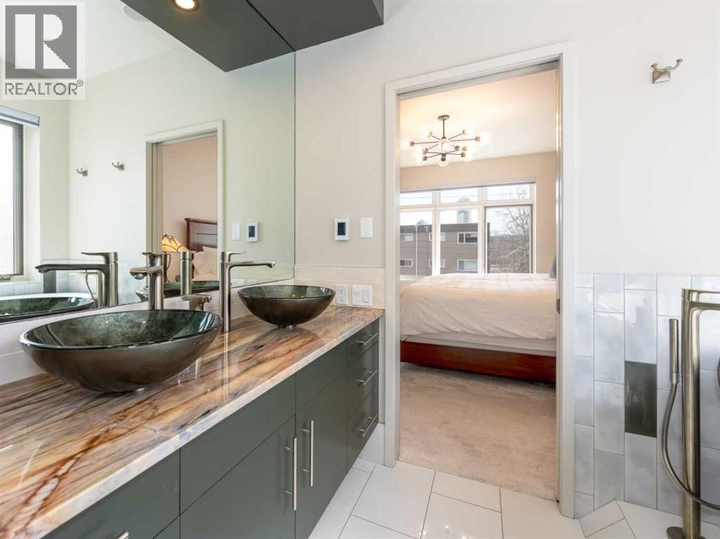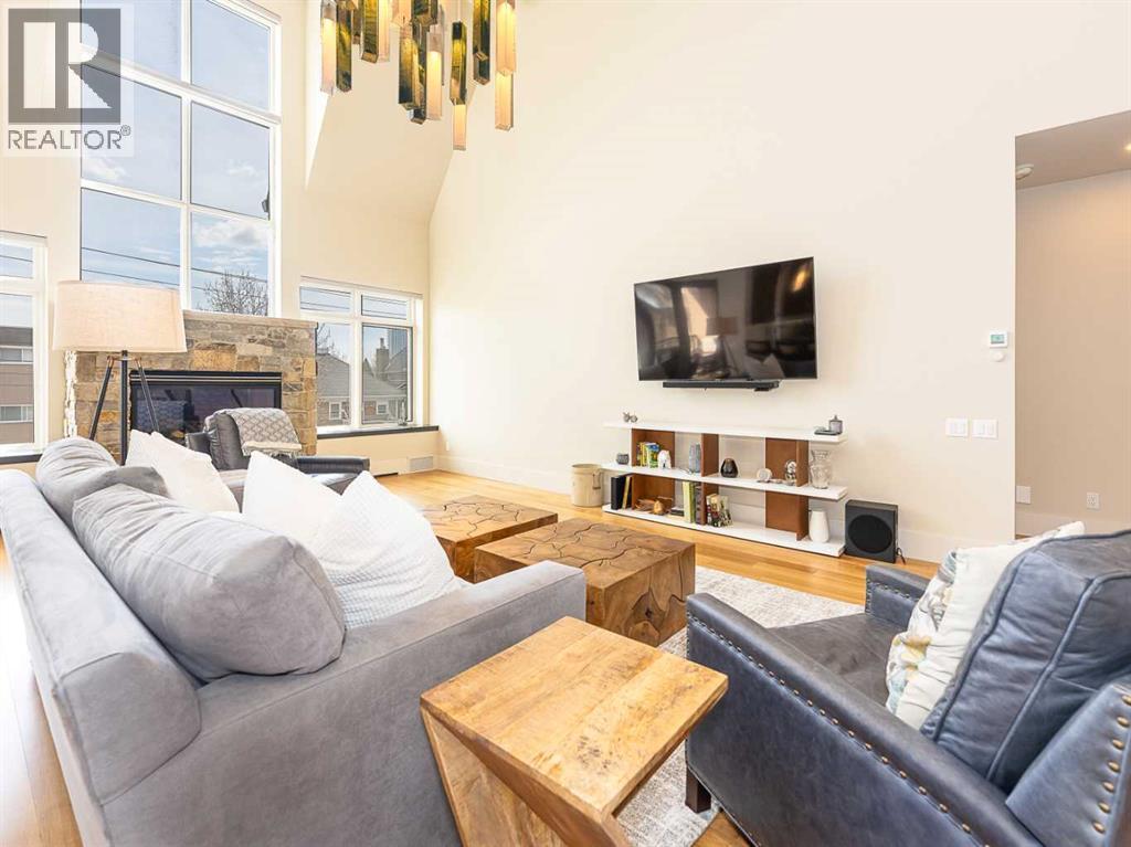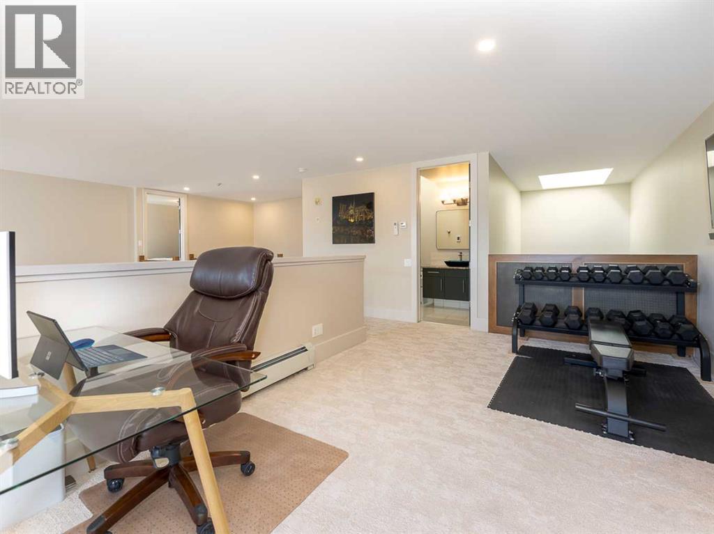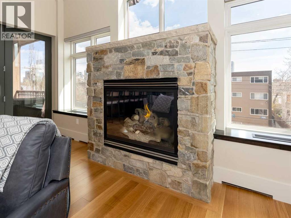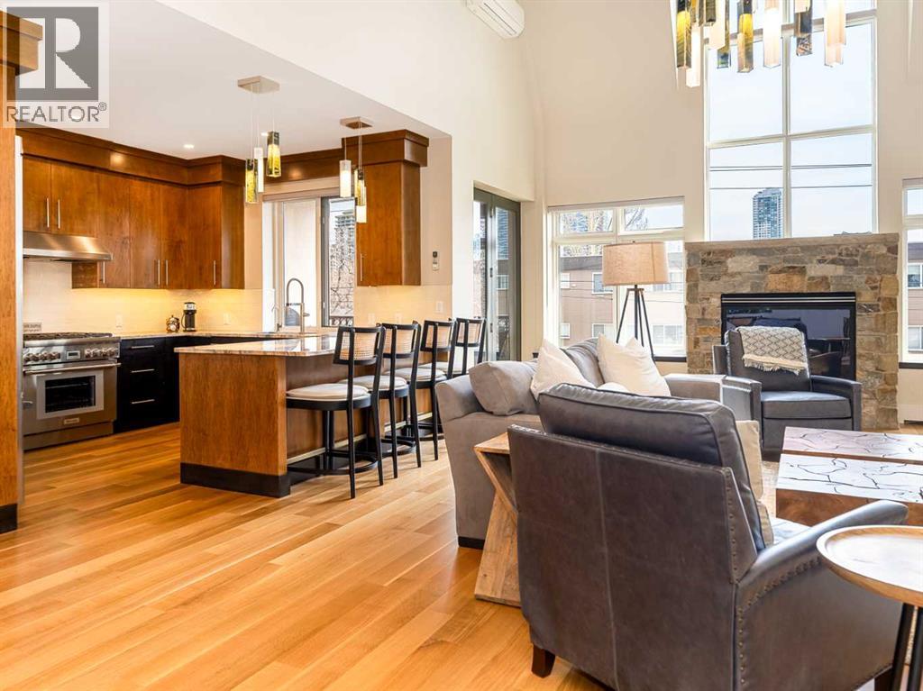 Luxury and sophistication converge in this meticulously renovated penthouse in the heart of Hillhurst. Just steps from Kensington’s vibrant shops and restaurants, the Bow River pathways, and the downtown core, this exceptional residence offers an elevated urban lifestyle. Situated in the boutique 12-unit Villagio building, constructed with superior ICF for outstanding soundproofing and energy efficiency, the home features a semi-private elevator that opens directly to the unit’s entrance. A grand foyer with soaring ceilings and an overhead skylight sets the tone as you enter this impressive two-level residence. The open-concept design is highlighted by dramatic 18-foot ceilings and a stunning south-facing wall of windows that fills the space with natural light. The central living room showcases a custom stone gas fireplace and a striking imported 120-piece hand-blown glass chandelier. Patio doors lead to one of two south-facing outdoor spaces, ideal for relaxing or entertaining. The chef’s kitchen is a true showpiece, featuring premium appliances including a Thermador dual-fuel gas range, Sapphire dishwasher, Viking refrigerator, and built-in microwave. Hand-selected quartzite countertops complement the space, while imported custom light fixtures add refined character. Adjacent to the kitchen, the dining area features a custom wine display with oak racking and a built-in buffet complete with a wine fridge and quartzite counters. A distinctive custom light fixture adds warmth and elegance to the space. The main-level primary retreat offers built-in cabinetry and a luxurious spa-inspired ensuite with dual sinks, Hansgrohe fixtures, quartzite countertops, a steam shower, and a custom cast-iron slipper tub. The suite is completed by a spacious walk-in closet. A powder room and convenient laundry area complete the main floor. The upper level features a second bedroom with access to a large in-suite storage room, a three-piece bathroom, and a versatile flex space ideal fo r a home office. A catwalk overlooking the living area below leads to patio doors that open onto the second south-facing patio, creating another private outdoor retreat. Extensive renovations throughout the home include new quarter-sawn engineered oak flooring on the main level, newer carpeting upstairs, modern railings overlooking the living room, fresh paint, and new remote-controlled window coverings. Comfort is enhanced by a newly installed Fujitsu mini-split four-zone inverter system, providing flexible climate control with independent heating, cooling, or fan settings for individual areas. The unit also includes two titled parking stalls, both generously sized to accommodate a full-size truck. This remarkable penthouse must be experienced in person to be fully appreciated. (id:63190)