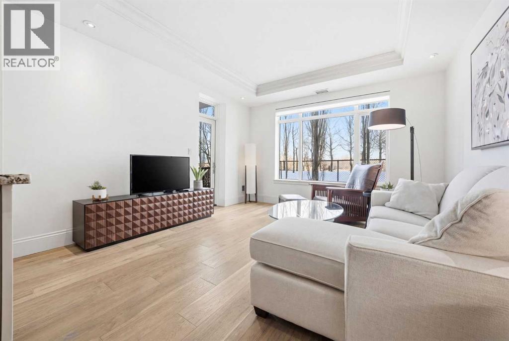 Experience a sophisticated, low-maintenance lifestyle in this luxury main-floor condo located in the Champagne building, South Calgary’s premier residence. Backing onto serene green space just steps from the Bow River, this home features 10-foot ceilings, rich engineered hardwood floors, and estate-level finishes throughout. The gourmet kitchen is a chef's dream, boasting 42-inch soft-close cabinetry, upscale stainless steel appliances, polished granite countertops, and a massive island designed for entertaining. The primary bedroom offers a private retreat with new custom Hunter Douglas blackout blinds and a lavish marble-tiled ensuite with a separate soaking tub and shower. The concrete construction of this pet-friendly building ensures exceptional quiet and durability. Modern conveniences abound, including central air conditioning, a gas BBQ line, titled storage, and a titled underground parking stall near the elevator with access to a two-stall car wash. Located in the master-planned community of Quarry Park, you are minutes away from miles of river pathways, an off-leash park, and the world-class YMCA. With condo fees that cover heat, gas, and water, this well-managed complex offers a holistic living experience that combines nature, quality, and convenience. (id:63190)