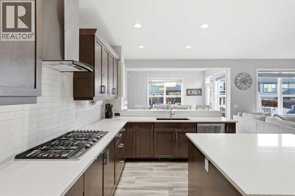 Welcome to Cochrane's premiere family-friendly community, Riviera! Tucked-away on a quiet cul-de-sac, this stunning home offers luxurious town living among natural surroundings. Riviera boasts extensive scenic pathways, playgrounds, and close proximity to the Bow River. Better value in Riviera seldom comes available. Inside, you'll find a bright and modern layout exuding style and comfort. The chef-inspired kitchen features quartz counters, spacious island, upgraded appliances, and is perfect for family meals or entertaining.Upstairs, a comfy bonus room, dedicated office space, and laundry room await. The primary bedroom includes a five-piece ensuite bathroom and walk-in closet. Outside, both front and back yards are fully landscaped. The oversized composite deck is perfect for summer BBQs and outdoor entertaining. Additional features include, central A/C, permanent exterior LED lights, and an Insulated and drywalled garage. (id:63190)