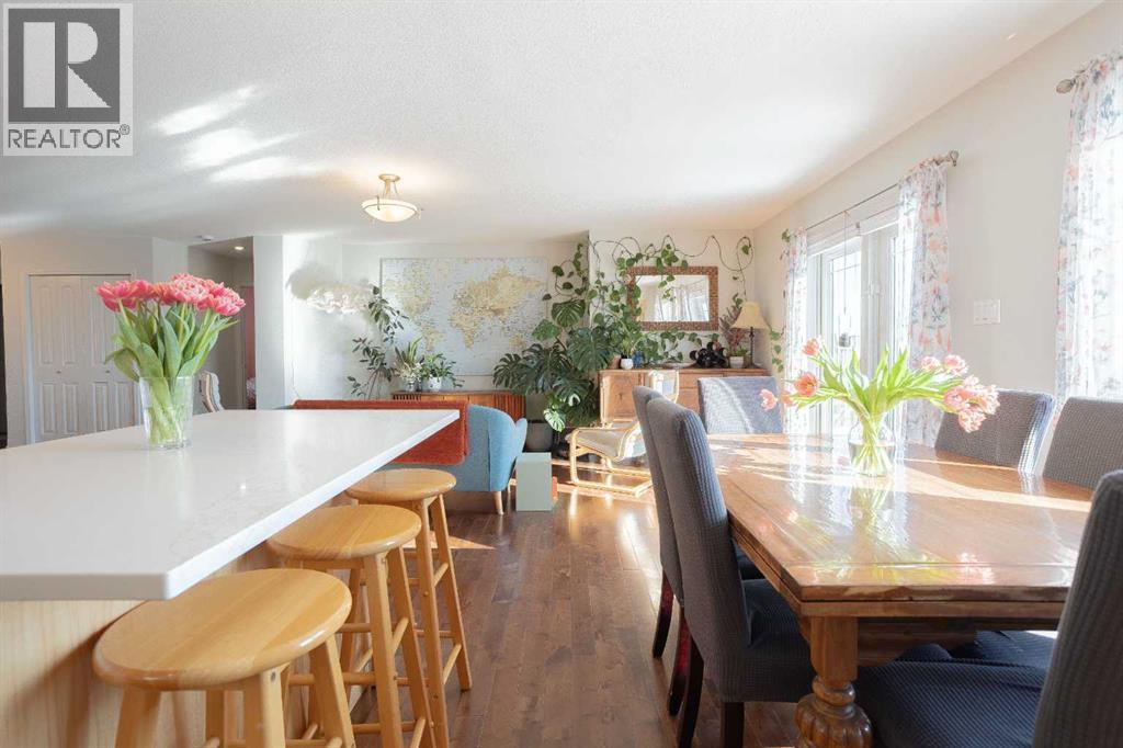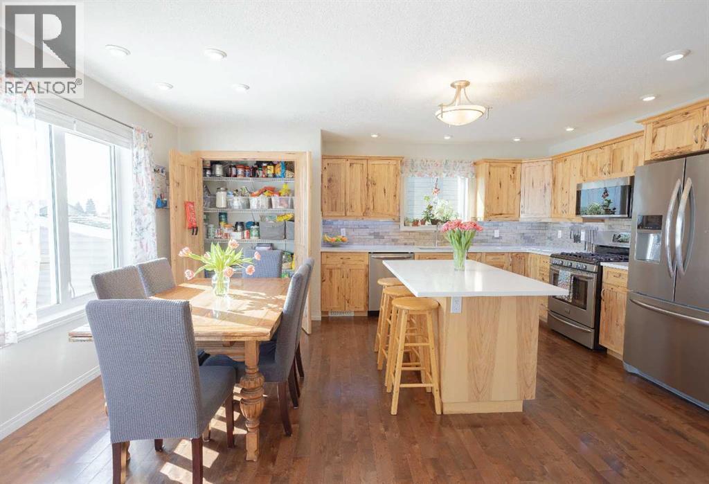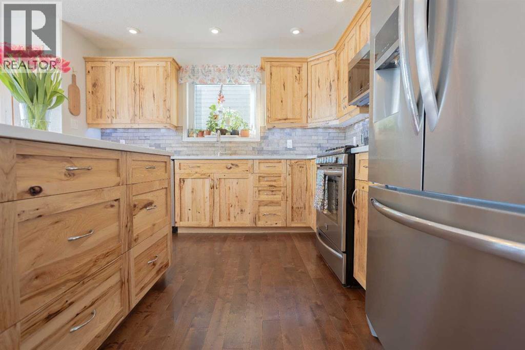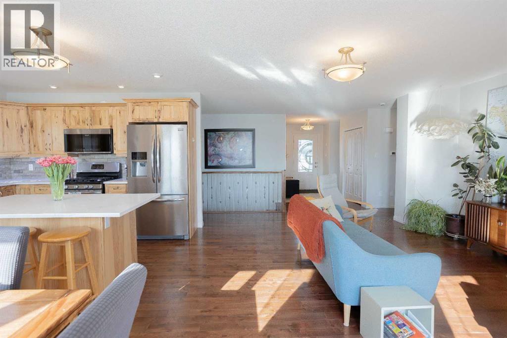Welcome to this 1,316 sq. ft. home located in an excellent family-friendly neighbourhood. The open-concept main level features hardwood flooring, quartz countertops, hickory cabinets, pantry, and a natural gas stove, creating a warm and functional kitchen and living space. The home offers 4 bedrooms and 3 full bathrooms, along with central A/C and an attached heated double-car garage. The fully finished basement with 9’ ceilings includes a large family room, bar area, laundry room plus the 4th bedroom perfect for extra living and entertaining space. Outside, enjoy the fully fenced yard and deck, plus permanent year-round exterior lighting for all occasions. Fantastic location just 1 block from the outdoor rink, toboggan hill, and green space, and only 2 blocks from the new school. A great opportunity to enjoy comfortable living in a highly desirable area. (id:63190)