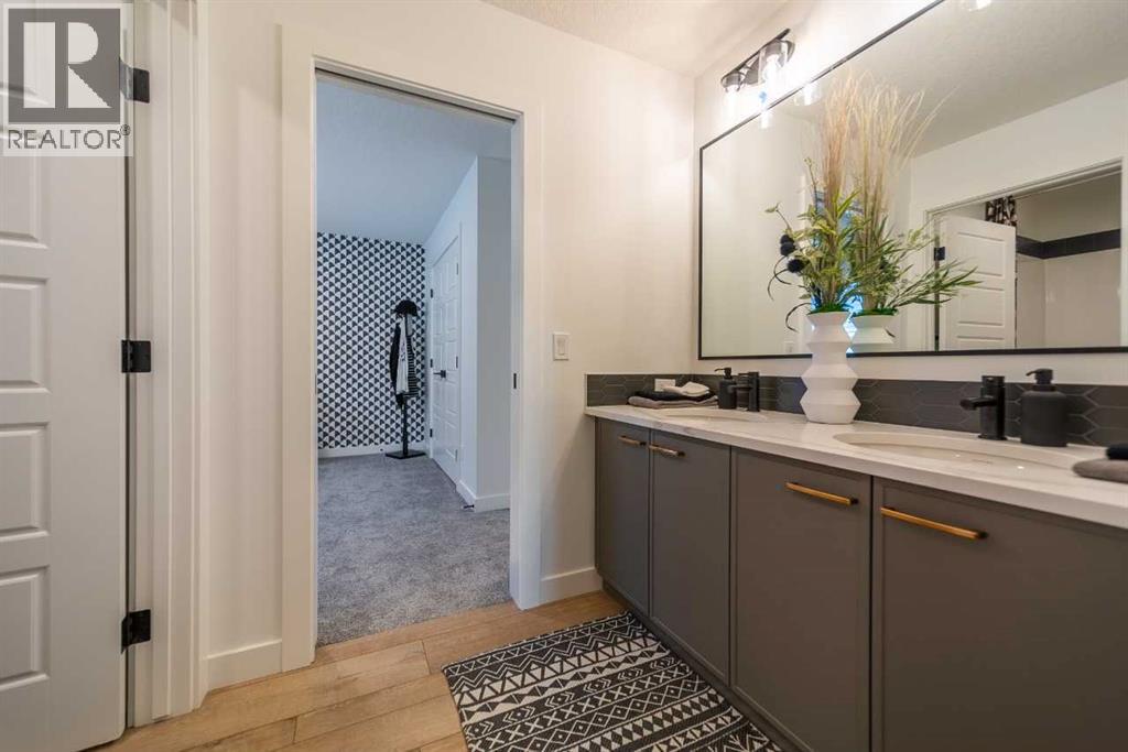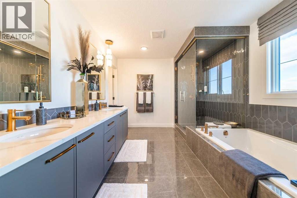 Welcome to the Pierce 2 by Sterling Homes Calgary! Built by a trusted builder with over 70 years of experience, this home showcases on-trend, designer-curated interior selections tailored for a home that feels personalized to you. Energy efficient and smart home features, plus moving concierge services included in each home.Discover this stunning 2026 home with side entrance, 9’ basement walls, and a 3 car garage. It features a secondary primary bedroom, main floor bedroom with full bath, rear BBQ gas line rough-in, gas fireplace with floor-to-ceiling tile, paint grade railing with iron spindles, vaulted bonus room, and additional windows throughout.The kitchen offers a chimney hood fan with built-in microwave tower, gas range, spice kitchen with french door and pantry shelving, plus island pendants. Upstairs boasts a 5-piece ensuite with soaker tub, fully tiled shower with bench and glass barn door, bank of drawers, 3-piece ensuite in the second primary, and tile flooring in upper baths. This energy-efficient home is Built Green certified and includes triple-pane windows, a high-efficiency furnace, and a solar chase for a solar-ready setup. With blower door testing, plus an electric car charger rough-in, it’s designed for sustainable, future-forward living. Featuring a full range of smart home technology, this home includes a programmable thermostat, ring camera doorbell, smart front door lock, smart and motion-activated switches—all seamlessly controlled via an Amazon Alexa touchscreen hub. Photos are a representative. (id:63190)