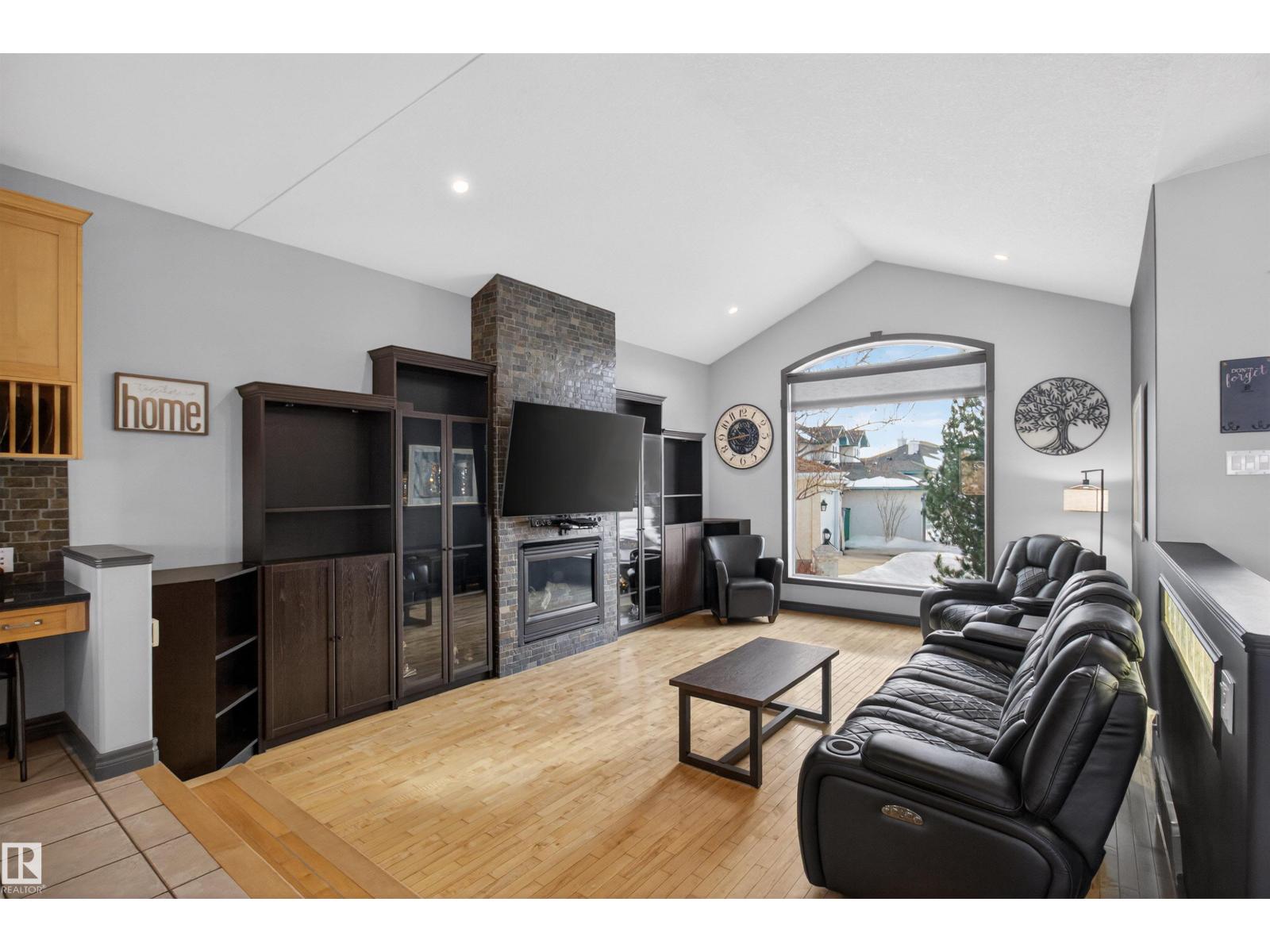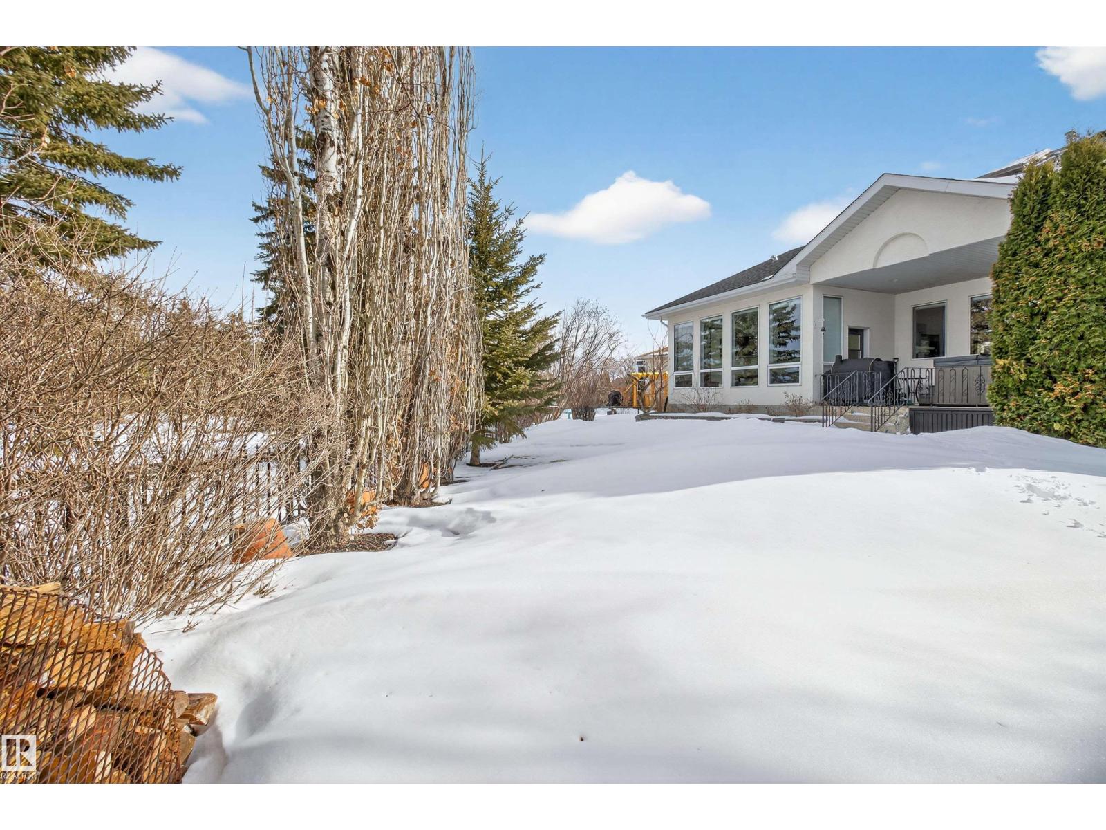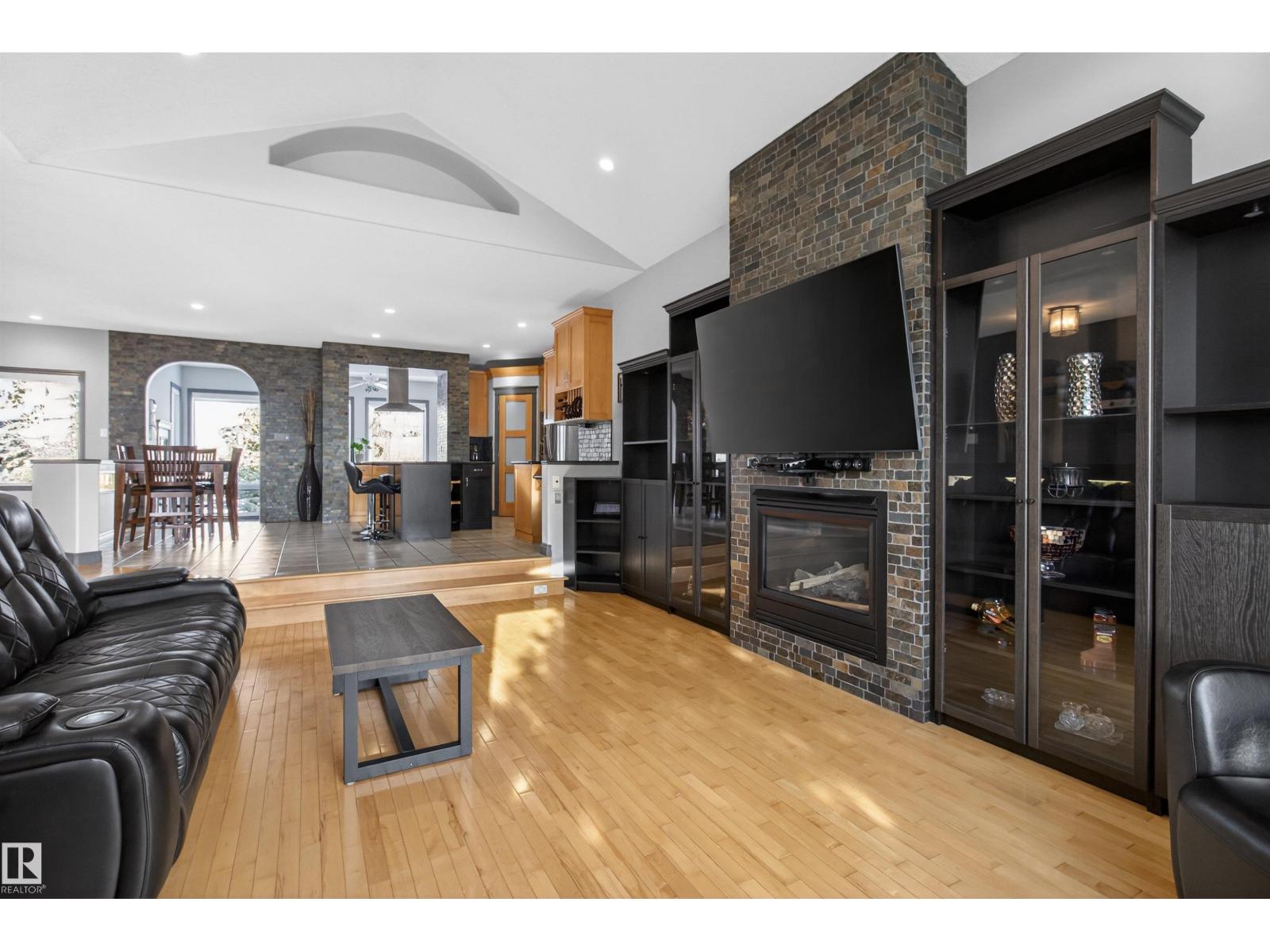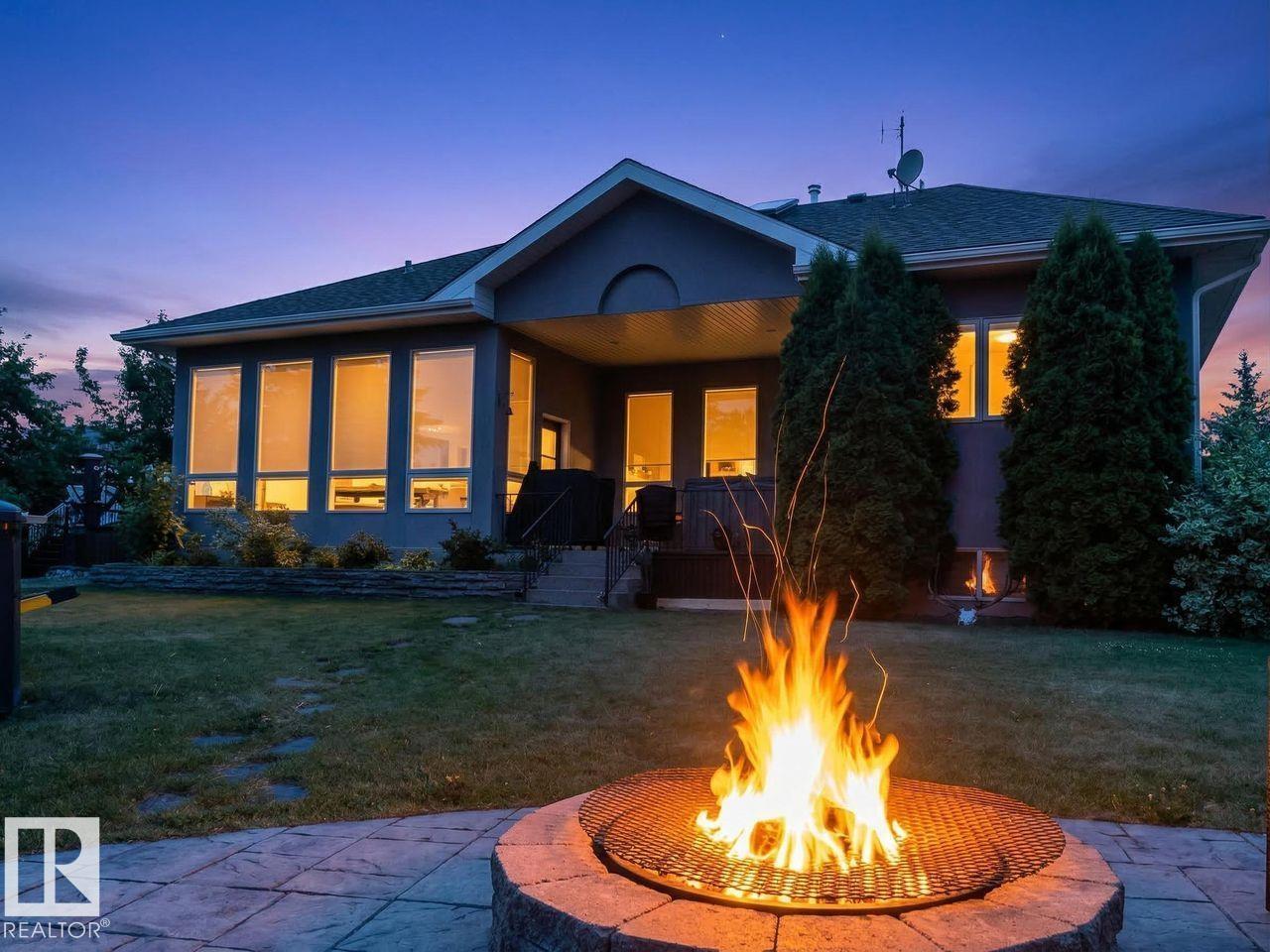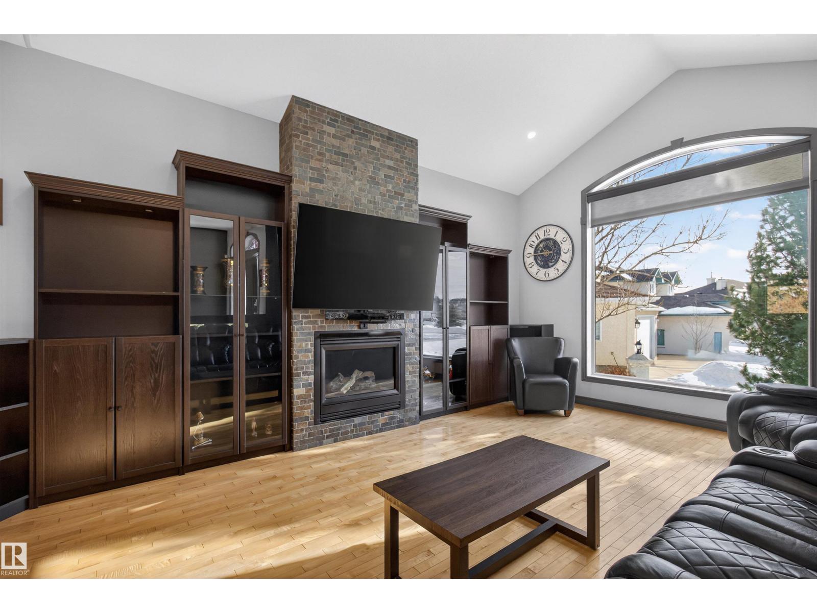 Stunning & unique executive 1.5 story on a huge pie lot backing west on the golf course! Enter the spacious foyer into an open great room boasting tall vaulted ceilings, hardwood & ceramic floors, abundant stone tile features, & stately fp surrounded by custom cabinets. Entertainer's dream with premium maple kitchen with granite counters, built-in appls, coffee bar, corner pantry & dark contrasting island. Private sunroom with heated tile floor & generous windows with amazing view of the 12th tee! Main floor laundry & full bath with tasteful claw-foot tub. Opulent owner's suite on the upper floor boasts 2nd fp, vaults, skylight & luxurious enuite with his & her vanities plus stone & tile dbl shower. F-fin bsmt has 4th bd, full bath, sauna, & huge FR with wet bar. Hi-eff furnace & cent AC. Recently prof painted, new carpet, & custom blinds. Exposed aggregate on driveway & covered patio. Serene & picturesque yard with underground sprinkler system, firepit & storage shed. Oversized garage with radiant heat. (id:63190)
