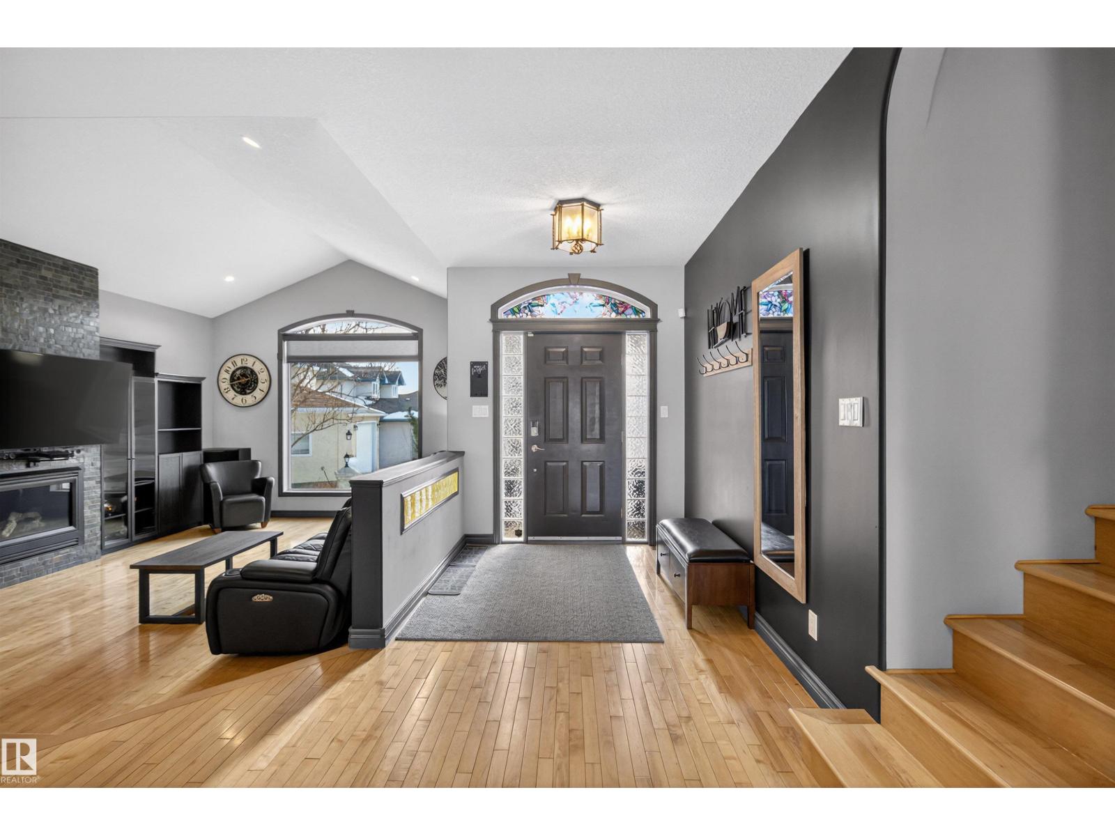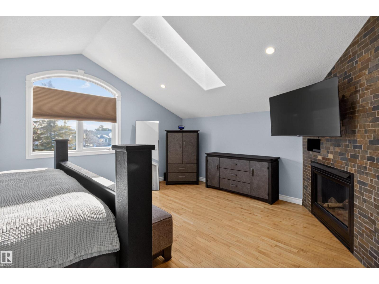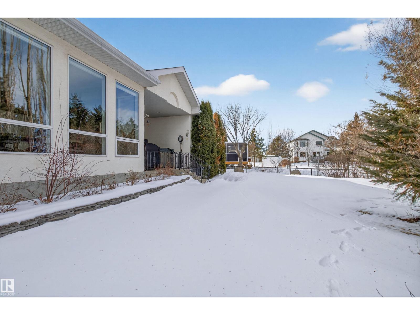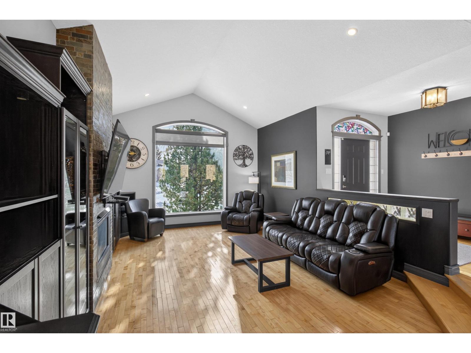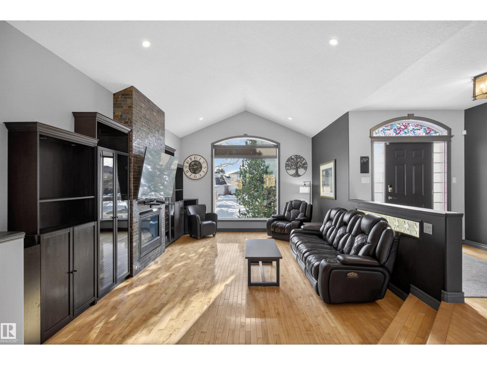 Stunning & unique executive 1.5 story on a huge pie lot backing west on the golf course! Enter the spacious foyer into an open great room boasting tall vaulted ceilings, hardwood & ceramic floors, abundant stone tile features, & stately fp surrounded by custom cabinets. Entertainer's dream with premium maple kitchen with granite counters, built-in appls, coffee bar, corner pantry & dark contrasting island. Private sunroom with heated tile floor & generous windows with amazing view of the 12th tee! Main floor laundry & full bath with tasteful claw-foot tub. Opulent owner's suite on the upper floor boasts 2nd fp, vaults, skylight & luxurious enuite with his & her vanities plus stone & tile dbl shower. F-fin bsmt has 4th bd, full bath, sauna, & huge FR with wet bar. Hi-eff furnace & cent AC. Recently prof painted, new carpet, & custom blinds. Exposed aggregate on driveway & covered patio. Serene & picturesque yard with underground sprinkler system, firepit & storage shed. Oversized garage with radiant heat. (id:63190)