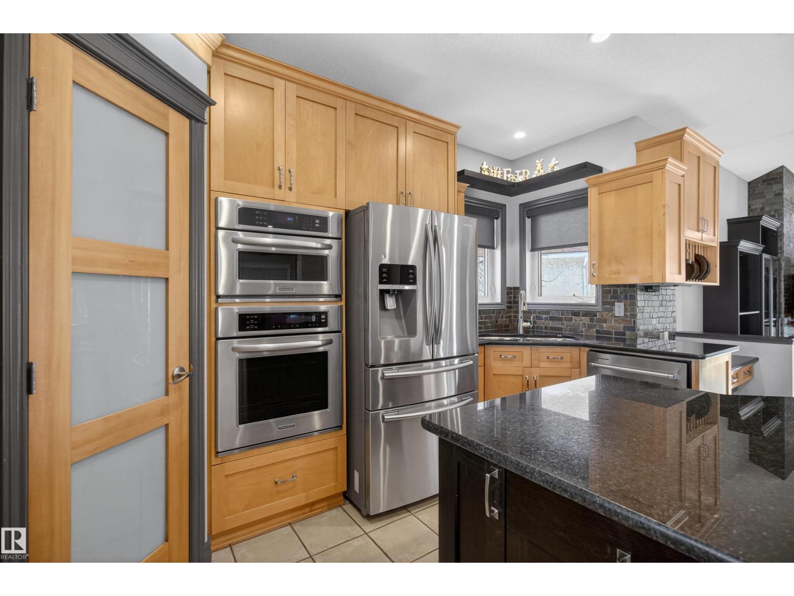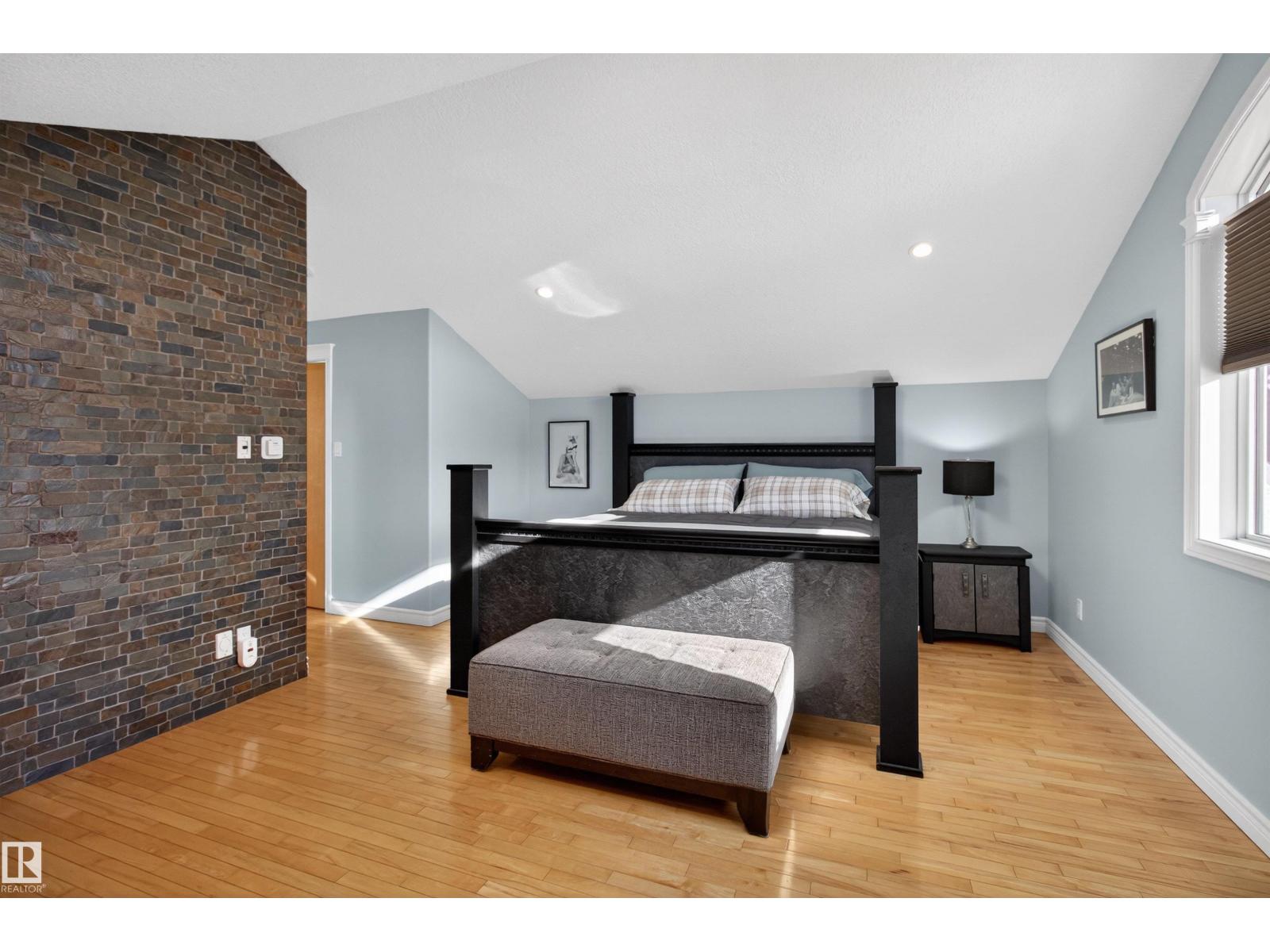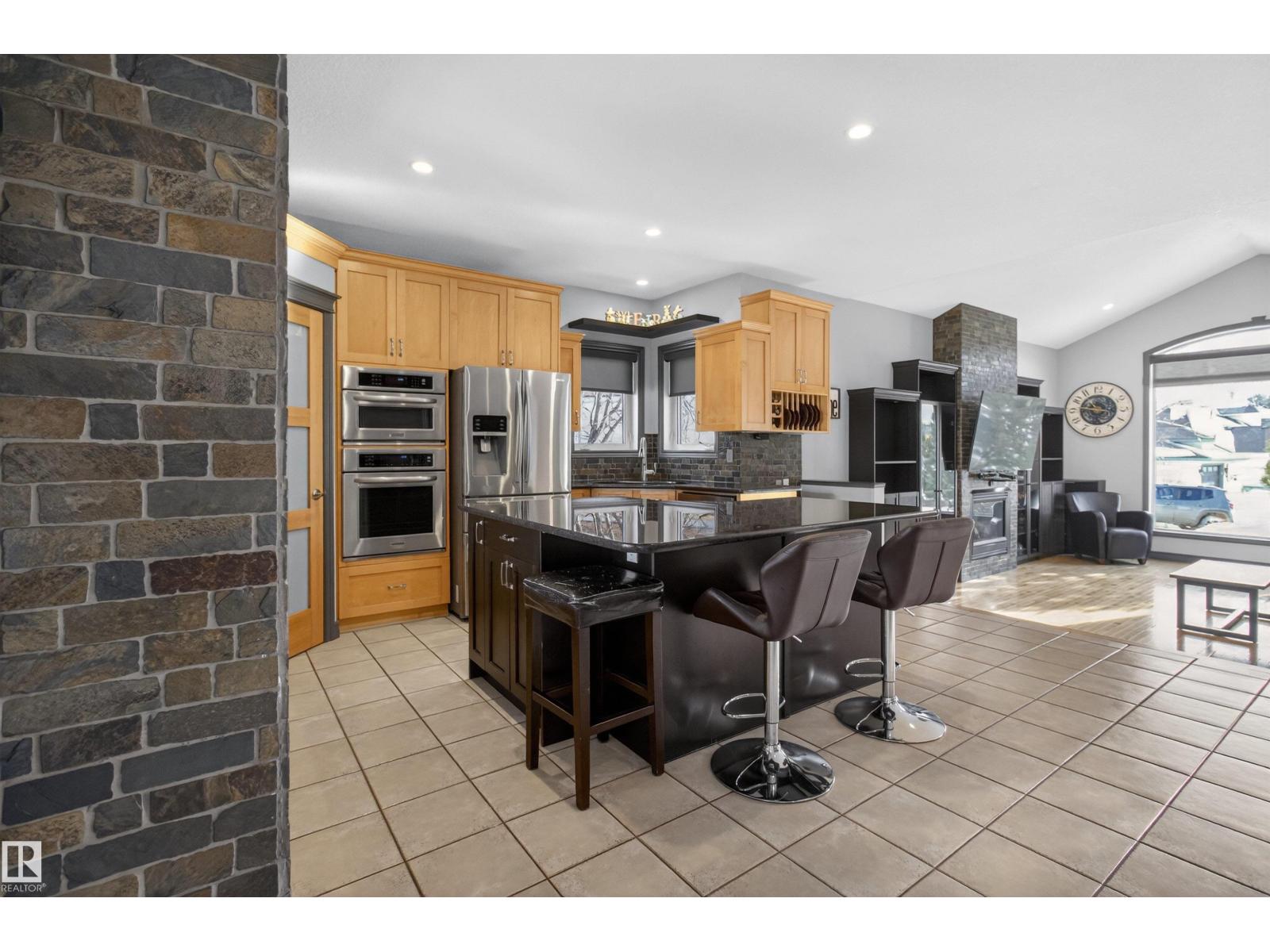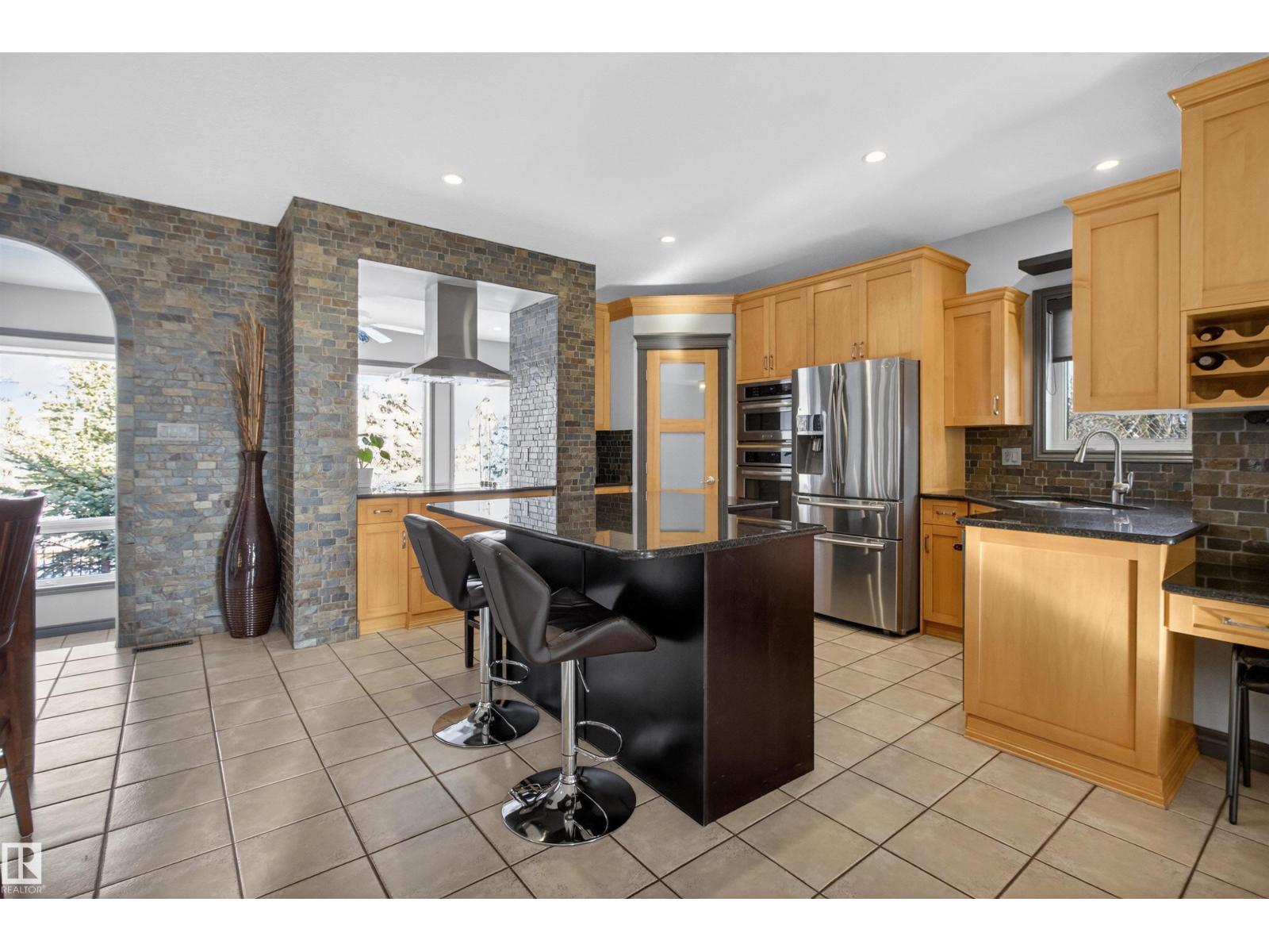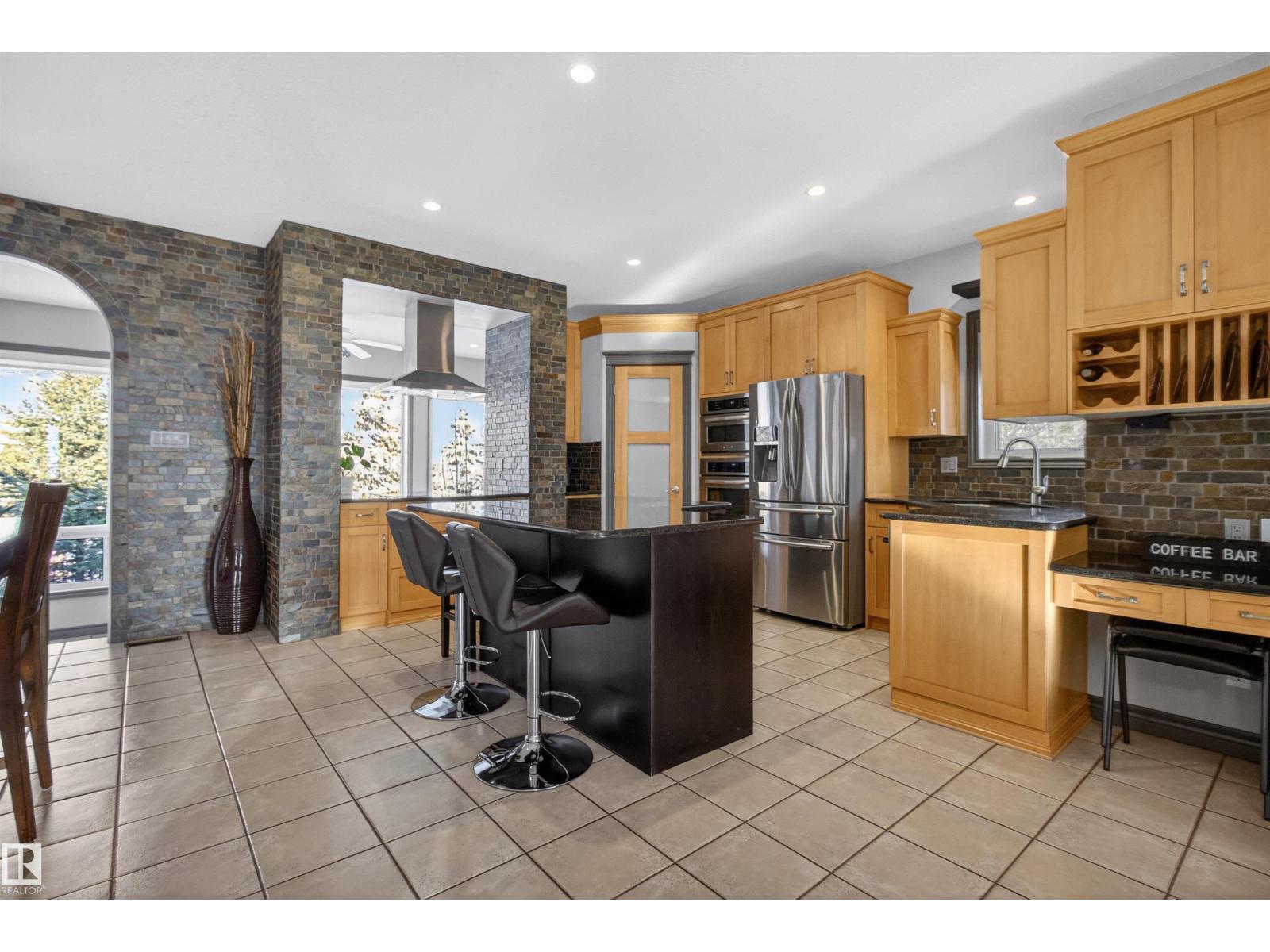 Stunning & unique executive 1.5 story on a huge pie lot backing west on the golf course! Enter the spacious foyer into an open great room boasting tall vaulted ceilings, hardwood & ceramic floors, abundant stone tile features, & stately fp surrounded by custom cabinets. Entertainer's dream with premium maple kitchen with granite counters, built-in appls, coffee bar, corner pantry & dark contrasting island. Private sunroom with heated tile floor & generous windows with amazing view of the 12th tee! Main floor laundry & full bath with tasteful claw-foot tub. Opulent owner's suite on the upper floor boasts 2nd fp, vaults, skylight & luxurious enuite with his & her vanities plus stone & tile dbl shower. F-fin bsmt has 4th bd, full bath, sauna, & huge FR with wet bar. Hi-eff furnace & cent AC. Recently prof painted, new carpet, & custom blinds. Exposed aggregate on driveway & covered patio. Serene & picturesque yard with underground sprinkler system, firepit & storage shed. Oversized garage with radiant heat. (id:63190)