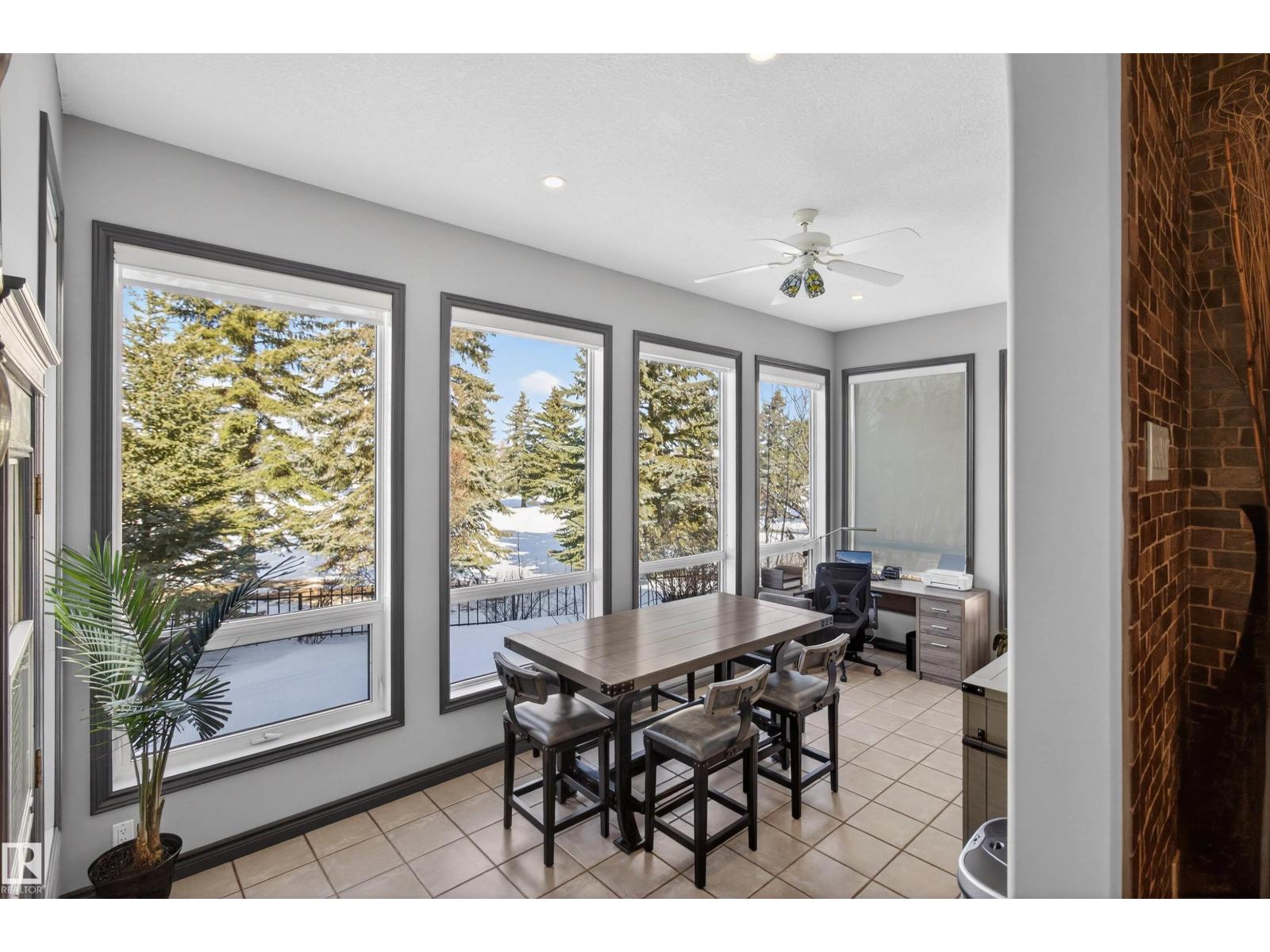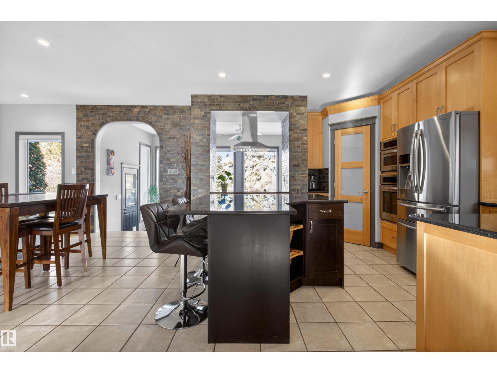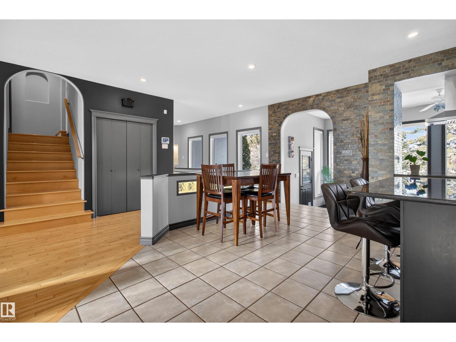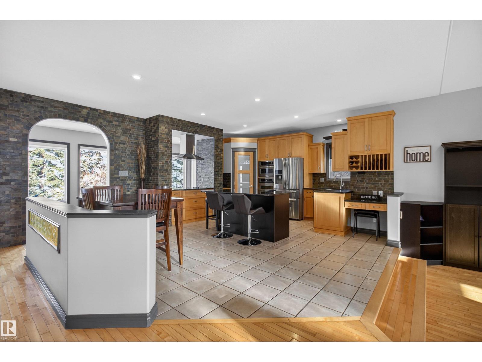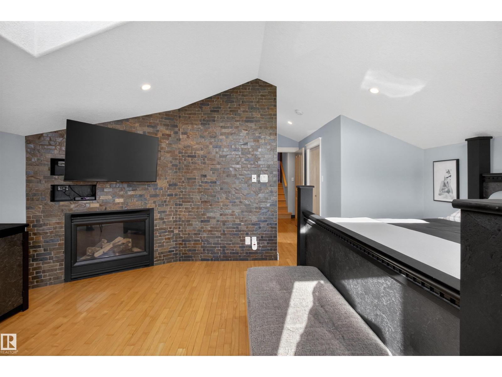 Stunning & unique executive 1.5 story on a huge pie lot backing west on the golf course! Enter the spacious foyer into an open great room boasting tall vaulted ceilings, hardwood & ceramic floors, abundant stone tile features, & stately fp surrounded by custom cabinets. Entertainer's dream with premium maple kitchen with granite counters, built-in appls, coffee bar, corner pantry & dark contrasting island. Private sunroom with heated tile floor & generous windows with amazing view of the 12th tee! Main floor laundry & full bath with tasteful claw-foot tub. Opulent owner's suite on the upper floor boasts 2nd fp, vaults, skylight & luxurious enuite with his & her vanities plus stone & tile dbl shower. F-fin bsmt has 4th bd, full bath, sauna, & huge FR with wet bar. Hi-eff furnace & cent AC. Recently prof painted, new carpet, & custom blinds. Exposed aggregate on driveway & covered patio. Serene & picturesque yard with underground sprinkler system, firepit & storage shed. Oversized garage with radiant heat. (id:63190)