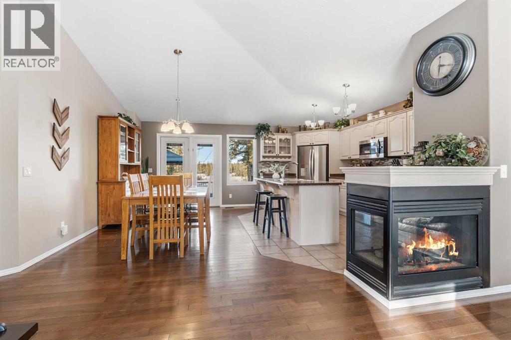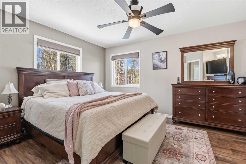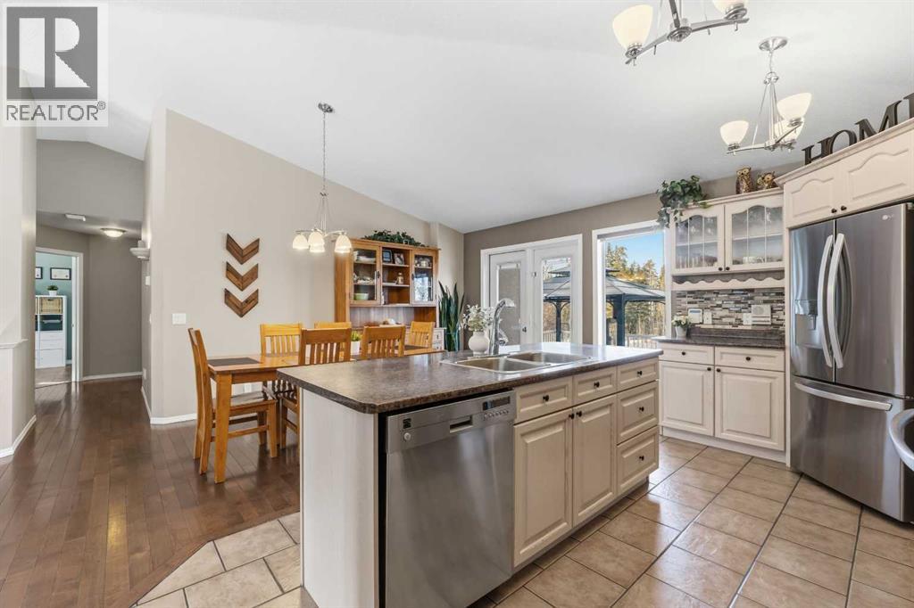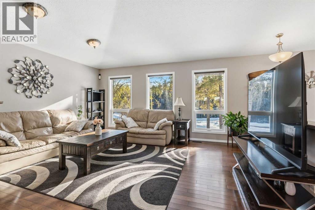 If you’ve been looking for that perfect balance of privacy and convenience, this 5.78-acre property in Pine Meadow Estates is going to check a lot of boxes. Located just a few minutes from Whitecourt and backing onto Crown land, it offers the quiet acreage life without the long commute.The heart of the home features a bright, open floor plan with tall ceilings and beautiful hardwood flooring stretching through the living and dining areas. The kitchen is built for real life, complete with an island, a walk-in pantry, and access to a back deck that is perfect for grilling. You can move in with peace of mind knowing the stainless fridge and stove are less than two years old. The main floor also hosts the primary suite, which serves as a spacious retreat with a large walk-in closet and a four-piece ensuite featuring a corner tub and separate shower. An additional bedroom, full guest bathroom, main floor laundry, and oversized coat and broom closets round out the main level.The lower level feels anything but like a basement, thanks to large windows and high ceilings. You’ll find three more large bedrooms and another full bathroom with extra space. The utility room is well maintained, with a hot water tank and pressure tank that are only about two years old, and central air conditioning installed approximately four years ago.The garage will be a favourite for watching the game or tinkering. The 34' wide by 26' deep detached garage has two man doors and 2 overhead entrances. It is heated with an overhead heater, fully painted, and comes equipped with benches, cabinets, and a floor drain. The driveway leading to the garage is paved, and there is ample additional gravel parking with room for an RV.The outdoor space is just as functional and serene. A private, covered front porch is tucked away behind mature pine trees, while the two-tiered back deck is fenced directly to the garage to create a great dog run. There is also a fire pit area. Two large sheds for extr a storage. Out back, you can explore the trees and a seasonal stream crossed by a cute bridge, some corrals, and a dugout, all with the privacy of having no neighbours behind you. (id:63190)