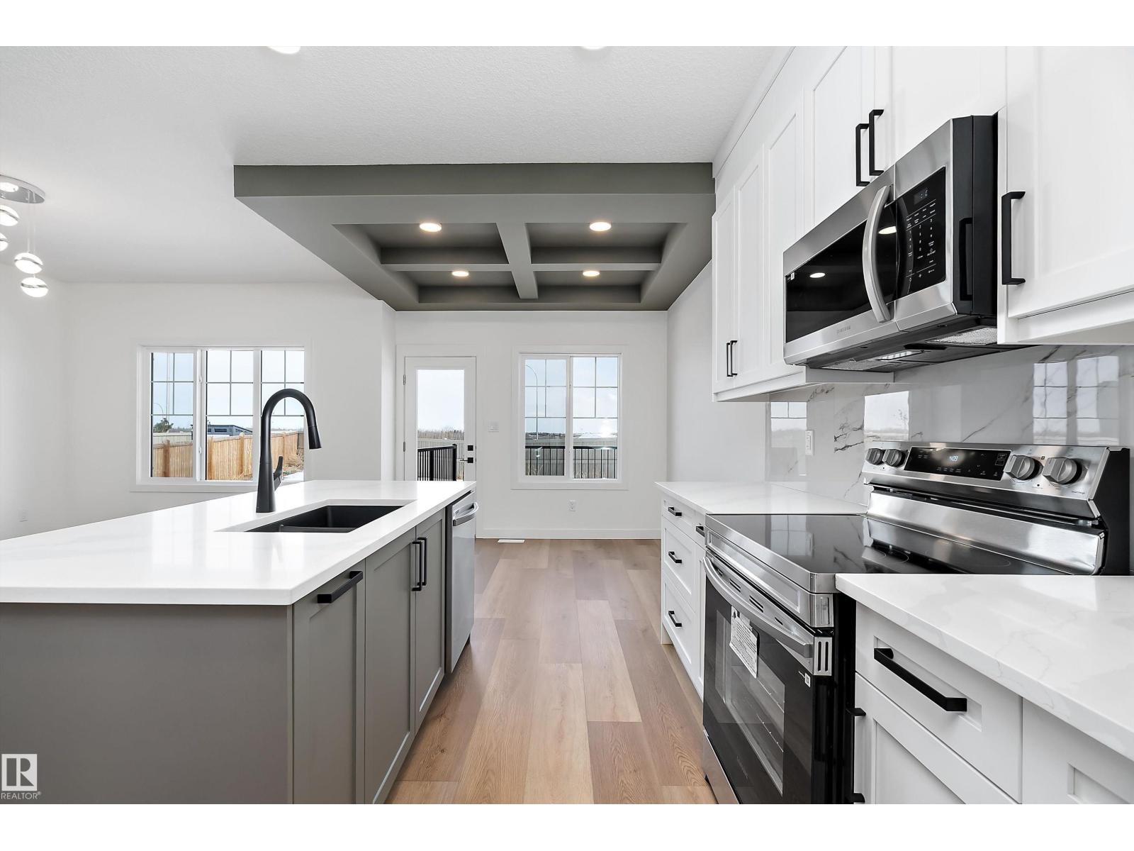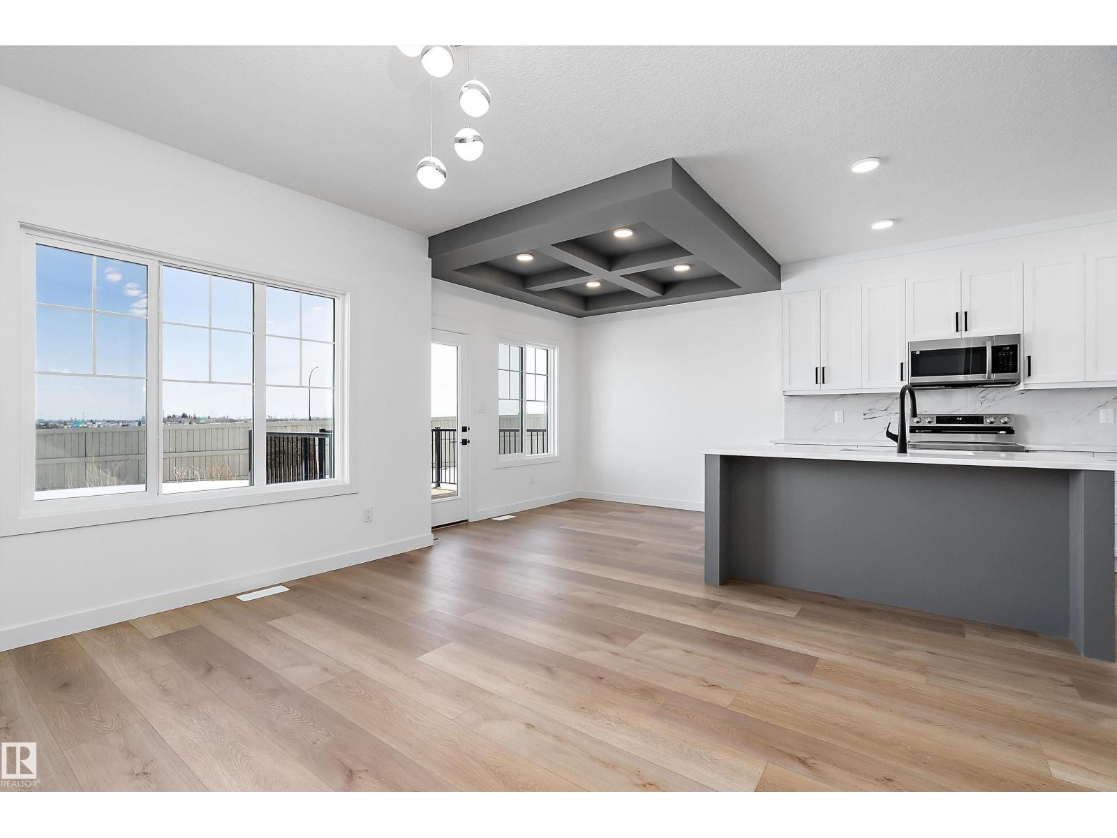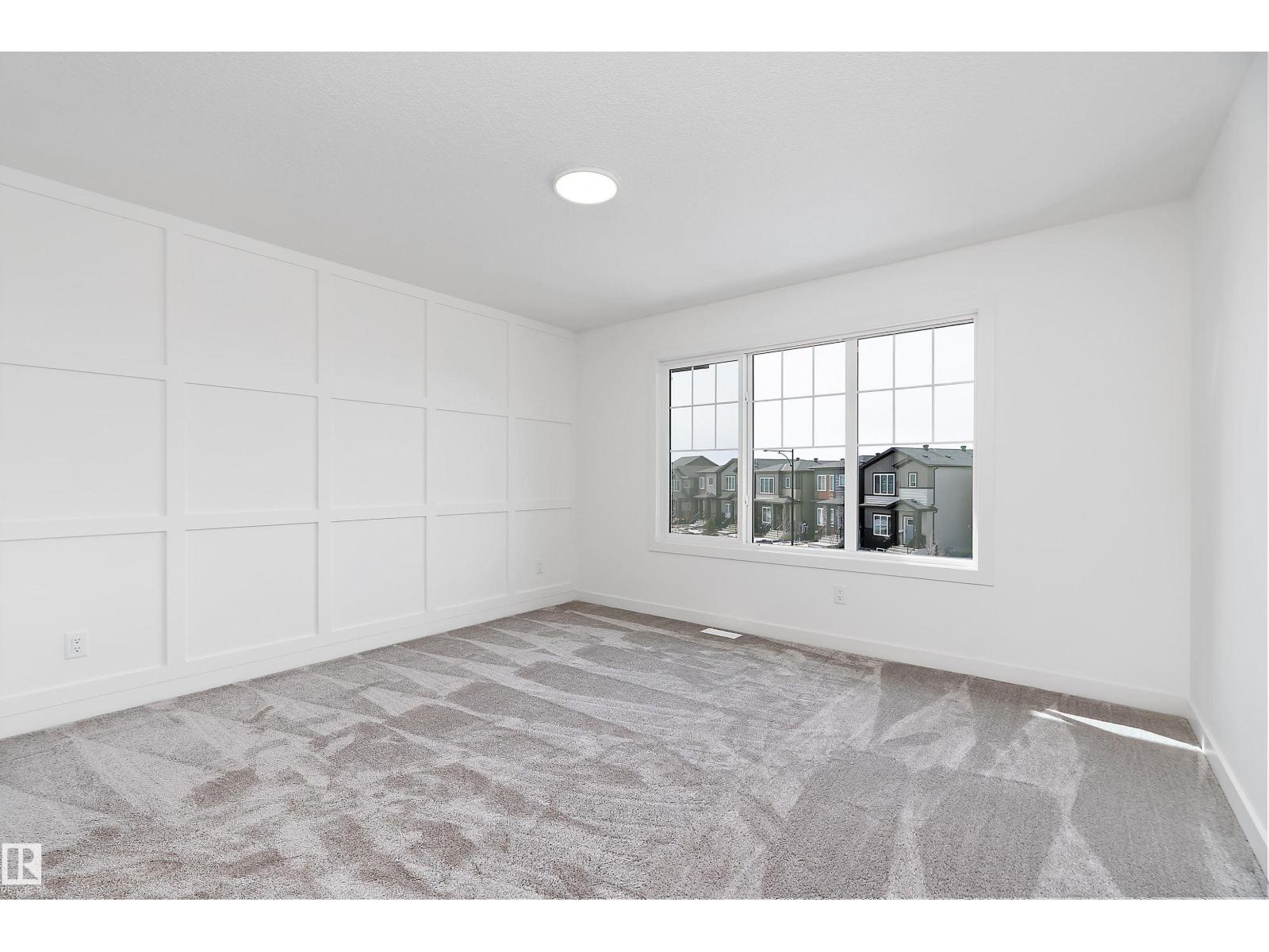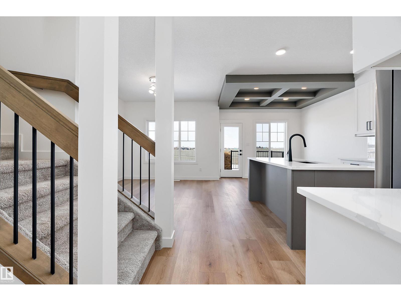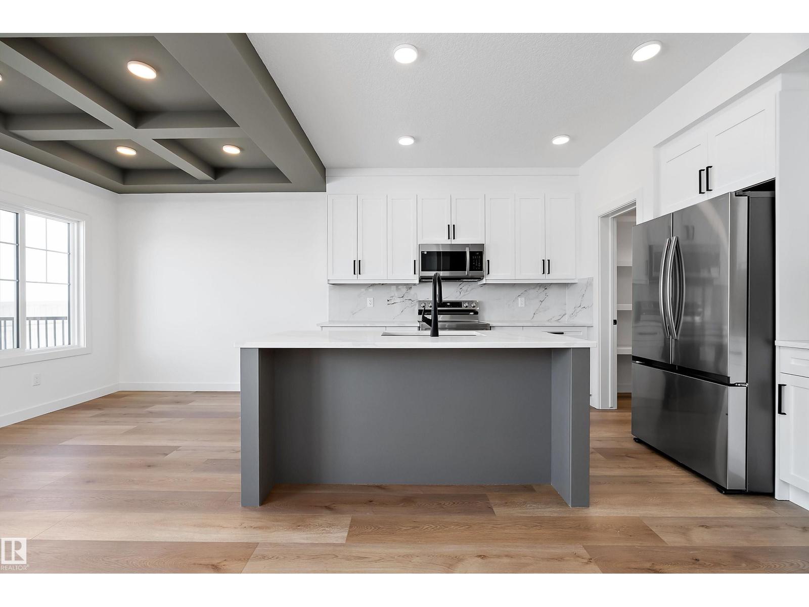 Welcome to this brand new 1809 SQFT Carlisle I model by award winning builder Blackstone Homes in Kinglet Gardens. Upon entry, you will be welcomed by spacious foyer and a main floor den, perfect for work from home days. The spacious great room offers electric fireplace with mdf finish, dining room with coffered ceiling, beautiful kitchen offering up to the ceiling soft closing cabinets, large island & walk-through pantry with mdf shelving. Main floor also has much needed mudroom with bench and shelves. The 2nd floor offers 3 large bedrooms, 2 baths, bonus room & laundry. Master bedroom is huge with beautiful en-suite & walk in closet. Other features - Double attached garage, Rear deck with metal railing, Separate entrance, 9' main/basement ceiling, MDF shelving, black plumbing fixtures, feature walls, upgraded quartz throughout, stainless steel appliances & New Home Warranty. Great location-close to Yellowhead and Anthony Henday, park, golf, shopping and all other amenities. (id:63190)